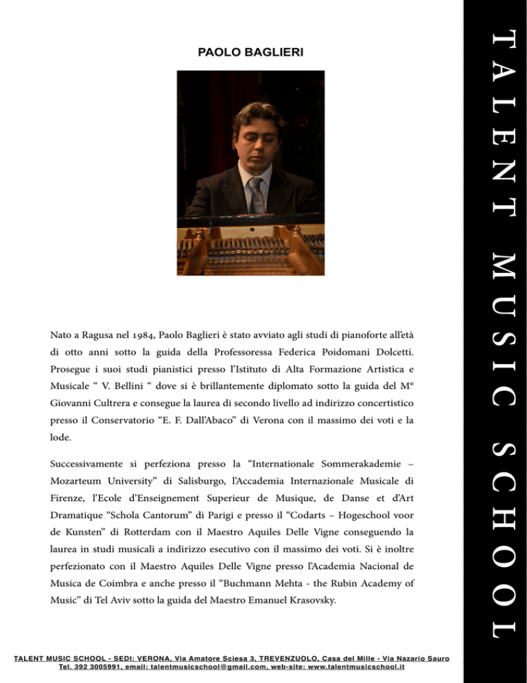 di otto anni sotto la guida della Professoressa Federica Poidomani Dolcetti. Prosegue i suoi studi pianistici presso l’Istituto di Alta Formazione Artistica e Musicale “ V. Bellini “ dove si è brillantemente diplomato sotto la guida del M° Giovanni Cultrera e consegue la laurea di secondo livello ad indirizzo concertistico M U S I C Nato a Ragusa nel 1984, Paolo Baglieri è stato avviato agli studi di pianoforte all’età TA L E N T PAOLO BAGLIERI presso il Conservatorio “E. F. Dall’Abaco” di Verona con il massimo dei voti e la Successivamente si perfeziona presso la “Internationale Sommerakademie – Mozarteum University” di Salisburgo, l’Accademia Internazionale Musicale di Firenze, l’Ecole d’Enseignement Superieur de Musique, de Danse et d’Art Dramatique “Schola Cantorum” di Parigi e presso il “Codarts – Hogeschool voor de Kunsten” di Rotterdam con il Maestro Aquiles Delle Vigne conseguendo la laurea in studi musicali a indirizzo esecutivo con il massimo dei voti. Si è inoltre perfezionato con il Maestro Aquiles Delle Vigne presso l’Academia Nacional de Musica de Coimbra e anche presso il “Buchmann Mehta - the Rubin Academy of Music” di Tel Aviv sotto la guida del Maestro Emanuel Krasovsky. TALENT MUSIC SCHOOL - SEDI: VERONA, Via Amatore Sciesa 3, TREVENZUOLO, Casa del Mille - Via Nazario Sauro Tel. 392 3005991, email: [email protected], web-site: www.talentmusicschool.it S C H O O L lode. Italia e all’ estero da rinomati docenti, nelle quali si è sempre distinto fra i migliori allievi vincendo numerose borse di studio e concerti premio, quali: Vincenzo Balzani, Dmitry Bashkirov, Gabriel Chodos, Victor Derevianko, Pavel Gililov, Benedetto Lupo, Sergio Perticaroli, Boris Petrushansky, Franco Scala, Vladimir Tropp, Tatiana Zelikman, Gabriel Kwok e András Schiff; Ha inoltre vinto oltre venti Concorsi di Interpretazione pianistica Nazionali e Internazionali. Paolo Baglieri svolge un’intensa attività concertistica che l’ha portato a esibirsi per oltre duecento concerti presso importanti sedi nazionali e internazionali: in Austria (Universitat Mozarteum e Wiener Saal di Salisburgo), Belgio (Steinway Academy di TA L E N T E’ stato allievo effettivo in masterclasses di interpretazione pianistica tenute in Bruxelles, Castel d’Ursel di Anversa), Cile (Conservatorio di Musica di Santiago del Cile), Francia (Schola Cantorum di Parigi), Israele (Teatro Nazionale di (Palazzo Educatorio della Provvidenza di Torino; Villa Diodoro di Taormina; Associazione A.Gi.Mus. di Roma; Palazzo Ducale e Centro Internazionale Cultura di Lucca; Palazzo dei Congressi di Milo; Unione Italiana Ciechi, Collegio Universitario d’ Aragona, Accademia Populorum Gymnasium, Circolo dell’Unione, Villa Cerami, Auto Yachting Club, Teatro Sangiorgi di Catania; Teatro Manzoni di Pistoia; Piazza Pola e Teatro Donnafugata di Ragusa; Villa Orchidea di Comiso; Auditorio San Domenico di Caltagirone; Palazzo della Cultura, Palazzo dei Mercedari e Teatro Garibaldi di Modica; Palazzo Grassi e Castello di Galeazza M U S I C Gerusalemme, Buchmann-Mehta Academy di Tel Aviv, Teatro di Haifa), Italia di Bologna; Teatro Moderno di Mascalucia; Palazzo Busacca e Palazzo Spadaro di Rotterdam), Portogallo (Teatro Nacional de Sao Carlos Lisbona, Teatro Académico Gil Vicente di Coimbra, Museu Nacional Soares do Reis di Porto) e Spagna (Polimusica di Madrid). Si è esibito in occasione della manifestazione “ Liberopalco “ organizzata dall’E.A.R. “Teatro Massimo Bellini“ esibendosi in veste solistica al Teatro Sangiorgi di Catania riscuotendo consensi unanimi da parte del pubblico presente e dalla stampa. Ha inoltre eseguito registrazioni per l’emittente televisiva Video Mediterraneo Sat. Recentemente ha inciso un CD presso il prestigioso “Videostudio - Medialab” del Mozarteum University di Salisburgo musiche di Beethoven, Mussorgsky e Ginastera, pubblicato dall’etichetta discografica EMA Records. TALENT MUSIC SCHOOL - SEDI: VERONA, Via Amatore Sciesa 3, TREVENZUOLO, Casa del Mille - Via Nazario Sauro Tel. 392 3005991, email: [email protected], web-site: www.talentmusicschool.it S C H O O L Scicli), Olanda (Museo d’Arte Moderna di Amsterdam, Università delle Arti di “University of Jerusalem – National Conservatory of Music” di Gerusalemme. Ha tenuto masterclass per l’Associazione Culturale Anfiteatro, la Jerusalem Society of Music e l’Università Cattolica Pontificia di Santiago del Cile. I suoi allievi si sono distinti in competizioni nazionali e internazionali come “Yasmeen Piano Competition” e “Magnificat Piano Competition” di Gerusalemme. È Direttore Artistico della Talent Music School di Verona e dell’Iblea International Music Academy di Modica. Attualmente ricopre l’incarico di docente di triennio universitario presso l’Istituto Superiore di Studi Musicali “Franco Vittadini” di Pavia. TA L E N T Paolo Baglieri ha ricoperto l’incarico di docente di Pianoforte Principale presso M U S I C S C H O O L TALENT MUSIC SCHOOL - SEDI: VERONA, Via Amatore Sciesa 3, TREVENZUOLO, Casa del Mille - Via Nazario Sauro Tel. 392 3005991, email: [email protected], web-site: www.talentmusicschool.it