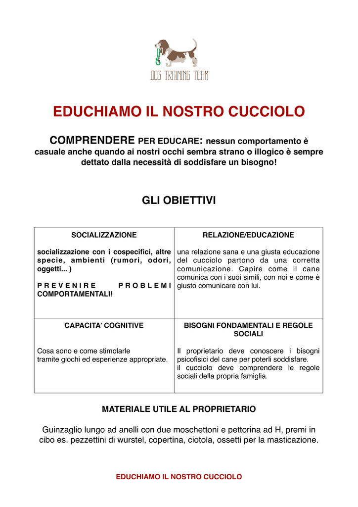 dog training team EDUCHIAMO IL NOSTRO CUCCIOLO COMPRENDERE PER EDUCARE: nessun comportamento è casuale anche quando ai nostri occhi sembra strano o illogico è sempre dettato dalla necessità di soddisfare un bisogno! GLI OBIETTIVI SOCIALIZZAZIONE RELAZIONE/EDUCAZIONE socializzazione con i cospecifici, altre una relazione sana e una giusta educazione specie, ambienti (rumori, odori, del cucciolo partono da una corretta oggetti... ) comunicazione. Capire come il cane comunica con i suoi simili, con noi e come è PREVENIRE P R O B L E M I giusto comunicare con lui. COMPORTAMENTALI! CAPACITA’ COGNITIVE Cosa sono e come stimolarle tramite giochi ed esperienze appropriate. BISOGNI FONDAMENTALI E REGOLE SOCIALI Il proprietario deve conoscere i bisogni psicofisici del cane per poterli soddisfare. il cucciolo deve comprendere le regole sociali della propria famiglia. MATERIALE UTILE AL PROPRIETARIO Guinzaglio lungo ad anelli con due moschettoni e pettorina ad H, premi in cibo es. pezzettini di wurstel, copertina, ciotola, ossetti per la masticazione. EDUCHIAMO IL NOSTRO CUCCIOLO dog training team IMPORTANZA DELL’ATTIVAZIONE EMOZIONALE RICORDA CHE COSA AUMENTA LO STATO DI ATTIVAZIONE EMOZIONALE : • NOVITA’ • MOVIMENTO • CONTATTI FISICI TIPO FRIZIONI, PACCHE, CAREZZE VELOCI • USO DI TONI DI VOCE ACUTI E RITMATI DIMINUISCE LO STATO DI ATTIVAZIONE EMOZIONALE : • PREVEDIBILITA’ E COERENZA • MOVIMENTI LENTI • USO DELLA VOCE CALMO CON TONI BASSI • CAREZZE LUNGO TUTTO IL CORPO • CIBO • RICERCA OLFATTIVA PER FAVORIRE L’APPRENDIMENTO DEL TUO CUCCIOLO DEVI SEMPRE AIUTARLO A TROVARE UNO STATO DI EQUILIBRIO, EVITARE GLI ECCESSI DI ECCITAZIONE E DI APATIA EDUCHIAMO IL NOSTRO CUCCIOLO dog training team SMACKING SOUND PASSO 1 • insegno al cane un suono neutro • quando il cane guarda lo premio • ripeto 5 volte PASSO 2 • emettere il suono • il cane si gira • spostarsi di un passo e premiare il cane • ripeto 5 volte PASSO 3 • emettere il suono • fare due passi verso destra • fare due passi verso sinistra e premiare il cane • ripeto 5 volte NELLE RIPETIZIONI FUTURE USARE ANCHE IL GUINZAGLIO EDUCHIAMO IL NOSTRO CUCCIOLO dog training team SE IL CUCCIOLO SI MOSTRA ANSIOSO O SPAVENTATO • mostrarsi sempre rilassati e tranquilli • NON prestare attenzione al comportamento del cucciolo, non cercare di consolarlo con bocconi o carezze o parole. • interporsi fisicamente tra il cucciolo e lo stimolo avverso • lodare e premiare il cucciolo solo se si mostra tranquillo • NON tirare il guinzaglio per obbligare il cucciolo ad andare in direzione dello stimolo avverso ma convincerlo a seguirci in una direzione alternativa descrivendo un semicerchio per arrivare gradualmente in prossimità dello stimolo premiando il cucciolo se mostra segni positivi. • se lo stimolo proposto lo spaventa possiamo fare qualche passo indietro e distrarre il cucciolo con del cibo o un gioco in quanto l’emozione positiva suscitata lo aiuterà nell’affrontare la paura. • proporre gli stimoli a distanze che favoriscano la buona riuscita dell’evento. EDUCHIAMO IL NOSTRO CUCCIOLO dog training team RINFORZI VS PUNIZIONI Quello che ai nostri occhi sembra una punizione potrebbe essere al contrario il rinforzo di un comportamento emesso dal cane! Ricordiamoci sempre che le nostre reazioni al comportamento del cane hanno una conseguenza sul suo apprendimento! PREMIO: carezze, lodi,(la nostra attenzione) giochi, cibo Tutte queste cose hanno un valore diverso per il nostro cane, è importante scoprirlo! SCALA DEI PREMI:__________________________ __________________________________________ __________________________________________ __________________________________________ PUNIZIONE: mancanza di attenzione, mancanza di contatto fisico, sottrazione di un oggetto. MAI utilizzare punizioni fisiche come le percosse! EDUCHIAMO IL NOSTRO CUCCIOLO dog training team PROMEMORIA GESTIONE AL GUINZAGLIO Le passeggiate del cucciolo devono essere brevi! L’esagerazione porta ad uno stato di stress! -indossare sempre la pettorina -se il cucciolo tira, ci si ferma -segnale di attenzione: smacking sound -ricorda l’importanza della tua postura -smacking sound ad ogni cambio di direzione Ricordati che il cucciolo ha dei tempi di concentrazione molto brevi! Serve tanta pazienza! EDUCHIAMO IL NOSTRO CUCCIOLO dog training team ARGOMENTI TRATTATI 1. la pettorina: perchè è importante, a cosa serve e come si indossa. 2. introduzione a premi/punizioni: cenni all’apprendimento e all’uso dei rinforzi o punizioni. 3. smacking sound : perchè serve e parte pratica. 4. bisogni fondamentali del cane : il movimento, il riposo, il gioco , la socializzazione..... ( scheda promemoria per la socializzazione) 5. gestione delle risorse: quali sono, valorizzarle e gestirle al meglio per essere un buon referente. L’ educazione alimentare, l’educazione a sporcare fuori,abitudini e orari fissi, luogo di riposo e gioco. 6. calma e autocontrollo: l’importanza del livello di attivazione emozionale. Cosa ne favorisce l’innalzamento e cosa ne favorisce l’abbassamento. parte pratica: la copertina, l’ingresso/uscita dalle porte 7. comunicazione: postura corretta e principali segnali calmanti del cane, manipolazione corretta, abitudine al tavolo del veterinario, museruola.... 8. il gioco: pallina tira e molla ma non solo.... 9. gestione al guinzaglio 10. il richiamo 10. segnali di controllo: seduto, terra, resta. EDUCHIAMO IL NOSTRO CUCCIOLO dog training team PROMEMORIA PER LA SOCIALIZZAZIONE AMBIENTALE COSPECIFICI ALTRE SPECIE ESSERI UMANI CAMMINARE cuccioli gatti donne sabbia adulti uccelli uomini ghiaia tutte le razze cavalli bambini 0-2 anni asfalto tutte le dimensioni conigli bambini 2-6 anni moquette bambini 6-13 anni legno STIMOLI SONORI PARTICOLARI MANIPOLAZIONE ragazzi erba phon testa anziani CITTA’ lavatrice orecchie PARTICOLARI automobili aspirapolvere bocca con occhiali tram trapano naso con cappello autobus 