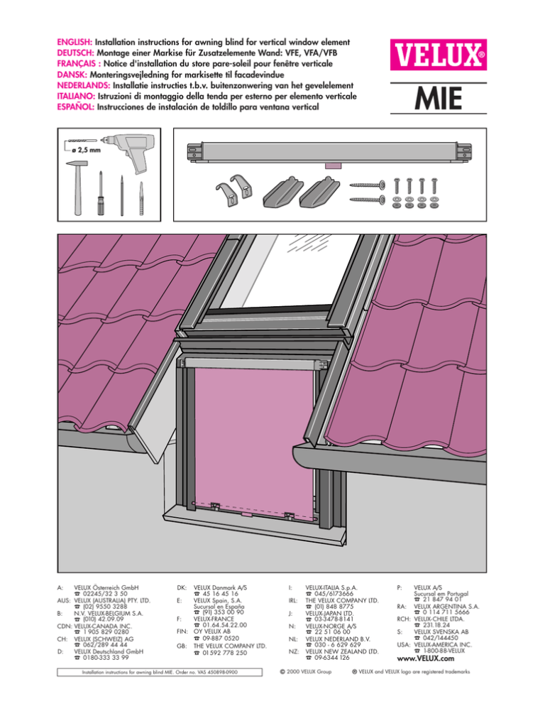 ENGLISH: Installation instructions for awning blind for vertical window element DEUTSCH: Montage einer Markise für Zusatzelemente Wand: VFE, VFA/VFB FRANÇAIS : Notice d'installation du store pare-soleil pour fenêtre verticale DANSK: Monteringsvejledning for markisette til facadevindue NEDERLANDS: Installatie instructies t.b.v. buitenzonwering van het gevelelement ITALIANO: Istruzioni di montaggio della tenda per esterno per elemento verticale ESPAÑOL: Instrucciones de instalación de toldillo para ventana vertical MIE ø 2,5 mm A: VELUX Österreich GmbH ☎ 02245/32 3 50 AUS: VELUX (AUSTRALIA) PTY. LTD. ☎ (02) 9550 3288 B: N.V. VELUX-BELGIUM S.A. ☎ (010) 42.09.09 CDN: VELUX-CANADA INC. ☎ 1 905 829 0280 CH: VELUX (SCHWEIZ) AG ☎ 062/289 44 44 D: VELUX Deutschland GmbH ☎ 0180-333 33 99 DK: I: E: IRL: VELUX Danmark A/S ☎ 45 16 45 16 VELUX Spain, S.A. Sucursal en España ☎ (91) 353 00 90 F: VELUX-FRANCE ☎ 01.64.54.22.00 FIN: OY VELUX AB ☎ 09-887 0520 GB: THE VELUX COMPANY LTD. ☎ 01592 778 250 Installation instructions for awning blind MIE. Order no. VAS 450898-0900 J: N: NL: NZ: VELUX-ITALIA S.p.A. 045/6173666 THE VELUX COMPANY LTD. ☎ (01) 848 8775 VELUX-JAPAN LTD. ☎ 03-3478-8141 VELUX-NORGE A/S ☎ 22 51 06 00 VELUX NEDERLAND B.V. ☎ 030 - 6 629 629 VELUX NEW ZEALAND LTD. ☎ 09-6344 126 ☎ © 2000 VELUX Group P: VELUX A/S Sucursal em Portugal ☎ 21 847 94 01 RA: VELUX ARGENTINA S.A. ☎ 0 114 711 5666 RCH: VELUX- CHILE LTDA. ☎ 231.18.24 S: VELUX SVENSKA AB ☎ 042/144450 USA: VELUX-AMERICA INC. ☎ 1-800-88-VELUX www.VELUX.com ® VELUX and VELUX logo are registered trademarks ENGLISH: The sash may be removed to simplify installation (see page 4). Fit plastic pieces with flat side against top cover in the top corners as shown. DEUTSCH: Zur Erleichterung der Montage kann der Flügel auch herausgenommen werden (siehe Seite 4). Kunststoffteile wie abgebildet mit der flachen Seite zum Abdeckkasten hin in den oberen Ecken montieren. FRANÇAIS : L'ouvrant peut être retiré pour faciliter la pose (se reporter à la page 4). Mettre les pièces plastiques dans les angles hauts, le côté plat contre le capot comme indiqué. DANSK: Rammen kan om nødvendigt tages ud for at lette monteringen (se s. 4). Plastbrikkerne monteres med den flade side mod topkassen i de øverste hjørner som vist. NEDERLANDS: Het draaiend gedeelte kan verwijderd worden om de montage te vereenvoudigen (zie pagina 4). Plaats zoals aangegeven de plastic hulpstukjes met de platte zijde tegen de afdekkap in beide bovenhoeken. ITALIANO: Il battente può essere tolto per semplificare il montaggio (vedere pag. 4). Inserire le plastiche fornite negli angoli superiori del telaio, con la parte piatta rivolta verso il rivestimento superiore. ESPAÑOL: La hoja puede desmontarse para simplificar la instalación (vea la página 4). Coloque las piezas de plástico en las esquinas, contra el perfil superior, como se indica. X X 1 2 3 4 ø = 2,5mm 20mm 2 ENGLISH: Place blind in the centre of the window as shown. Mark holes on both sides of blind with a pencil (1). Start holes with a centre punch (2) and drill through cover using 2.5 mm drill. Drilling depth = 20 mm (3). Place sealant supplied on exterior of covers. Fix awning blind with screws and washers supplied (4). DEUTSCH: Markise wie dargestellt mittig am Fenster montieren: An beiden Seiten der Markise die Bohrlöcher anzeichnen (1), Löcher mit einem Körner vorstechen (2) und mit einem 2,5 mm Bohrer durch das Abdeckblech hindurch aufbohren. Bohrtiefe = 20 mm (3). Dichtungen auf dem Abdeckblech anbringen und die Markise mit Schrauben plus Unterlegscheiben befestigen (4). FRANÇAIS : Placer le store à l'extérieur bien axé sur la fenêtre. Marquer au crayon les trous de vis de chaque côté (1). Prépercer les trous à l'aide d'un poinçon (2) et percer le capot avec un foret de 2,5 mm. Profondeur à percer = 20 mm (3). Placer les rondelles d'étanchéité sur le capot de la fenêtre du côté extérieur. Fixer le store à l'aide des vis et rondelles fournies (4). DANSK: Markisetten centreres over vinduet som vist. Huller opmærkes i begge sider af markisetten med blyant (1). Huller markeres med en kørner (2), og der bores gennem beklædningen med 2,5 mm bor. Boredybde = 20 mm (3). Medleveret pakning anbringes på den udvendige side af beklædningen. Markisetten skrues fast med de medleverede skruer og skiver (4). NEDERLANDS: Plaats de buitenzonwering in het midden van het venster zoals aangegeven. Teken de gaten in de bevestigingsbeugels van de buitenzonwering aan beide zijden met een potlood af (1). Prik de gaten voor met een priem (2) en boor door de afdeklijst met een 2,5 mm ø boor. Boordiepte = 20 mm (3). Plaats de afdichtingsringen op de lijsten aan de buiten zijde. Bevestig de buitenzonwering met de meegeleverde schroeven en ringen (4). ITALIANO: Posizionare la tenda al centro della finestra come illustrato. Segnare la posizione delle viti con una matita (1) e praticare i fori con un punteruolo (2). Forare il rivestimento con una punta da 2,5 mm (la profondità dei fori deve essere di 20 mm) (3). Mettere la guarnizione sulla parte esterna dei rivestimenti. Fissare la tenda con le viti e le rondelle fornite (4). ESPAÑOL: Coloque el toldillo centrado en la ventana. Marque la posición de los orificios de los extremos del toldillo (1). Inicie los orificios golpeando sobre un punzón (2) y taladre utilizando una broca de 2,5 mm. Profundidad del taladro = 20 mm (3). Coloque los selladores por el exterior de los perfiles. Fije el toldillo con los tornillos y las arandelas (4). ENGLISH: Fix hooks on the external horizontal window cover as shown. Mark holes with a pencil (1). Start holes with a centre punch (2) and drill through the cover using a 2.5 mm drill. Drilling depth = 30 mm (3). Fit hooks with screws (4). DEUTSCH: Haltekrallen wie abgebildet auf dem unteren waagerechten Abdeckblech befestigen: Bohrlöcher anzeichnen (1), Löcher mit einem K