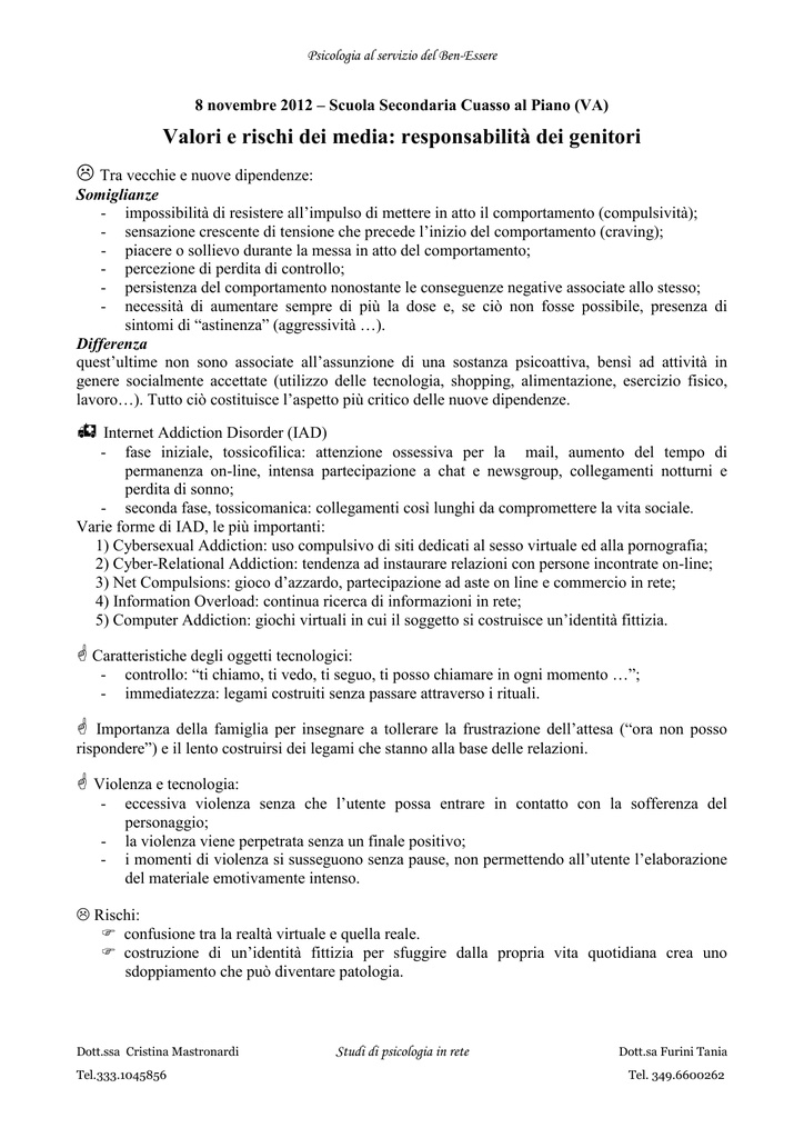 Psicologia al servizio del Ben-Essere 8 novembre 2012 – Scuola Secondaria Cuasso al Piano (VA) Valori e rischi dei media: responsabilità dei genitori Tra vecchie e nuove dipendenze: Somiglianze - impossibilità di resistere all’impulso di mettere in atto il comportamento (compulsività); - sensazione crescente di tensione che precede l’inizio del comportamento (craving); - piacere o sollievo durante la messa in atto del comportamento; - percezione di perdita di controllo; - persistenza del comportamento nonostante le conseguenze negative associate allo stesso; - necessità di aumentare sempre di più la dose e, se ciò non fosse possibile, presenza di sintomi di “astinenza” (aggressività …). Differenza quest’ultime non sono associate all’assunzione di una sostanza psicoattiva, bensì ad attività in genere socialmente accettate (utilizzo delle tecnologia, shopping, alimentazione, esercizio fisico, lavoro…). Tutto ciò costituisce l’aspetto più critico delle nuove dipendenze. Internet Addiction Disorder (IAD) - fase iniziale, tossicofilica: attenzione ossessiva per la mail, aumento del tempo di permanenza on-line, intensa partecipazione a chat e newsgroup, collegamenti notturni e perdita di sonno; - seconda fase, tossicomanica: collegamenti così lunghi da compromettere la vita sociale. Varie forme di IAD, le più importanti: 1) Cybersexual Addiction: uso compulsivo di siti dedicati al sesso virtuale ed alla pornografia; 2) Cyber-Relational Addiction: tendenza ad instaurare relazioni con persone incontrate on-line; 3) Net Compulsions: gioco d’azzardo, partecipazione ad aste on line e commercio in rete; 4) Information Overload: continua ricerca di informazioni in rete; 5) Computer Addiction: giochi virtuali in cui il soggetto si costruisce un’identità fittizia. Caratteristiche degli oggetti tecnologici: - controllo: “ti chiamo, ti vedo, ti seguo, ti posso chiamare in ogni momento …”; immediatezza: legami costruiti senza passare attraverso i rituali. Importanza della famiglia per insegnare a tollerare la frustrazione dell’attesa (“ora non posso rispondere”) e il lento costruirsi dei legami che stanno alla base delle relazioni. Violenza e tecnologia: - eccessiva violenza senza che l’utente possa entrare in contatto con la sofferenza del personaggio; la violenza viene perpetrata senza un finale positivo; i momenti di violenza si susseguono senza pause, non permettendo all’utente l’elaborazione del materiale emotivamente intenso. Rischi: confusione tra la realtà virtuale e quella reale. costruzione di un’identità fittizia per sfuggire dalla propria vita quotidiana crea uno sdoppiamento che può diventare patologia. Dott.ssa Cristina Mastronardi Tel.333.1045856 Studi di psicologia in rete Dott.sa Furini Tania Tel. 349.6600262 Psicologia al servizio del Ben-Essere Bibliografia Adolescenti e nuove dipendenze. Le basi teoriche, i fattori di rischio, la prevenzione A. Couyoumdjan, R. Baiocco, C. Del Miglio, La Terza Editore, 2006 Il (nuovo) bambino che addomesticò il televisore A. Pellai, Franco Angeli Editore, 2001 Teen television. Gli adolescenti davanti e dentro la tv A. Pellai, Franco Angeli Editore, 1999 L’immaginario prigioniero. Come educare i nostri figli a un uso creativo e responsabile delle nuove tecnologie M. R. Parsi, T. Cantelmi, F. Orlando, Arnoldo Mondadori Editore, 2009 Minori in rete. Come proteggerli dai pericoli del web R. Laurita, Mondadori Informatica, 2004 Filmografia Per bambini: Bolt - Un eroe a quattro zampe Un film di Chris Williams, Byron Howard. Animazione, durata 96 min. - USA 2008. - Walt Disney WALL•E diretto da Andrew Stanton Pixar Animation Studios in coproduzione con Walt Disney Pictures, 2008 Per adulti: The Truman Show Un film di Peter Weir. Con Jim Carrey, Laura Linney, Noah Emmerich, Natascha McElhone, Brian Delate. Fantastico, durata 102 min. - USA 1998. Sitografia Consigli per genitori www.noncaderenellarete.it www.ioproteggoibambini.it Antivirus gratuiti Avast! Free Antivirus: http://www.avast.com AVG Free: http://free.avg.com Firewalls gratuity Zone Alarm Basic Firewall: http://download.cnet.com/ZoneAlarm/3000-10435_4-10039884.html?part=dl69168&subj=dl&tag=button Comodo (possibilità di installare solo il firewall, solo l'antivirus, o entrambi): http://personalfirewall.comodo.com/free-download.html Software di Parental Control gratuito K9 Web Protection: http://www1.k9webprotection.com/ Dott.ssa Cristina Mastronardi Tel.333.1045856 Studi di psicologia in rete Dott.sa Furini Tania Tel. 349.6600262