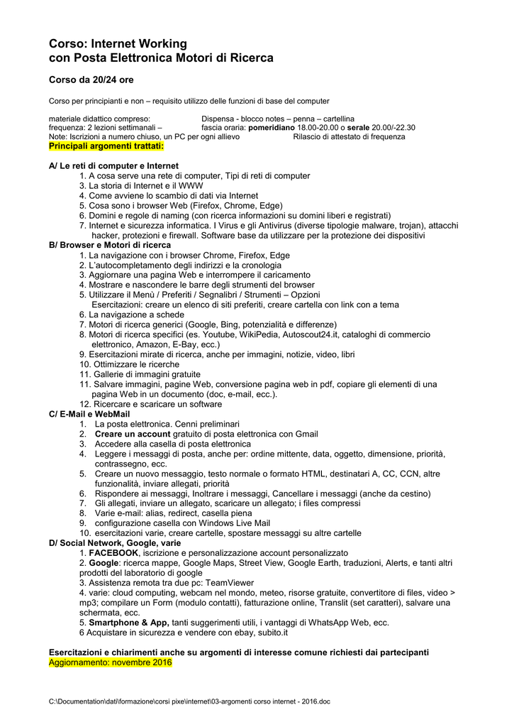 Corso: Internet Working con Posta Elettronica Motori di Ricerca Corso da 20/24 ore Corso per principianti e non – requisito utilizzo delle funzioni di base del computer materiale didattico compreso: Dispensa - blocco notes – penna – cartellina frequenza: 2 lezioni settimanali – fascia oraria: pomeridiano 18.00-20.00 o serale 20.00/-22.30 Note: Iscrizioni a numero chiuso, un PC per ogni allievo Rilascio di attestato di frequenza Principali argomenti trattati: A/ Le reti di computer e Internet 1. A cosa serve una rete di computer, Tipi di reti di computer 3. La storia di Internet e il WWW 4. Come avviene lo scambio di dati via Internet 5. Cosa sono i browser Web (Firefox, Chrome, Edge) 6. Domini e regole di naming (con ricerca informazioni su domini liberi e registrati) 7. Internet e sicurezza informatica. I Virus e gli Antivirus (diverse tipologie malware, trojan), attacchi hacker, protezioni e firewall. Software base da utilizzare per la protezione dei dispositivi B/ Browser e Motori di ricerca 1. La navigazione con i browser Chrome, Firefox, Edge 2. L’autocompletamento degli indirizzi e la cronologia 3. Aggiornare una pagina Web e interrompere il caricamento 4. Mostrare e nascondere le barre degli strumenti del browser 5. Utilizzare il Menù / Preferiti / Segnalibri / Strumenti – Opzioni Esercitazioni: creare un elenco di siti preferiti, creare cartella con link con a tema 6. La navigazione a schede 7. Motori di ricerca generici (Google, Bing, potenzialità e differenze) 8. Motori di ricerca specifici (es. Youtube, WikiPedia, Autoscout24.it, cataloghi di commercio elettronico, Amazon, E-Bay, ecc.) 9. Esercitazioni mirate di ricerca, anche per immagini, notizie, video, libri 10. Ottimizzare le ricerche 11. Gallerie di immagini gratuite 11. Salvare immagini, pagine Web, conversione pagina web in pdf, copiare gli elementi di una pagina Web in un documento (doc, e-mail, ecc.). 12. Ricercare e scaricare un software C/ E-Mail e WebMail 1. La posta elettronica. Cenni preliminari 2. Creare un account gratuito di posta elettronica con Gmail 3. Accedere alla casella di posta elettronica 4. Leggere i messaggi di posta, anche per: ordine mittente, data, oggetto, dimensione, priorità, contrassegno, ecc. 5. Creare un nuovo messaggio, testo normale o formato HTML, destinatari A, CC, CCN, altre funzionalità, inviare allegati, priorità 6. Rispondere ai messaggi, Inoltrare i messaggi, Cancellare i messaggi (anche da cestino) 7. Gli allegati, inviare un allegato, scaricare un allegato; i files compressi 8. Varie e-mail: alias, redirect, casella piena 9. configurazione casella con Windows Live Mail 10. esercitazioni varie, creare cartelle, spostare messaggi su altre cartelle D/ Social Network, Google, varie 1. FACEBOOK, iscrizione e personalizzazione account personalizzato 2. Google: ricerca mappe, Google Maps, Street View, Google Earth, traduzioni, Alerts, e tanti altri prodotti del laboratorio di google 3. Assistenza remota tra due pc: TeamViewer 4. varie: cloud computing, webcam nel mondo, meteo, risorse gratuite, convertitore di files, video > mp3; compilare un Form (modulo contatti), fatturazione online, Translit (set caratteri), salvare una schermata, ecc. 5. Smartphone & App, tanti suggerimenti utili, i vantaggi di WhatsApp Web, ecc. 6 Acquistare in sicurezza e vendere con ebay, subito.it Esercitazioni e chiarimenti anche su argomenti di interesse comune richiesti dai partecipanti Aggiornamento: novembre 2016 C:\Documentation\dati\formazione\corsi pixe\internet\03-argomenti corso internet - 2016.doc