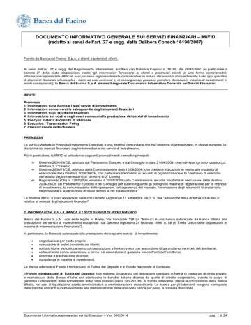 DOCUMENTO INFORMATIVO GENERALE SUI SERVIZI FINANZIARI – MiFID (redatto ai sensi dell’art. 27 e segg. della Delibera Consob 16190/2007) Fornito da Banca del Fucino S.p.A. a clienti e potenziali clienti. Ai sensi dell’art. 27 e segg. del Regolamento Intermediari, adottato con Delibera Consob n. 16190, del 29/10/2007 (in particolare il comma 2° della citata disposizione recita “gli intermediari forniscono ai clienti o potenziali clienti, in una forma comprensibili, informazioni appropriate affinché essi possano ragionevolmente comprendere la natura del servizio di investimento e del tipo specifico di strumenti finanziari interessati e i rischi ad essi connessi e, di conseguenza, possano prendere decisioni in materia di investimenti in modo consapevole), la Banca del Fucino S.p.A. emana il seguente Documento Informativo Generale sui Servizi Finanziari. INDICE: Premessa 1. Informazioni sulla Banca e i suoi servizi di investimento 2. Informazioni concernenti la salvaguardia degli strumenti finanziari 3. Informazioni sugli strumenti finanziari 4. Informazione sui costi e sugli oneri connessi alla prestazione dei servizi di investimento 5. Policy in materia di conflitti di interesse 6. Execution / Transmission Policy 7. Classificazione della clientela PREMESSA La MiFID (Markets in Financial Instruments Directive) è una direttiva comunitaria che ha l’obiettivo di armonizzare, in chiave europea, la disciplina dei mercati finanziari, degli intermediari e dei servizi di investimento. Più in particolare, la MiFID si articola nei seguenti provvedimenti normativi principali: Direttiva 2004/39/CE, adottata dal Parlamento Europeo e dal Consiglio in data 21/04/2004, che individua i principi quadro (cd. direttiva di 1° Livello) Direttiva 2006/73/CE, adottata dalla Commissione in data 10/08/2006, che contiene indicazioni in merito alle modalità di esecuzione della Direttiva 2004/39/CE, con particolare riferimento ai requisiti di organizzazione e le condizioni di esercizio dell’attività degli intermediari (cd. direttiva di 2° Livello) Regolamento (CE) n. 1287/2006, emanato il 10/08/2006 dalla Commissione, recante “modalità di esecuzione della direttiva 2004/39/CE del Parlamento Europeo e del Consiglio per quanto riguarda gli obblighi in materia di registrazione per le imprese di investimento, la comunicazione delle operazioni, la trasparenza del mercato, l’ammissione degli strumenti finanziari alla negoziazione e la definizione di taluni termini ai fini di tale direttiva” La direttiva MiFID è stata recepita in Italia con Decreto Legislativo 17 settembre 2007, n. 164 “Attuazione della direttiva 2004/39/CE relativa ai mercati degli strumenti finanziari”. 1. INFORMAZIONI SULLA BANCA E I SUOI SERVIZI DI INVESTIMENTO Banca del Fucino S.p.A, con sede legale in Roma, Via Tomacelli 139 (la “Banca”) è una banca autorizzata da Banca d’Italia alla prestazione dei servizi di investimento disciplinati dal Decreto legislativo 24 febbraio 1998, n. 58 (il “Testo Unico delle disposizioni in materia di intermediazione finanziaria”). In particolare, la Banca è autorizzata alla prestazione dei seguenti servizi di investimento: negoziazione per conto proprio; esecuzione di ordini per conto dei clienti; sottoscrizione e/o collocamento con assunzione a fermo ovvero con assunzione di garanzia nei confronti dell’emittente; collocamento senza assunzione a fermo né assunzione di garanzia nei confronti dell’emittente; ricezione e trasmissione di ordini; consulenza in materia di investimenti. La Banca aderisce al Fondo Interbancario di Tutela dei Depositi e al Fondo Nazionale di Garanzia. Il Fondo Interbancario di Tutela dei Depositi è un sistema di garanzia dei depositanti costituito in forma di consorzio di diritto privato, e riconosciuto dalla Banca d’Italia, cui aderiscono le banche italiane diverse da quelle di credito cooperativo, avente lo scopo di garantire i depositanti delle consorziate entro limiti previsti (euro 103.291,38). Il Fondo interviene, previa autorizzazione della Banca d’Italia, nei casi di liquidazione coatta amministrativa e amministrazione straordinaria. Le risorse per gli interventi vengono corrisposte dalle banche aderenti successivamente alla manifestazione della crisi della banca (ex post), a richiesta del Fondo. Documento informativo generale sui servizi finanziari – Ver. 006/2014 pag. 1 di 24 Il Fondo Nazionale di Garanzia, istituito dall’art. 15 della legge 2 gennaio 1991, n. 1, ha personalità giuridica di diritto privato e autonomia patrimoniale ai sensi dell’art. 2, comma 1, della legge 27 ottobre 1994, n. 598 e dell’art. 62, comma 1, del decreto legislativo 23 luglio 1996, n. 415. Il Fondo è riconosciuto “sistema di indennizzo” dall’art. 62, comma 1, del decreto legislativo 23 luglio 1996, n. 415. L’organizzazione e il funzionamento del Fondo sono disciplinati dal proprio Statuto. Gli interventi istituzionali sono disciplinati dal “Regolamento operativo” previsto dall’art. 12, comma 1, del decreto del Ministro del tesoro 14 novembre 1997, n. 485. Il Fondo indennizza gli investitori, secondo i criteri previsti dal citato decreto del Ministero del Tesoro ed entro il limite massimo complessivo per ciascun investitore di 20.000 euro, per i crediti, rappresentati da strumenti finanziari e/o da denaro connesso con operazioni di investimento, nei confronti degli intermediari aderenti al Fondo stesso derivanti dalla prestazione dei servizi di investimento e del servizio di custodia e amministrazione di strumenti finanziari, in quanto accessorio ad operazioni di investimento. Il Fondo indennizza i crediti degli investitori nei casi di liquidazione coatta amministrativa, fallimento o di concordato preventivo. Comunicazioni Le comunicazioni di qualsiasi genere del cliente alla Banca connesse alla prestazione dei servizi di investimento vanno fatte pervenire ad una qualsiasi delle Filiali presso la quale sono aperti i rapporti sui quali 