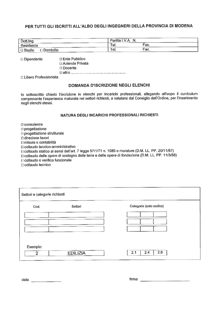 Domanda di iscrizione negli elenchi per incarichi
