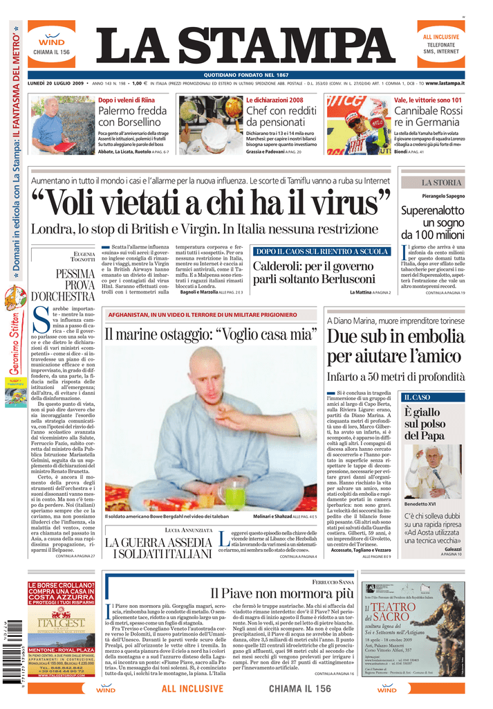 . * Domani in edicola con La Stampa: IL FANTASMA DEL METRO’ * W LA STAMPA QUOTIDIANO FONDATO NEL 1867 LUNEDÌ 20 LUGLIO 2009 • ANNO 143 N. 198 • 1,00 € IN ITALIA (PREZZI PROMOZIONALI ED ESTERO IN ULTIMA) SPEDIZIONE ABB. POSTALE - D.L. 353/03 (CONV. IN L. 27/02/04) ART. 1 COMMA 1, DCB - TO www.lastampa.it Dopo i veleni di Riina Le dichiarazioni 2008 Vale, le vittorie sono 101 Palermo fredda con Borsellino Chef con redditi da pensionati Cannibale Rossi re in Germania Poca gente all’anniversario della strage Assenti le istituzioni, polemici i fratelli Su tutto aleggiano le parole del boss Dichiarano tra i 13 e i 14 mila euro Marchesi: per capire i nostri bilanci bisogna sapere quanto investiamo La stella della Yamaha beffa in volata il giovane compagno di squadra Lorenzo «Sbaglia a credersi già più forte di me» Abbate, La Licata, Ruotolo A PAG. 6-7 Grassia e Padovani A PAG. 20 Biondi A PAG. 41 Aumentano in tutto il mondo i casi e l’allarme per la nuova influenza. Le scorte di Tamiflu vanno a ruba su Internet “Voli vietati a chi ha il virus” Londra, lo stop di British e Virgin. In Italia nessuna restrizione Scatta l’allarme influenza «suina» sui voli aerei: il governo inglese consiglia di rimandare i viaggi, mentre la Virgin e la British Airways hanno emanato un divieto di imbarco per i contagiati dal virus H1n1. Saranno effettuati controlli con i termometri sulla I EUGENIA TOGNOTTI PESSIMA PROVA D’ORCHESTRA S arebbe importante - mentre la nuova influenza cammina a passo di carica - che il governo parlasse con una sola voce e che dietro le dichiarazioni di vari ministri «competenti» - come si dice - si intravedesse un piano di comunicazione efficace e non improvvisato, in grado di diffondere, da una parte, la fiducia nella risposta delle istituzioni all’emergenza; dall’altra, di evitare i danni della disinformazione. Da questo punto di vista, non si può dire davvero che sia incoraggiante l’esordio nella strategia comunicativa, con l’ipotesi del rinvio dell’anno scolastico avanzata dal viceministro alla Salute, Ferruccio Fazio, subito corretta dal ministro della Pubblica Istruzione Mariastella Gelmini, seguita da un supplemento di dichiarazioni del ministro Renato Brunetta. Certo, è ancora il momento della prova degli strumenti dell’orchestra e i suoni dissonanti vanno messi in conto. Ma non c’è tempo da perdere. Noi (italiani) speriamo sempre che ce la caviamo, ma non possiamo illuderci che l’influenza, «la malattia del vento», come era chiamata nel passato in Asia, a causa della sua rapidissima propagazione, risparmi il Belpaese. CONTINUA A PAGINA 27 temperatura corporea e fermati tutti i «sospetti». Per ora nessuna restrizione in Italia, mentre su Internet è caccia ai farmici antivirali, come il Tamiflu. E a Malpensa sono rientrati i ragazzi italiani rimasti bloccati a Londra. DOPO IL CAOS SUL RIENTRO A SCUOLA Calderoli: per il governo parli soltanto Berlusconi Bagnoli e Marzolla ALLE PAG. 2 E 3 La Mattina A PAGINA 2 AFGHANISTAN, IN UN VIDEO IL TERRORE DI UN MILITARE PRIGIONIERO LA STORIA Pierangelo Sapegno Superenalotto un sogno da 100 milioni I l giorno che arriva è una sinfonia da cento milioni: per questo domani tutta l’Italia, dopo aver sfilato nelle tabaccherie per giocarsi i numeri del Superenalotto, aspetterà l’estrazione che vale un altro montepremi record. CONTINUA A PAGINA 19 A Diano Marina, muore imprenditore torinese Il marine ostaggio: “Voglio casa mia” Due sub in embolia per aiutare l’amico Infarto a 50 metri di profondità Si è conclusa in tragedia l’immersione di un gruppo di amici al largo di Capo Berta, sulla Riviera Ligure: erano, partiti da Diano Marina. A cinquanta metri di profondità uno di loro, Marco Gilberti, ha avuto un infarto, si è scomposto, è apparso in difficoltà agli altri. I compagni di discesa allora hanno cercato di soccorrerlo e l’hanno portato in superficie senza rispettare le tappe di decompressione, necessarie per evitare gravi danni all’organismo. Hanno rischiato la vita per salvare un amico, sono stati colpiti da embolia e rapidamente portati in camera iperbarica: non sono gravi. La velocità dei soccorsi ha impedito che il bilancio fosse più pesante. Gli altri sub sono stati poi salvati dalla Guardia costiera. Gilberti, 59 anni, è un imprenditore di Givoletto, un centro del Torinese. I Il soldato americano Bowe Bergdahl nel video dei taleban LUCIA ANNUNZIATA LA GUERRA ASSEDIA I SOLDATI ITALIANI Molinari e Shahzad ALLE PAG. 4 E 5 L eggerei questo episodio nella chiave delle vicende interne al Libano: che Hezbollah stia lavorando da vari mesi a un sistematico riarmo, mi sembra nello stato delle cose». Accossato, Tagliano e Vezzaro CONTINUA A PAGINA 4 FERRUCCIO SANSA Il Piave non mormora più I l Piave non mormora più. Gorgoglia magari, scroscia, rimbomba lungo le condotte di metallo. O semplicemente tace, ridotto a un rigagnolo largo un paio di metri, spesso come un foglio di stagnola. Fra Treviso e Conegliano Veneto l’autostrada corre verso le Dolomiti, il nuovo patrimonio dell’Umanità dell’Unesco. Davanti le pareti verde scuro delle Prealpi, poi all’orizzonte le vette oltre i tremila. In mezzo a questa pianura dove il cielo a nord ha i colori della montagna e a sud l’azzurro disteso della Laguna, si incontra un ponte: «Fiume Piave, sacro alla Patria». Un messaggio dai toni solenni. Sì, è cominciato tutto da qui, i solchi tra le montagne, la piana. L’Italia che fermò le truppe austriache. Ma chi si affaccia dal viadotto rimane interdetto: dov’è il Piave? Nel periodo di magra di inizio agosto il fiume è ridotto a un torrente. Non lo vedi, si perde nel letto di pietre bianche. Negli anni di siccità scompare. Ma non è colpa delle precipitazioni, il Piave di acqua ne avrebbe in abbondanza, oltre 3,5 miliardi di metri cubi l’anno. Il punto sono quelle 121 centrali idroelettriche che gli prosciugano gli affluenti, quei 98 metri cubi al secondo che nei