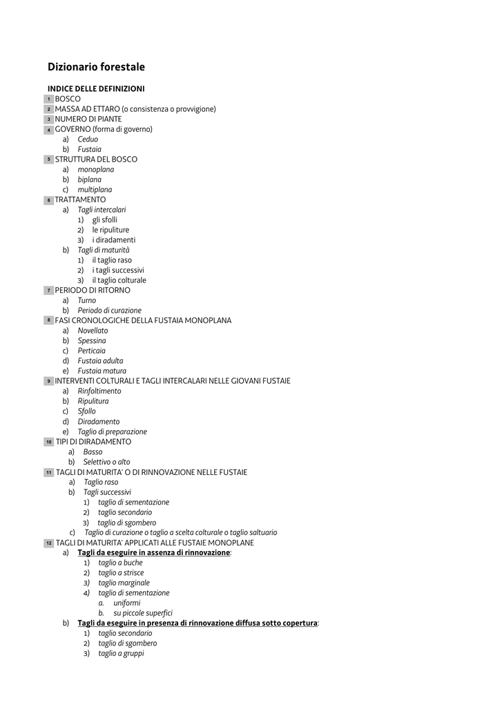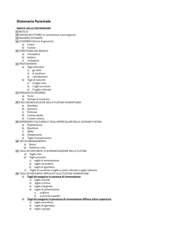 Dizionario forestale INDICE DELLE DEFINIZIONI 1 BOSCO 1. 2 MASSA AD ETTARO (o consistenza o provvigione) 2. 3 NUMERO DI PIANTE 3. 4. 4 GOVERNO (forma di governo) a) Ceduo b) Fustaia 5 STRUTTURA DEL BOSCO 5. a) monoplana b) biplana c) multiplana 6 TRATTAMENTO 6. a) Tagli intercalari 1) gli sfolli 2) le ripuliture 3) i diradamenti b) Tagli di maturità 1) il taglio raso 2) i tagli successivi 3) il taglio colturale 7 PERIODO DI RITORNO 7. a) Turno b) Periodo di curazione 8 FASI CRONOLOGICHE DELLA FUSTAIA MONOPLANA 8. a) Novellato b) Spessina c) Perticaia d) Fustaia adulta e) Fustaia matura 9 INTERVENTI COLTURALI E TAGLI INTERCALARI NELLE GIOVANI FUSTAIE 9. a) Rinfoltimento b) Ripulitura c) Sfollo d) Diradamento e) Taglio di preparazione 10 TIPI DI DIRADAMENTO 10. a) Basso b) Selettivo o alto 11 TAGLI DI MATURITA’ O DI RINNOVAZIONE NELLE FUSTAIE 11. a) Taglio raso b) Tagli successivi 1) taglio di sementazione 2) taglio secondario 3) taglio di sgombero c) Taglio di curazione o taglio a scelta colturale o taglio saltuario 12 TAGLI DI MATURITA’ APPLICATI ALLE FUSTAIE MONOPLANE 12. a) Tagli da eseguire in assenza di rinnovazione: 1) taglio a buche 2) taglio a strisce 3) taglio marginale 4) taglio di sementazione a. uniformi b. su piccole superfici b) Tagli da eseguire in presenza di rinnovazione diffusa sotto copertura: 1) taglio secondario 2) taglio di sgombero 3) taglio a gruppi 4) tagli successivi a gruppi 5) taglio ad orlo 6) tagli successivi ad orlo 13 TAGLI DI MATURITA’ APPLICATI ALLE FUSTAIE MULTIPLANE 13. Taglio di curazione o taglio a scelta colturale a) uniforme b) disforme c) taglio a scelta o taglio saltuario d) taglio a scelta commerciale 14 TAGLIO FITOSANITARIO 14. 15 NOMENCLATURA RELATIVA AI BOSCHI CEDUI ED AI CEDUI IN CONVERSIONE 15. Termini generali a) Pollone b) Allievo c) Matricina Tipi di Ceduo a) Ceduo semplice b) Ceduo matricinato c) Ceduo composto d) Ceduo invecchiato 16 INTERVENTI DI CONVERSIONE DEI BOSCHI 16. 17 INTERVENTI DI CONVERSIONE DEI BOSCHI CEDUI IN FUSTAIA 17. a) Conversione per invecchiamento b) Conversione per matricinatura intensiva 18. 18 TRASFORMAZIONE DEL BOSCO IN ALTRI TIPI DI COLTURA 19 INTERVENTI DI SOSTITUZIONE DI SPECIE 19. 20 TERMINI RELATIVI ALLE UTILIZZAZIONI FORESTALI 20. a) Taglio b) Allestimento (sramatura, sezionatura e scortecciatura) c) Concentramento d) Esbosco 1) per via terrestre 2) per via aerea e) Sistemi combinati: processor, harvester, feller-buncher, forwarder 21 UNITA’ DI MISURA DEL LEGNAME 21. a) metro cubo (m3) b) metro stero (mst) c) tonnellata (t) 22 MASSA VOLUMICA DELLE PRINCIPALI SPECIE LEGNOSE 22. 23 POTERE CALORIFICO DEL LEGNO 23. 24 LEGNA DA ARDERE: LEGNI DURI E LEGNI TENERI 24. 25 25. SISTEMA DI TARIFFE DI ALGAN 26 CALCOLO DEL VOLUME LORDO DI UNA PIANTA IN PIEDI (FORMULA DI DENZIN) 26. 27 UNITA’ DI MISURA DELLA SUPERFICIE 27. a) Ettaro (ha) b) Decara (daa) c) Ara (a) 28 SUPERFICIE RAGGUAGLIATA 28. 29 PENDENZA 29. INDICE 1. BOSCO Per la definizione di bosco, si deve fare riferimento all’articolo 3 della legge regionale 22/82 e successive modifiche ed integrazioni, che di seguito si riporta: 1. A tutti gli effetti di legge, si considerano bosco le formazioni vegetali, di origine naturale o artificiale, e i terreni su cui esse sorgono caratterizzati dalla presenza di vegetazione arborea, associata o meno a quella arbustiva, in cui la componente arborea esercita una copertura superiore al venti per cento. Per essere considerate bosco le suddette formazioni vegetali ed i terreni su cui esse sorgono devono avere superfici pari o superiore a 1.000 metri quadri e larghezza media minima pari o superiore a 10 metri, misurati dalla base esterna dei fusti. 2. I terreni su cui sorgono le formazioni descritte al comma 1, privi temporaneamente della vegetazione arborea per cause naturali, compreso l’incendio, o per intervento dell’uomo, sono considerati bosco. 3. La viabilità o i canali presenti all’interno delle formazioni vegetali così come definite ai commi 1 e 2 di larghezza pari o inferiori a 3 metri non costituiscono interruzione della superficie boscata. 4. A tutti gli effetti di legge, non si considerano bosco: a) le formazioni vegetali ed i terreni su cui esse sorgono, così come definiti nei commi 1 e 2, sia pubblici e privati, che ricadono nelle zone omogenee A e B e nelle aree contigue alle zone omogenee medesime destinate dagli strumenti urbanistici vigenti a servizi ed attrezzature collettive, salvo quelle ricadenti in aree oggetto di piano economico, anche se scaduto, realizzato ai sensi degli articoli 21 e 22 bis della presente legge e per gli effetti dell’articolo 130 e seguenti del regio decreto 3267/1923 (si tratta dei piani di gestione forestale, ora realizzati ai sensi del comma 24 dell’articolo 1 della legge regionale. 20/2000); b) i parchi cittadini, i giardini e le aree verdi attrezzate, sia pubblici che privati; c) le colture di alberi di natale di età media inferiore ad anni trenta; d) gli impianti di specie a rapido accrescimento, gli arboreti da legno e gli altri impianti costituiti con altre specie arboree di turno, accertabile dal piano di coltura e conservazione regolarmente approvato, o in difetto, dalle Prescrizioni di Massima e di Polizia Forestale vigenti, inferiore ad anni cinquanta, realizzati sui terreni precedentemente non boscati; la rinnovazione naturale, eventualmente insediatasi durante il periodo di vita dell’impianto, non determina il cambiamento di qualità da non bosco a bosco; e) i terreni abbandonati nei quali sia in atto un processo di colonizzazione naturale da parte di specie arboree da meno di dieci anni dal momento dell’accertamento; e bis) le formazioni arboree cresciute negli alvei dei corsi d’acqua occupati da piene ricorrenti con tempi di ritorno di trenta anni, con esclusione delle golene, nonché sugli argini artificiali dei corsi d’acqua e sulle relative fasce di rispetto, lato alveo e lato campagna, per una larghezza non superiore a metri 4; f) 