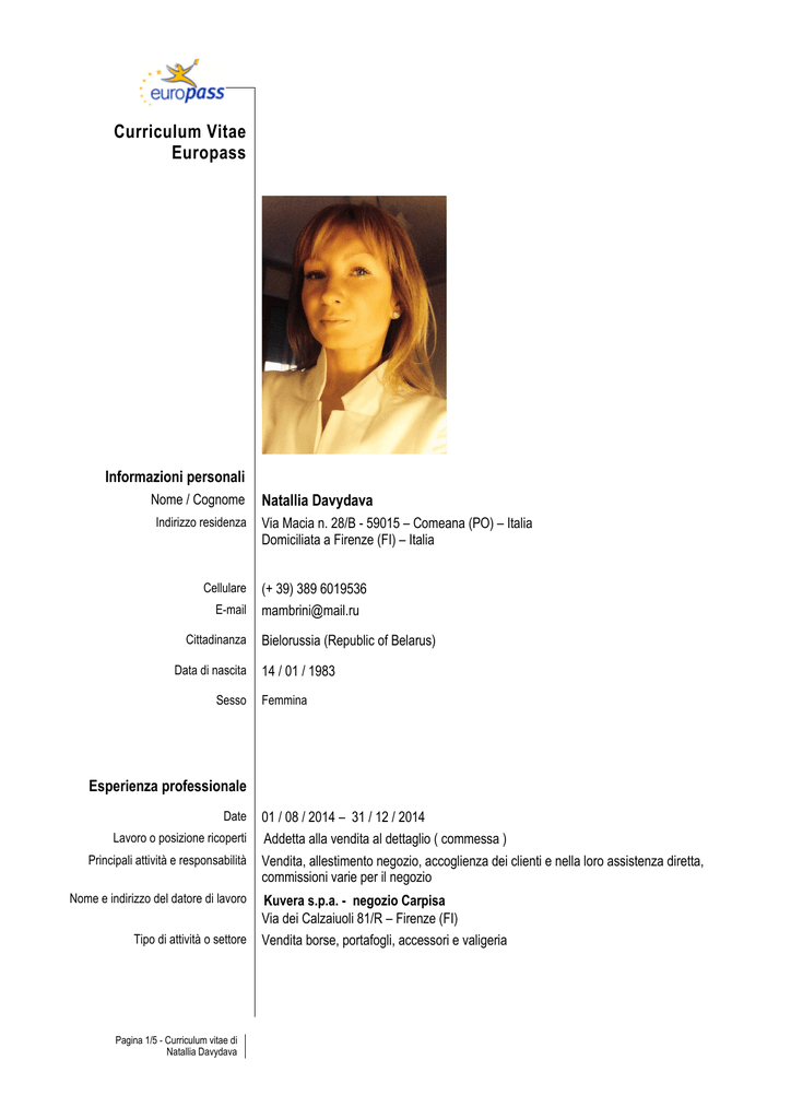 Curriculum Vitae Europass Informazioni personali Nome / Cognome Indirizzo residenza Cellulare E-mail Cittadinanza Data di nascita Sesso Natallia Davydava Via Macia n. 28/B - 59015 – Comeana (PO) – Italia Domiciliata a Firenze (FI) – Italia (+ 39) 389 6019536 [email protected] Bielorussia (Republic of Belarus) 14 / 01 / 1983 Femmina Esperienza professionale Date Lavoro o posizione ricoperti Principali attività e responsabilità Nome e indirizzo del datore di lavoro Tipo di attività o settore Pagina 1/5 - Curriculum vitae di Natallia Davydava 01 / 08 / 2014 – 31 / 12 / 2014 Addetta alla vendita al dettaglio ( commessa ) Vendita, allestimento negozio, accoglienza dei clienti e nella loro assistenza diretta, commissioni varie per il negozio Kuvera s.p.a. - negozio Carpisa Via dei Calzaiuoli 81/R – Firenze (FI) Vendita borse, portafogli, accessori e valigeria Date Lavoro o posizione ricoperti Principali attività e responsabilità Nome e indirizzo del datore di lavoro Tipo di attività o settore Date Lavoro o posizione ricoperti Principali attività e responsabilità Nome e indirizzo del datore di lavoro Tipo di attività o settore Date Lavoro o posizione ricoperti Principali attività e responsabilità Nome e indirizzo del datore di lavoro Tipo di attività o settore Date Lavoro o posizione ricoperti Principali attività e responsabilità Nome e indirizzo del datore di lavoro Tipo di attività o settore Date Lavoro o posizione ricoperti Principali attività e responsabilità Nome e indirizzo del datore di lavoro Tipo di attività o settore Date Lavoro o posizione ricoperti Principali attività e responsabilità Pagina 2/5 - Curriculum vitae di Natallia Davydava 07 / 2012 – 31 / 07 / 2014 Baby Sitter per due gemelli Cura dei bambini e supporto alla famiglia Claudia Manfredini Via Macia 28/B – Comeana (PO) Vedi referenze allegate 08 / 2011 – 12 / 2011 Assistenze speaker televisiva, assistente gestione contratti Annunciatrice notiziari Gestione contratti pubblicitari e dei contratti con la clientela TP ODO “Efir” Canale TV “Nirea” Via Pushkina 10/A – Gomel ( Rep. of Belarus) Televisione 05 / 2011 – 07 / 2011 Addetta alle vendite Gestione della cassa e addetta alle vendite Negozio “Westerley” Pr-t Lenina 18 – Gomel (Rep. of Belarus) Negozio di abbigliamento 05 / 2010 – 04 / 2011 Segreteria di Direzione Segretaria del Direttore delle Risorse Umane Filiale OAO “Himremont” – “Transneftediagnostica” Via Barykina 1 – Gomel (Rep. of Belarus) Settore petrolifero (costruzione, manutenzione e verifica depositi e oleodotti” 04 / 2008 – 02 / 2010 Segreteria di Direzione e Gestione Customer Service Segretaria del Direttore del Call Center Gestione rapporti con la clientela e servizio clienti CHSTUP “Planidalnfo” Pr-t Lenina 10 - Gomel (Rep. of Belarus) Call Center – Informazioni merci e Servizi 02 / 2007 – 02 / 2008 Segreteria di Direzione Segretaria del Direttore delle Risorse Umane Nome e indirizzo del datore di lavoro Tipo di attività o settore Date Lavoro o posizione ricoperti Principali attività e responsabilità Nome e indirizzo del datore di lavoro Tipo di attività o settore CHPYP “Po prizvaniu” Via Artioma 7 - Gomel (Rep. of Belarus) Settore petrolifero (controllo oleodotti) 09 / 2004 – 11 / 2006 Gestione Bar Barista, cameriera, cassiera Bar Caffè “Y Pruda” Parco centrale - Gomel (Rep. of Belarus) Bar, Caffetteria, Ristorazione Istruzione e formazione Date 03 / 2012 – 06 / 2012 Titolo della qualifica rilasciata Corso di lingua italiana Principali tematiche/competenze professionali acquisite Nome e tipo d'organizzazione erogatrice dell'istruzione e formazione Date Titolo della qualifica rilasciata Principali tematiche/competenze professionali acquisite Nome e tipo d'organizzazione erogatrice dell'istruzione e formazione Livello nella classificazione nazionale o internazionale Lingua italiana Scuola “Pane e Rose” Prato (PO) - Italia 09 / 2000 – 06 - 2003 Diploma di Segretaria di Azienda Informatica, lingua inglese, dattilografia Istituto Tecnico Professionale Statale “Gomelskij” Via Feduninskogo 6 - Gomel (Rep. of Belarus) Diploma di scuola secondaria superiore Capacità e competenze personali Madrelingua(e) Russo, Bielorusso Altra(e) lingua(e) Autovalutazione Livello europeo (*) Comprensione Ascolto Lettura Parlato Interazione orale Scritto Produzione orale Italiano C2 Livello avanzato C2 Livello avanzato C2 Livello avanzato C2 Livello avanzato C2 Livello avanzato Inglese B1 Livello intermedio B1 Livello intermedio B1 Livello intermedio B1 Livello intermedio B1 Livello intermedio (*) Quadro comune europeo di riferimento per le lingue Capacità e competenze organizzative Capacità di lavorare in situazioni di stress acquisite durante le mie esperienze lavorative e in particolare in situazioni di gestione dei rapporti con la clientela e con il proprio staff lavorativo. Pagina 3/5 - Curriculum vitae di Natallia Davydava Capacità e competenze informatiche Conoscenza degli applicativi Microsoft e del pacchetto Office, in modo particolare Word, Access, Excel, conoscenza del pacchetto Adobe PhotoShop e dei principali strumenti di posta elettronica e per la navigazione in Internet. Patente Patente B (guida autovetture) valida esclusivamente nel territorio della Republic of Belarus Allegati Lettera di referenze Autorizzo il trattamento dei miei dati personali ai sensi del Decreto Legislativo 30 giugno 2003, n. 196 "Codice in materia di protezione dei dati personali". Firma Natallia Davydava Pagina 4/5 - Curriculum vitae di Natallia Davydava Claudia MANFREDINI Via Macia, 28/B - loc. Comeana 59015 - Carmignano Tel: 055 8719833 Cell: 331 9236545 Mail: [email protected] LETTERA-DI. REFERENZE PER LA SIGNORA NATALLIA DAVVDAVA: La signora Natallia Davydava. ha Lavorato presso la nostra famiglia dall’ 1 aprile 2013 al 31 maggio 2014 in qualità di baby sitter per i nostri due gemelli, che al momento dell’inizio dell'incarico 