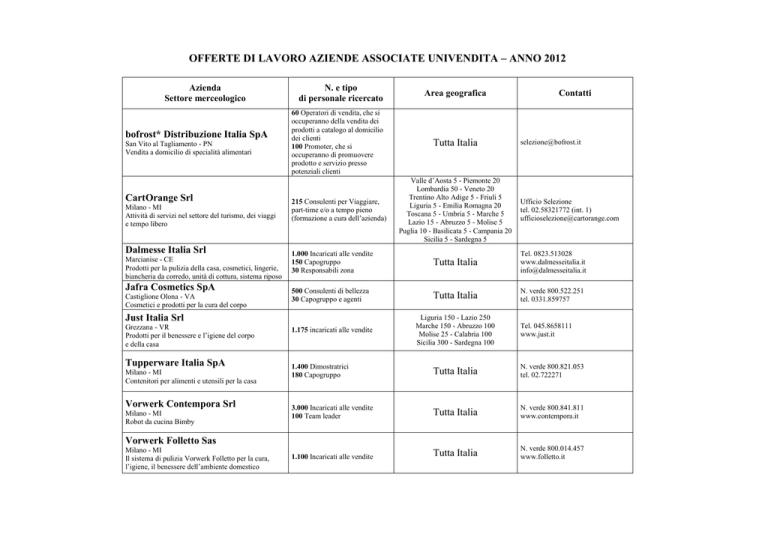 OFFERTE DI LAVORO AZIENDE ASSOCIATE UNIVENDITA – ANNO 2012 Azienda Settore merceologico bofrost* Distribuzione Italia SpA San Vito al Tagliamento - PN Vendita a domicilio di specialità alimentari CartOrange Srl Milano - MI Attività di servizi nel settore del turismo, dei viaggi e tempo libero Dalmesse Italia Srl Marcianise - CE Prodotti per la pulizia della casa, cosmetici, lingerie, biancheria da corredo, unità di cottura, sistema riposo Jafra Cosmetics SpA Castiglione Olona - VA Cosmetici e prodotti per la cura del corpo N. e tipo di personale ricercato 60 Operatori di vendita, che si occuperanno della vendita dei prodotti a catalogo al domicilio dei clienti 100 Promoter, che si occuperanno di promuovere prodotto e servizio presso potenziali clienti Tutta Italia 215 Consulenti per Viaggiare, part-time e/o a tempo pieno (formazione a cura dell’azienda) Valle d’Aosta 5 - Piemonte 20 Lombardia 50 - Veneto 20 Trentino Alto Adige 5 - Friuli 5 Liguria 5 - Emilia Romagna 20 Toscana 5 - Umbria 5 - Marche 5 Lazio 15 - Abruzzo 5 - Molise 5 Puglia 10 - Basilicata 5 - Campania 20 Sicilia 5 - Sardegna 5 Tupperware Italia SpA Milano - MI Contenitori per alimenti e utensili per la casa Vorwerk Contempora Srl Milano - MI Robot da cucina Bimby Contatti [email protected] Ufficio Selezione tel. 02.58321772 (int. 1) [email protected] 1.000 Incaricati alle vendite 150 Capogruppo 30 Responsabili zona Tutta Italia Tel. 0823.513028 www.dalmesseitalia.it [email protected] 500 Consulenti di bellezza 30 Capogruppo e agenti Tutta Italia N. verde 800.522.251 tel. 0331.859757 1.175 incaricati alle vendite Liguria 150 - Lazio 250 Marche 150 - Abruzzo 100 Molise 25 - Calabria 100 Sicilia 300 - Sardegna 100 Just Italia Srl Grezzana - VR Prodotti per il benessere e l’igiene del corpo e della casa Area geografica Tel. 045.8658111 www.just.it 1.400 Dimostratrici 180 Capogruppo Tutta Italia N. verde 800.821.053 tel. 02.722271 3.000 Incaricati alle vendite 100 Team leader Tutta Italia N. verde 800.841.811 www.contempora.it 1.100 Incaricati alle vendite Tutta Italia N. verde 800.014.457 www.folletto.it Vorwerk Folletto Sas Milano - MI Il sistema di pulizia Vorwerk Folletto per la cura, l’igiene, il benessere dell’ambiente domestico
