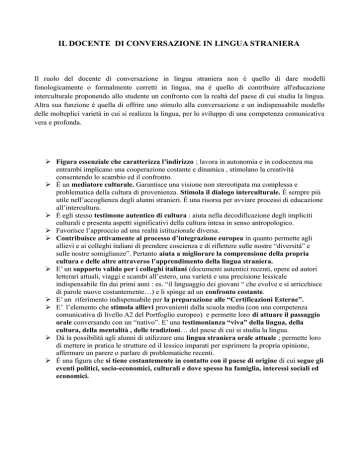 IL DOCENTE DI CONVERSAZIONE IN LINGUA STRANIERA Il ruolo del docente di conversazione in lingua straniera non è quello di dare modelli fonologicamente o formalmente corretti in lingua, ma è quello di contribuire all'educazione interculturale proponendo allo studente un confronto con la realtà del paese di cui studia la lingua. Altra sua funzione è quella di offrire uno stimolo alla conversazione e un indispensabile modello delle molteplici varietà in cui si realizza la lingua, per lo sviluppo di una competenza comunicativa vera e profonda. Figura essenziale che caratterizza l’indirizzo ; lavora in autonomia e in codocenza ma entrambi implicano una cooperazione costante e dinamica , stimolano la creatività consentendo lo scambio ed il confronto. È un mediatore culturale. Garantisce una visione non stereotipata ma complessa e problematica della cultura di provenienza. Stimola il dialogo interculturale. È sempre più utile nell’accoglienza degli alunni stranieri. È una risorsa per avviare processi di educazione all’intercultura. È egli stesso testimone autentico di cultura : aiuta nella decodificazione degli impliciti culturali e presenta aspetti significativi della cultura intesa in senso antropologico. Favorisce l’approccio ad una realtà istituzionale diversa. Contribuisce attivamente al processo d’integrazione europea in quanto permette agli allievi e ai colleghi italiani di prendere coscienza e di riflettere sulle nostre “diversità” e sulle nostre somiglianze”. Pertanto aiuta a migliorare la comprensione della propria cultura e delle altre attraverso l’apprendimento della lingua straniera. E’ un supporto valido per i colleghi italiani (documenti autentici recenti, opere ed autori letterari attuali, viaggi e scambi all’estero, una varietà e una precisione lessicale indispensabile fin dai primi anni : es. “il linguaggio dei giovani “ che evolve e si arricchisce di parole nuove costantemente…) e li spinge ad un confronto costante. E’ un riferimento indispensabile per la preparazione alle “Certificazioni Esterne”. E’ l’elemento che stimola allievi provenienti dalla scuola media (con una competenza comunicativa di livello A2 del Portfoglio europeo) e permette loro di attuare il passaggio orale conversando con un “nativo”. E’ una testimonianza “viva” della lingua, della cultura, della mentalità , delle tradizioni… del paese di cui si studia la lingua. Dà la possibilità agli alunni di utilizzare una lingua straniera orale attuale ; permette loro di mettere in pratica le strutture ed il lessico imparati per esprimere la propria opinione, affermare un parere o parlare di problematiche recenti. È una figura che si tiene costantemente in contatto con il paese di origine di cui segue gli eventi politici, socio-economici, culturali e dove spesso ha famiglia, interessi sociali ed economici. NORMATIVA: D.M. 28.5.92, vista la LEGGE 20.5.92. n. 270, Il Ministero della Pubblica Istruzione istituisce una nuova classe di concorso per l’insegnamento di “CONVERSAZIONE IN LINGUA STRANIERA” NEGLI ISTITUTI DÌ SECONDO GRADO. “ … tale intervento didattico, anche attraverso le prestazioni professionali di esperti di madre lingua, debba differenziarsi da quello dei docenti di lingua e letteratura straniera, sia per quanto riguarda i contenuti culturali, didattici e formativi propri, sia per lo stretto raccordo con una cultura diversa da quella italiana.” Il compito del docente di conversazione è: “ … non insegnare letteratura, linguaggi settoriali o grammatica, bensì proporsi come modello di comunicazione anche paraverbale e extraverbale e come esperto di cultura antropologicamente intesa del paese di cui diffonde la lingua”. Classe di concorso : Tabella C LIX. (Insegnante Tecnico-pratico con obbligo di tenere un registro individuale, … “fanno parte, a pieno titolo e con pienezza di voto deliberativo, del consiglio di classe. Le proposte di voto per le valutazioni periodiche e finali relative alle materie il cui insegnamento è svolto in compresenza sono autonomamente formulate, per gli ambiti di rispettiva competenza didattica, dal singolo docente, sentito l'altro insegnante. Il voto unico viene assegnato dal consiglio di classe sulla base delle proposte formulate, nonché degli elementi di giudizio forniti dai due docenti interessati."; -Circolare Ministeriale n°28 del 3/02/2000 –Protocollo 1201/B//1/A- Legge del 3/05/99 n°124 art. 5 ). IL DOCENTE DI CONVERSAZIONE SUL BIENNIO LINGUISTICO DESTINATARI : Principianti assoluti Falsi - principianti (allievi che hanno studiato tre anni di lingua 2 alla scuola superiore di I grado) Principianti avanzati (allievi che hanno studiato inglese, anche alle primarie e nella scuola superiore di I grado) OBIETTIVI: L’obiettivo essenziale da raggiungere per il docente di conversazione è quello di promuovere l’apprendimento della lingua straniera cercando di sviluppare soprattutto la competenza comunicativa e la capacità di interagire oralmente in maniera adeguata secondo le differenti situazioni di comunicazione e integrando le abilità necessarie che prevedono delle subcompetenze: competenza linguistica, competenza sociolinguistica, competenza discorsiva e competenza strategica. Il suo ruolo non è di insegnare grammatica o letteratura che forniscono rispettivamente una conoscenza delle strutture della lingua e della produzione dei grandi autori ma di colmare l’esigenza di una pratica linguistica del “qui ed ora” METODOLOGIA: Il lavoro del docente di conversazione si orienta principalmente verso l’approccio comunicativo ed è un insegnamento attivo e pratico che si avvale anche delle attività laboratoriali, partendo da situazioni di comunicazione conosciute agli studenti, usando materiale e documenti autentici, motivanti e vari. Questi piccoli stimoli servono come punti di partenza o integrazione nell’apprendimento ed aiutano a fissare argomenti e strutture introdotte