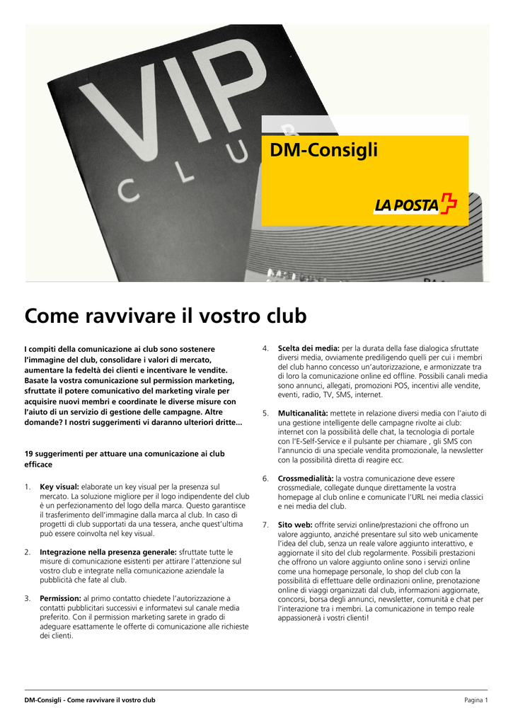 DM-Consigli Come ravvivare il vostro club I compiti della comunicazione ai club sono sostenere l’immagine del club, consolidare i valori di mercato, aumentare la fedeltà dei clienti e incentivare le vendite. Basate la vostra comunicazione sul permission marketing, sfruttate il potere comunicativo del marketing virale per acquisire nuovi membri e coordinate le diverse misure con l’aiuto di un servizio di gestione delle campagne. Altre domande? I nostri suggerimenti vi daranno ulteriori dritte... 4. Scelta dei media: per la durata della fase dialogica sfruttate diversi media, ovviamente prediligendo quelli per cui i membri del club hanno concesso un’autorizzazione, e armonizzate tra di loro la comunicazione online ed offline. Possibili canali media sono annunci, allegati, promozioni POS, incentivi alle vendite, eventi, radio, TV, SMS, internet. 5. Multicanalità: mettete in relazione diversi media con l’aiuto di una gestione intelligente delle campagne rivolte ai club: internet con la possibilità delle chat, la tecnologia di portale con l’E-Self-Service e il pulsante per chiamare , gli SMS con l’annuncio di una speciale vendita promozionale, la newsletter con la possibilità diretta di reagire ecc. 6. Crossmedialità: la vostra comunicazione deve essere crossmediale, collegate dunque direttamente la vostra homepage al club online e comunicate l’URL nei media classici e nei media del club. 7. Sito web: offrite servizi online/prestazioni che offrono un valore aggiunto, anziché presentare sul sito web unicamente l’idea del club, senza un reale valore aggiunto interattivo, e aggiornate il sito del club regolarmente. Possibili prestazioni che offrono un valore aggiunto online sono i servizi online come una homepage personale, lo shop del club con la possibilità di effettuare delle ordinazioni online, prenotazione online di viaggi organizzati dal club, informazioni aggiornate, concorsi, borsa degli annunci, newsletter, comunità e chat per l’interazione tra i membri. La comunicazione in tempo reale appassionerà i vostri clienti! 19 suggerimenti per attuare una comunicazione ai club efficace 1. Key visual: elaborate un key visual per la presenza sul mercato. La soluzione migliore per il logo indipendente del club è un perfezionamento del logo della marca. Questo garantisce il trasferimento dell’immagine dalla marca al club. In caso di progetti di club supportati da una tessera, anche quest’ultima può essere coinvolta nel key visual. 2. Integrazione nella presenza generale: sfruttate tutte le misure di comunicazione esistenti per attirare l’attenzione sul vostro club e integrate nella comunicazione aziendale la pubblicità che fate al club. 3. Permission: al primo contatto chiedete l’autorizzazione a contatti pubblicitari successivi e informatevi sul canale media preferito. Con il permission marketing sarete in grado di adeguare esattamente le offerte di comunicazione alle richieste dei clienti. DM-Consigli - Come ravvivare il vostro club Pagina 1 DM-Consigli - Come ravvivare il vostro club 8. 9. Periodicità: determinate la periodicità della comunicazione. Fondamentalmente, la regola è: contattate i membri solo in caso di informazioni ed offerte rilevanti e adeguate il numero di contatti alle esigenze dei membri. Spingete regolarmente i membri ad effettuare altri acquisti attraverso offerte allettanti. Ad esempio, tra due numeri di una rivista, che magari è trimestrale, inviate una o due newsletter online. Contatti differenziati: rivolgetevi diversamente ai membri del club potenziali, attuali e di una volta. Aiutate il più rapidamente possibile i nuovi target ad uscire dal loro anonimato, raccogliendo attraverso il dialogo informazioni sugli interessi dei membri. Sarà così possibile individuare le fasi critiche e reagire con misure individuali. Ad esempio coinvolgete i clienti a rischio nello sviluppo del prodotto chiedendo la loro opinione, e destate i clienti per così dire «in stand by» con offerte attrattive. 10. Acquisizione di membri: utilizzate dei mailing da inviare a indirizzi propri e/o di terzi per arrivare rapidamente al segmento clienti desiderato oppure – in caso di un club esclusivo – per raggiungere precocemente il risultato ambito attraverso i contributi dei membri. Anche nel POS informate in modo convincente sui vantaggi dell’appartenenza al club. 17. Trattamento VIP: trattate i membri del club come fossero dei VIP, ad esempio comunicando prima a loro informazioni su nuovi prodotti o servizi. In questo modo si applica esattamente quel trattamento VIP che molti clienti desiderano. 18. Service line: offrite ai vostri clienti informazioni gratuite sui prodotti e le loro possibilità di utilizzo. Per esempio la linea rossa del Back Club del Dr.Oetker tedesco porta direttamente al Back Clubteam della sezione dedicata agli esperimenti in cucina, dove tutte le domande dei clienti troveranno una risposta. Comunicate gli orari di apertura del centro servizi del club, per far conoscere ai clienti quanto si possono rivolgere al servizio. 19. Cerchia di regolazione: promuovete un ciclo formativo. Definite innanzitutto gli obiettivi della comunicazione per ogni target, realizzate poi la campagna – ad esempio una newsletter, una rivista o un mailing. Registrate tutte le reazioni dei membri del club nella banca dati, infine analizzate i risultati e sfruttate le conoscenze acquisite per la prossima promozione. 11. Appartenenza di prova: offrite agli interessanti una sorta di periodo di prova, che può trasformarsi una vera appartenenza non appena si ricorre ad una prestazione. 12. Marketing virale: date impulsi mirati per il marketing virale. Animate i vostri clienti a segnalare il club con stimoli attrattivi. Questa forma di comunicazione ha un’importanza essenziale per il club. Infatti, grazie al contributo dei membri del club nell’acquisizione di nuovi soci è possibile ottenere dei risparmi significativi nei club più grandi. 13. Fase di 