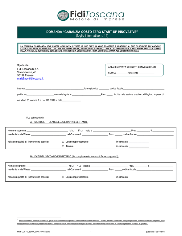 DOMANDA “GARANZIA COSTO ZERO START-UP INNOVATIVE” (foglio informativo n. 14) LA DOMANDA DI GARANZIA DEVE ESSERE COMPILATA IN TUTTE LE SUE PARTI IN MODO ESAUSTIVO E LEGGIBILE AL FINE DI RENDERE PIU’ AGEVOLE L’ITER DI DELIBERA. LA MANCATA O INCOMPLETA COMPILAZIONE, ANCHE DEGLI ALLEGATI, COMPORTA L’IMPOSSIBILITA’ A PROCEDERE NELL’ISTRUTTORIA DELLA PRATICA. IL DOCUMENTO DEVE ESSERE TRASMESSO IN ORIGINALE CON FIRMA CHIROGRAFA O VIA PEC CON FIRMA DIGITALE. Spettabile Fidi Toscana S.p.A. Viale Mazzini, 46 50132 Firenze [email protected] AREA RISERVATA SOGGETTI CONVENZIONATI CODICE ________ Referente ____________ Impresa _________________________________________________ forma giuridica ________, codice fiscale___________________________________ partita iva_______________________ con sede legale in _________________________Prov. _____, iscritta nella sezione speciale del Registro Imprese di cui all’art. 25, comma 8, d.l. n. 179 /2012 in data________________ Il/La sottoscritto/a A - DATI DEL TITOLARE/LEGALE RAPPRESENTANTE: Nome e cognome _________________________________ M □ F □ nato a ______________________________ Prov. __________ il _________________ residente in via/Piazza ____________________________ nel Comune di _____________________ Prov. ______ codice fiscale _____________________________ nella sua qualità di: (barrare una casella) □ □ Legale rappresentante in carica dal ________________ Titolare in carica dal ________________ B - DATI DEL SECONDO FIRMATARIO (da compilare solo in caso di firma congiunta1): Nome e cognome _________________________________ M □ F □ nato a ______________________________ Prov. __________ il ___________________ residente in via/Piazza ____________________________ nel Comune di _____________________ Prov. ______codice fiscale _____________________________ nella sua qualità di: (barrare una casella) 1 □ Legale rappresentante in carica dal ________________ Per la firma della presente richiesta di garanzia sono necessari i poteri di straordinaria amministrazione. Qualora pertanto lo statuto o deleghe specifiche richiedano la firma congiunta, sarà necessario compilare i dati presenti nel box da parte di ciascun amministratore/delegato e altresì apporre la firma di ciascuno in calce alla presente richiesta di garanzia. Mod. COSTO_ZERO_STARTUP 03/2016 1 pubblicato il 22/11/2016 Referente per eventuali contatti Tel. Fax._______________e-mail______________________________ Pec dell’impresa (obbligatoria per comunicazioni) _________________________________________________________________________________________ finanziamento sul quale viene richiesta la garanzia:FCG2 BANCA_________________________________FILIALE/CENTRO IMPRESE DI ____________________________ VIA ____________________________________ COMUNE________________________________PR.______tel.____________________fax________________________,mail_______________________________ FORMA TECNICA__________________________________________IMPORTO _________________________DURATA (mesi) __________ di cui PREAMMORTAMENTO (mesi) _______ PERIODICITA’ RATA ______________________% DI GARANZIA RICHIESTA: _______________ □ Deliberato dalla Banca in data __________________(allegare copia) □ Da Deliberare TIPOLOGIA DI INTERVENTO FIDI TOSCANA: Prima richiesta con controgaranzia FdG2 (obbligatoria la compilazione dell’allegato 6) 2 Si ricorda a riguardo che il finanziamento dovrà essere deliberato dalla banca successivamente alla data di delibera di ammissione del Fondo, salvo che la delibera della banca sia condizionata nella sua esecutività all’acquisizione della controgaranzia del Fondo stesso. L’erogazione dovrà in ogni caso avvenire successivamente alla data di delibera di ammissione al Fondo. Mod. COSTO_ZERO_STARTUP 03/2016 2 pubblicato il 22/11/2016 AREA RISERVATA ALLA BANCA FINANZIATRICE In relazione alla domanda di finanziamento con garanzia di Fidi Toscana presentata dall’impresa ____________________________________ in data_______________, la Banca di Credito Cooperativo di Cambiano per mezzo del Sig. (nome e cognome)___________________________tel.________________________mail ____________________ nella sua qualità di ______________________________: 1. attesta di aver ricevuto copia della presente richiesta di garanzia e di essere pertanto a conoscenza della richiesta trasmessa a Fidi Toscana; 2. dichiara, limitatamente ai rapporti dell’impresa con la banca finanziatrice l’inesistenza di crediti scaduti da più di 180 giorni e/o dell’eventuale classificazione dell’impresa tra la clientela ad incaglio o in sofferenza. 3. dichiara, ferma restando la responsabilità di Fidi Toscana, di aver proceduto all’identificazione del cliente, in linea con le vigenti disposizioni antiriciclaggio; 4. specifica che il finanziamento sarà concesso a valere sul Nuovo Plafond PMI – Investimenti di Cassa Depositi e Prestiti (IN CASO AFFERMATIVO BARRARE ESPRESSAMENTE LA CASELLA) □ Cab della filiale/Centro Imprese __________ (obbligatorio) Classe di rating in cui si colloca l’impresa richiedente _________ Data______________________________ Timbro e firma _______________________ DELEGA A SOGGETTO TERZO CONVENZIONATO (eventuale) Il sottoscritto/i dichiara/no di aver conferito a_________________________________ (referente sig. ____________________________) l’incarico per l’assistenza all’impresa da me rappresentata relativa alla presente domanda di garanzia. Autorizza/no, di conseguenza, Fidi Toscana ad effettuare eventuali comunicazioni in merito alla presente operazione, ivi compreso l’esito della stessa, anche direttamente al suddetto Soggetto terzo convenzionato. Firma _________________________________________________ Firma (in caso di firma congiunta) ________________________________________________ Mod. COSTO_ZERO_STARTUP 03/2016 3 pubblicato il 22/11/2016 Dichiara che: - - - - l’impresa non è in difficoltà ai sensi della vigente normativa comunitaria; si impegna a tr