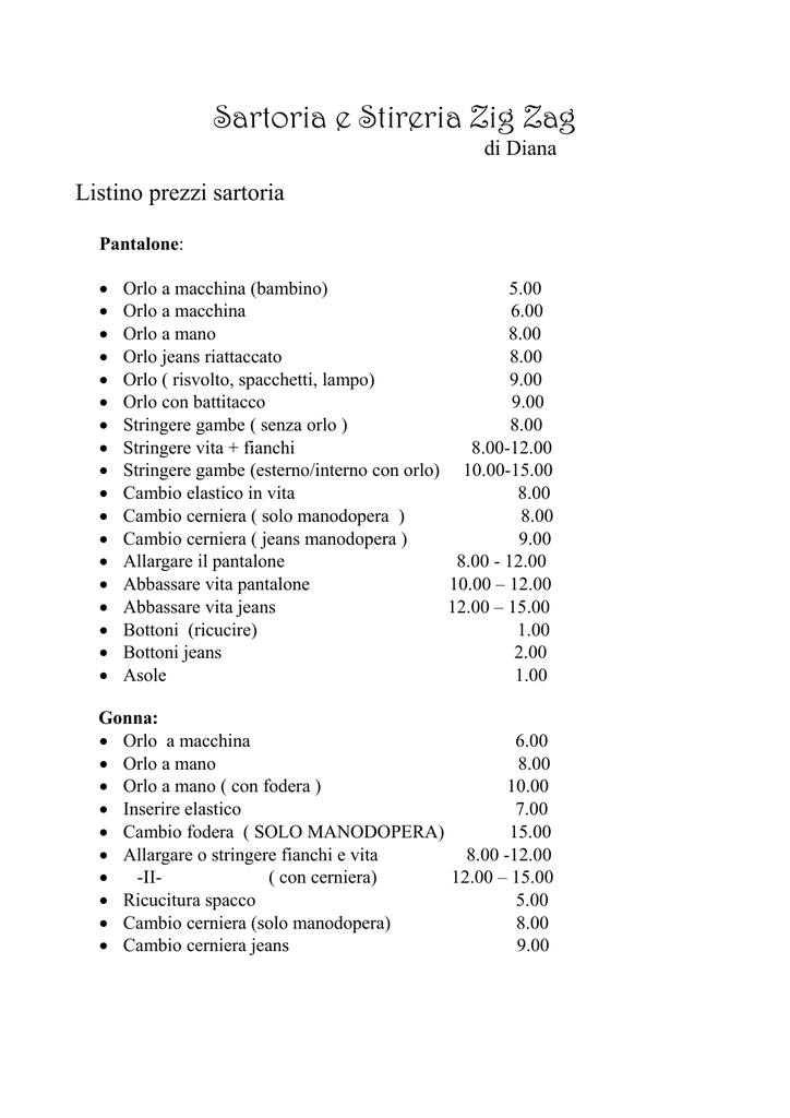 Sartoria e Stireria Zig Zag di Diana Listino prezzi sartoria Pantalone: Orlo a macchina (bambino) 5.00 Orlo a macchina 6.00 Orlo a mano 8.00 Orlo jeans riattaccato 8.00 Orlo ( risvolto, spacchetti, lampo) 9.00 Orlo con battitacco 9.00 Stringere gambe ( senza orlo ) 8.00 Stringere vita + fianchi 8.00-12.00 Stringere gambe (esterno/interno con orlo) 10.00-15.00 Cambio elastico in vita 8.00 Cambio cerniera ( solo manodopera ) 8.00 Cambio cerniera ( jeans manodopera ) 9.00 Allargare il pantalone 8.00 - 12.00 Abbassare vita pantalone 10.00 – 12.00 Abbassare vita jeans 12.00 – 15.00 Bottoni (ricucire) 1.00 Bottoni jeans 2.00 Asole 1.00 Gonna: Orlo a macchina 6.00 Orlo a mano 8.00 Orlo a mano ( con fodera ) 10.00 Inserire elastico 7.00 Cambio fodera ( SOLO MANODOPERA) 15.00 Allargare o stringere fianchi e vita 8.00 -12.00 -II( con cerniera) 12.00 – 15.00 Ricucitura spacco 5.00 Cambio cerniera (solo manodopera) 8.00 Cambio cerniera jeans 9.00 Abito donna: Orlo a macchina 6.00 Orlo a mano 8.00 Orlo a mano + orlo fodera 10.00-12.00 Allargare o stringere i fianchi o sottobraccia 12.00 -IIfianchi con la cerniera 13.00 Cambio cerniera invisibile 10.00 Allargare o stringere (centro dietro) 10.00 -II( centro dietro con cerniera) 13.00 Accorciare le bretelle 5.00 - 8.00 Cucitura bretelle 3.00 Camicia: Orlo semplice Orlo a mano Stringere maniche e i fianchi Accorciare maniche con i polsini Girare collo ( uomo) 6.00 8.00 8.00-10.00 10.00 8.00 Giacche e giubbotti/cappotti: Accorciare maniche a macchina (giacca sfoderata)6.00-8.00 Accorciare maniche a mano (giacca sfoderata) 8.00 -II( giacca foderata) 12.00 - 25.00 Fondo giacca uomo/donna (sfoderata) 10.00 - 15.00 Fondo giacca uomo/donna (foderata) 15.00 - 20.00 Fondo cappotto 15.00 - 20.00 Sostituzione cerniera felpa (cerniera esclusa) 10.00 -15.00 -II- giacca/giaccone ( cerniera esclusa) 20.00 - 30.00 Asole cappotti 2.00 Bottone cappotti (ricucire) 1.00 N.B. Le eventuali riparazioni non elencate nel listino si valuteranno al momento! Qualsiasi intervento non corrispondente alle riparazioni elencate saranno valutate al momento!