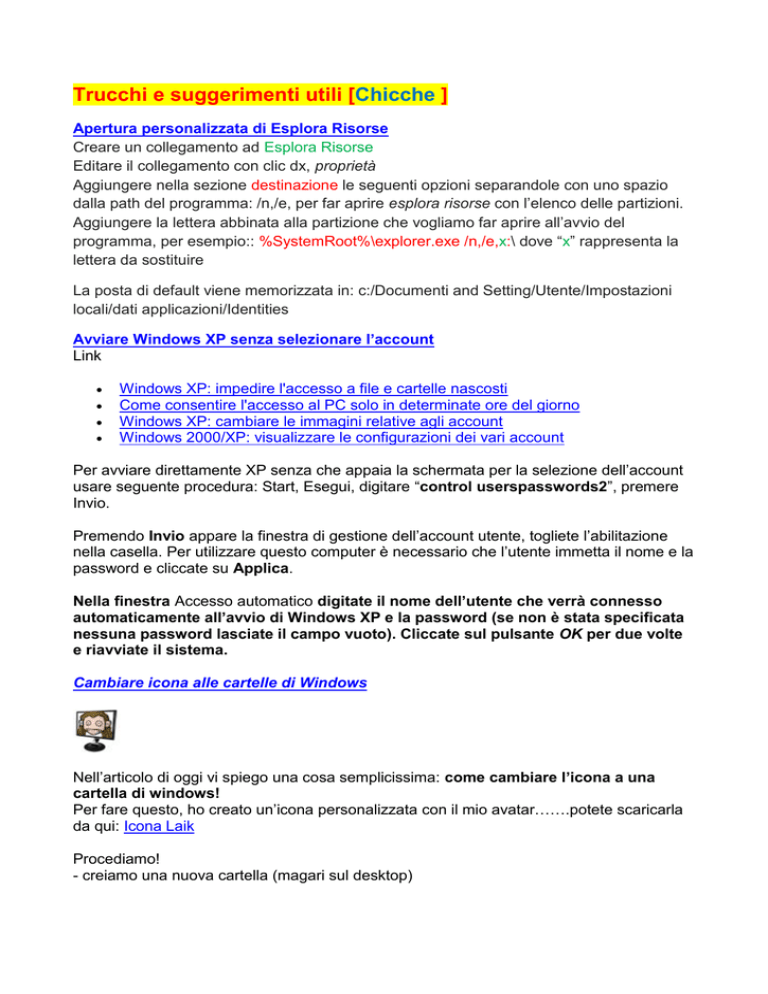 Trucchi e suggerimenti utili [Chicche ] Apertura personalizzata di Esplora Risorse Creare un collegamento ad Esplora Risorse Editare il collegamento con clic dx, proprietà Aggiungere nella sezione destinazione le seguenti opzioni separandole con uno spazio dalla path del programma: /n,/e, per far aprire esplora risorse con l’elenco delle partizioni. Aggiungere la lettera abbinata alla partizione che vogliamo far aprire all’avvio del programma, per esempio:: %SystemRoot%\explorer.exe /n,/e,x:\ dove “x” rappresenta la lettera da sostituire La posta di default viene memorizzata in: c:/Documenti and Setting/Utente/Impostazioni locali/dati applicazioni/Identities Avviare Windows XP senza selezionare l’account Link Windows XP: impedire l'accesso a file e cartelle nascosti Come consentire l'accesso al PC solo in determinate ore del giorno Windows XP: cambiare le immagini relative agli account Windows 2000/XP: visualizzare le configurazioni dei vari account Per avviare direttamente XP senza che appaia la schermata per la selezione dell’account usare seguente procedura: Start, Esegui, digitare “control userspasswords2”, premere Invio. Premendo Invio appare la finestra di gestione dell’account utente, togliete l’abilitazione nella casella. Per utilizzare questo computer è necessario che l’utente immetta il nome e la password e cliccate su Applica. Nella finestra Accesso automatico digitate il nome dell’utente che verrà connesso automaticamente all’avvio di Windows XP e la password (se non è stata specificata nessuna password lasciate il campo vuoto). Cliccate sul pulsante OK per due volte e riavviate il sistema. Cambiare icona alle cartelle di Windows Nell’articolo di oggi vi spiego una cosa semplicissima: come cambiare l’icona a una cartella di windows! Per fare questo, ho creato un’icona personalizzata con il mio avatar…….potete scaricarla da qui: Icona Laik Procediamo! - creiamo una nuova cartella (magari sul desktop) - cliccateci con il tasto destro del mouse e scegliete “Proprietà” - nella schermata successiva cliccate sul tab “Personalizza” e poi su “Cambia icona” - nella schermata successiva cliccate su “Sfoglia” per cercare il file Laik Icona sul costro hard disk - una volta trovata la Laik Icona cliccate sempre “Ok” finche’ non tornate sul desktop - Fatto! il risultato sara’ come nella figura qui sotto: Buon lavoro! Visualizzare estensione files. Aprire Esplora risorse/Strumenti/Opzioni cartelle/ estensione …./ togliere la “spunta” a…. consenti Ridurre “peso” immagini con gestore di posta. Selezionare le immagini e col dx del mouse scegliere “invia a destinatario di posta” optare per la loro riduzione. Fatto. Salvarle per una loro successiva utilizzazione. Convertire un documento office in un file pdf Esiste un convertitore di file word, excel ecc.ecc... molto semplice e free.... si chiama PDF4FREE . Lo si installa, poi si apre il file word, si cliccha su file--> stampa e tra le stampati si seleziona quella PDF, e praticamente invece di stampare si genera un file PDF. Foto da cellulare a cellulare..come fare? Ci sono tanti modi, dipende da che cellula resi ha e che cellulare ha l'altra persona, oltre che a che distanza siete tra di voi. Si può mandarlo tramite e-mail o mms, oppure trasferire il file tramite infrarossi o blutooth (se siete abbastanza vicini). O anche, se i due cellulari supportano le schede di memoria, spostare la foto sulla scheda e dare la scheda all'altra persona perché prenda l'immagine dalla scheda. Oppure basta attivare il bluetooth, sia nel primo che nel secondo telefono. Poi si seleziona la foto e si clicca sul tasto invia, qui apparirà un elenco...si deve scegliere via bluetooth....il gioco è fatto!!!ed è gratuito... Come scaricare foto da cellulare a pc? Se entrambi gli apparecchi hanno il BLUETOOTH o gli INFRAROSSI si può farlo con quelli. Altrimenti ci sono dei cavi appositi da acquistare. Altrimenti si puoi mandare un MMS per posta elettronica...ma se sono tante foto è lunga!!! Trasferire foto da cellulare a pc con bluetooth Si può utilizzare un’apposita chiavetta ma si deve installare il programma in dotazione con la chiavetta stessa poi si deve far riconoscere il PC al telefonino, come quando gli si fa trovare un nuovo cell col bluetooth Registrare trasmissioni tv-radio in diretta con VideoLan Scritto il 17th Novembre, 2008 da Cala in Guide, Player, Radio, Streaming, TV, Trucchi, Utilità VLC media player (originariamente chiamato VideoLAN Client) è un media player del progetto VideoLAN. VLC supporta molti codec audio e video, formati file come DVD, VCD e vari protocolli per lo streaming. Può essere utilizzato anche come server per trasmettere in stream, in unicast o in multicast su IPv4 o su IPv6 su un network a larga banda. Quello che intendiamo fare oggi non è recensire un software ormai conosciuto da quasi tutti, ma far vedere come sia possibile sfruttare le potenzialità di questa chicca per registrare sul proprio PC trasmissioni tv-radio in diretta. Oggi molti canali televisivi sono infatti visualizzabili in internet, basta per l’appunto un player come Videolan e una connessione internet discreta ed ecco che con un paio di clic saremo in grado di registrare la nostra serie tv preferita, o magari la parita di champions league. Come si registra in diretta con Videolan? Apri flusso di rete: cliccare “Ctrl R” oppure Impostare la registrazione del canale: dal menu “File” scegliere “Apri flussi di rete”. spuntiamo il flusso “http/https/ftp/mms” come in figura (1) , e scriviamo in URL il link del canale da registrare. Spuntiamo “Trasmetti/Salva” (2) e clicchiamo su “Impostazioni”. Rai 1 Rai 2 Rai 3 Rai News Rai Sport + Deejay TV All Music RTL 102.5 Radio Italia TV Canale7 Repubblica TG Repubblica TV Telerama Ibiza On Carpe Diem CBL Film Impostare la registrazione del canale: spuntiamo “Riproduci localmente” (4), spuntiamo “File” e (5