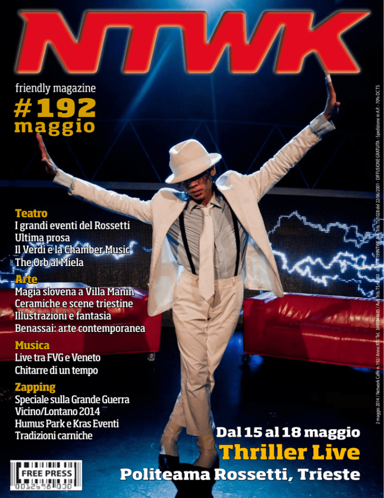 # 192 maggio Teatro I grandi eventi del Rossetti Ultima prosa Il Verdi e la Chamber Music The Orb al Miela Arte Magia slovena a Villa Manin Ceramiche e scene triestine Illustrazioni e fantasia Benassai: arte contemporanea Musica Live tra FVG e Veneto Chitarre di un tempo Zapping Speciale sulla Grande Guerra Vicino/Lontano 2014 Humus Park e Kras Eventi Tradizioni carniche Dal 15 al 18 maggio 2 maggio 2014 / Network Caffè n. 192/ Anno XIX/ Tel. 3488044685 / Aut. Trib. TS n. 980 del 9/4/199NTWK Aut. Trib. TS 1028 del 22/06/2001 - DIFFUSIONE GRATUITA - Spedizione in A.P. - 70% DC TS friendly magazine Thriller Live Politeama Rossetti, Trieste 1 marzo 2013 / Nwork Caffè n. 177/ Anno XVII / Tel. 3488044685 / Aut. Trib. TS n. 980 del 9/4/199NTWK Aut. Trib. TS 1028 del 22/06/2001 - DIFFUSIONE GRATUITA - Spedizione in A.P. - 70% DC TS Il Friuli Venezia Giulia al centro dell’Europa. Isabella DE MONTE PER UN’EUROPA CONCRETA E SOLIDALE Sono componente della 1ª Commissione affari costituzionali e Segretario della Giunta per le elezioni e delle immunità parlamentari del Senato. Nella mia attività parlamentare sono stata relatrice del provvedimento di abolizione del finanziamento pubblico ai partiti politici. Oggi, con la stessa determinazione, senso di responsabilità e pragmatismo di sempre, affronto la sfida della candidatura al Parlamento europeo, per portare il Friuli Venezia Giulia al centro dell’Europa. pdfvg.it isabellademonte.eu demonteisabella IsabellaDeMonte Comm. resp.: Partito Democratico del Friuli Venezia Giulia - via Joppi, 63 Udine Faccio politica per passione, sono stata sindaco del comune di Pontebba e ho portato la mia esperienza di amministratrice in Parlamento, dove sono senatrice dal 2013. maggio 2014 # 192 maggio Teatro I grandi eventi del Rossetti Ultima prosa Il Verdi e la Chamber Music The Orb al Miela Arte Tel. 348 8044685 www.ntwk.it [email protected] [email protected] Magia slovena a Villa Manin Ceramiche e scene triestine Illustrazioni e fantasia Benassai: arte contemporanea Musica Live tra FVG e Veneto Chitarre di un tempo Zapping Speciale sulla Grande Guerra Vicino/Lontano 2014 Humus Park e Kras Eventi Tradizioni carniche Dal 15 al 18 maggio 2 maggio 2014 / Network Caffè n. 192/ Anno XIX/ Tel. 3488044685 / Aut. Trib. TS n. 980 del 9/4/199NTWK Aut. Trib. TS 1028 del 22/06/2001 - DIFFUSIONE GRATUITA - Spedizione in A.P. - 70% DC TS 192 TEATRO friendly magazine Thriller Live Politeama Rossetti Trieste 1 marzo 2013 / Nwork Caffè n. 177/ Anno XVII / Tel. 3488044685 / Aut. Trib. TS n. 980 del 9/4/199NTWK Aut. Trib. TS 1028 del 22/06/2001 - DIFFUSIONE GRATUITA - Spedizione in A.P. - 70% DC TS STAFF Direzione Dal 15 al 18 maggio al Politeama rossetti di Trieste Thriller Live FABIO FIERAMOSCA Shadowland, per grandi e piccoli | Thriller live, rivivere Michael Jackson | Divertimento e fantasia al Rossetti con Viva la gente e Oblivion | Eduardo De Filippo e Mishima, protagonisti del Novecento | Attila al Verdi, Salotto cameristico al Ridotto | Al Miela l’appuntamento è con The Orb ARTE DA PAGINA 10 La magia degli artisti sloveni degli ultimi 50 anni a Villa Manin | Trieste mette in mostra scene dipinte e ceramiche | Lorenzo De Vecchi Grafica e impaginazione Erratacorrige [email protected] Un grazie a tutti gli Uffici stampa ed alle Agenzie di comunicazione che hanno fornito materiale per questo numero. DA PAGINA 4 da pagina 4 Immagini, illustrazioni, fotografie: Mehrkens, Heine, Manenti, Kusterle | L’arte di oggi con Alessandro Benassai | Il canto della natura: Maurizio Morassutti MUSICA Stampa Tipografia Stella, Trieste DA PAGINA 18 Dal vivo il Veneto scalda la stagione | Ritorna la magia dei Dire Straits | NTWK è un’edizione: da pagina 10 Johnny Winter, vecchie chitarre ritornano ZAPPING Registro periodici autorizzazione Tribunale di Trieste n. 980 del 9/4/1998 e n. 1028 del 22/6/2001 Alcune immagini e testi riprodotti sono usati a scopo informativo e divulgativo e mantengono il © dei rispettivi detentori. La responsabilità su giudizi ed opinioni espressi negli articoli è esclusivamente di chi li ha firmati o siglati e non necessariamente della direzione o della proprietà editrice. Le date dei concerti possono subire variazioni o errori di stampa: decliniamo ogni responabilità ed invitiamo ad usare le info disponibili. È vietata la riproduzione anche parziale dei testi o delle immagini senza espressa autorizzazione della casa editrice. Questo numero è stato chiuso per la stampa il 31 marzo 2014 Distribuzione gratuita da pagina 18 DA PAGINA 22 Vicino/Lontano, le idee e i protagonisti dell’età contemporanea | Humus Park, arte e verde | Speciale Grande Guerra: dal programma di èStoria alle numerose mostre e rassegne in regione | A Sutrio, per vivere la Carnia | Carso da conoscere con Kras@event@Carso | Maggio all’aperto, tra giardini e cantine da pagina 22 NETWORK CAFFÉ Le date del Friuli Venezia Giulia GLI INDIRIZZI DOVE TROVI NTWK A TRIESTE: HOTEL MILANO, v. Ghega 17 • JOLLY HOTEL v. Cavur 7 • HOTEL DUCHI p. Unità d’Italia 2 • BAR ROMA4 v.Roma 4 • BIP COMPUTER v. Donota 9 • DIME v.Milano 21 • SABBADIN v. Roma 28 • CENTER FITNESS v. San Nicolò13 • LA PORTIZZA p. Borsa 6 • BAR URBANIS p. Teatro 4 • SPAZIO 11 v. S.Caterina 11 • CAFFE JOICE v. Roma 14 • BAR REX g. Protti 1 • UTAT POINT c. Italia 6 • CAFFE’ TORINESE c. Italia 2 • BUFFET BORSA v. Cassa Risparmio 2 • RISTOBAR PRIMO v. Santa Caterina 9 • CAFFE’ STELLA POLARE v. Dante 14 • CAFFE’ TOMMASEO p. Tommaseo 4/c • MALABAR p. San Giovanni 6 • CAFFE’ VIA DELLE TORRI v.delle Torri 3 • BAR ALPINO v. San Lazzaro 8 • CAFFE’ PONCHIELLI v.Ponchielli 3/b • LA FELTRINELLI v. Mazzini 39 • BAR X v. Coroneo 11 • CIRCUS v. San Lazzaro 11 • CAFFE’ SAN MARCO v.Battisti 11 • LA PREFERITA v.le XX Settembre 29 • AQVEDOTTO v.le XX Settembre 37/c • COSTA v.le XX Settembre 24 • CAFFE’ROSSETTI v.le XX Settembre 45/a • BAR EXCELSIOR v.le XX S