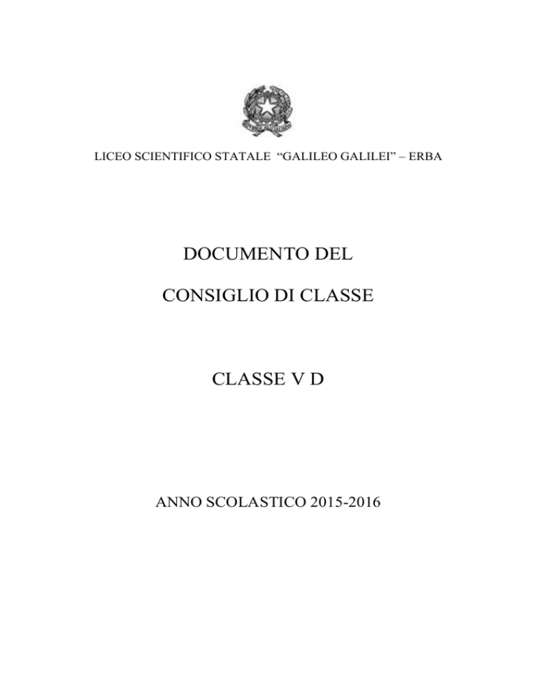 LICEO SCIENTIFICO STATALE “GALILEO GALILEI” – ERBA DOCUMENTO DEL CONSIGLIO DI CLASSE CLASSE V D ANNO SCOLASTICO 2015-2016 QUADRO COMUNE DI RIFERIMENTO Quadro riassuntivo della classe Inizialmente costituita da 23 allievi, la classe si è progressivamente assottigliata, perdendo sei unità nel biennio (5 non ammessi e 1 trasferito). In terza ha acquisito un’alunna proveniente da altra scuola, 8 alunni della ex 2°A (che è stata suddivisa in due classi) ed un alunno proveniente da altra scuola nel mese di gennaio. In quarta ha perso un’alunna non ammessa ed ha acquisito un alunno proveniente da altra scuola che ha frequentato solo il quarto anno in questa scuola. In quinta ha perso un alunno per trasferimento e acquistato un’alunna proveniente da un’altra scuola. Nella classe è presente un alunno con DSA, con diagnosi pervenuta il 1 aprile 2015, aggiornata il 22 febbraio 2016, che usufruisce del P.D.P agli atti della Segreteria della scuola, e che dispone degli strumenti compensativi e delle misure dispensative come indicato nella scheda in allegato. La classe si presenta quindi all’Esame di Stato composta di 26 allievi, che hanno tutti frequentato con regolarità. Nel triennio la classe ha goduto di continuità didattica in tutte le discipline tranne per storia, filosofia e religione (il prof. Pascolo, la prof.ssa Baldo e la prof.ssa Ferrario sono presenti dalla quinta). Nel corso del triennio la classe, nel suo complesso, ha mostrato un atteggiamento positivo e coscienzioso nei confronti degli impegni di studio, un buon interesse e un livello di partecipazione al dialogo educativo molto soddisfacente. Gli alunni si sono distinti per la correttezza nel comportamento e nel rispetto delle regole. Sul piano del rendimento, il quadro appare naturalmente differenziato: se un buon gruppo ha conseguito pienamente gli obiettivi didattici definiti nelle programmazione annuale del Consiglio di Classe, una esigua parte della stessa, pur avendo conseguito gli obiettivi minimi, mostra ancora qualche fragilità nella preparazione. Criteri di assegnazione del credito scolastico e del credito formativo Il credito scolastico e il credito formativo vengono assegnati secondo i criteri stabiliti dal Collegio docenti di cui si allega la delibera. Attività integrative o complementari svolte dalla classe o da parte di essa Attività curriculari Attività di laboratorio con il Cusmibio; Attività di laboratorio sulla chimica forense con la collaborazione con la facoltà di chimica dell’università Insubria di Como. Attività extracurricolari Nel corso dell’anno scolastico la classe ha partecipato alle seguenti uscite didattiche: spettacolo teatrale su Pirandello: “Così è se vi pare” a Lecco; visita al Museo del Novecento a Milano; mostra su Boccioni a Palazzo Reale a Milano; rappresentazione teatrale di matematica al teatro Carcano di Milano; visione del film muto “Nosferatu il vampiro”; incontri di orientamento post-diploma, organizzati dalla scuola; iniziativa di orientamento “Young, orienta il tuo futuro”- Lariofiere; conferenza sulla Giornata del ricordo. Sono state inoltre organizzate le seguenti attività a partecipazione libera: conferenze sulla relatività: “Cent’anni di relatività”; conferenza sulla prima guerra mondiale di Ivano Gobbato; conferenze su temi scientifici; conferenza “L’attualità del Barocco”; conferenza di cosmologia tenuta dal prof. Lamberti; corso di robotica all’Insubria di Como; manifestazioni sportive di sci alpino, atletica su pista e corsa campestre; test di ammissione alle facoltà scientifiche; gare di matematica (gara di squadra); “Olimpiadi della cultura e del talento”; attività di orientamento post-diploma, organizzate dalla scuola in concerto con le università; partecipazione alla giornata del FAI; esame ECDL; First Certificate. Simulazioni delle prove d’esame Durante l’anno scolastico si sono svolte: 1 simulazione di prima prova, 1 simulazione di seconda prova e 2 simulazioni di terza prova. Per queste ultime si sono seguiti i seguenti criteri: tipologia utilizzata: B; tempo assegnato per lo svolgimento: 2 ore e 30 minuti; materie coinvolte: inglese – scienze – filosofia – fisica (I simulazione); inglese –storia dell’arte – fisica – latino (II simulazione). I quesiti proposti sono riportati in allegato; griglia per la valutazione: vedi allegato. Allegati In coda al documento sono proposti i seguenti allegati: criteri per l’assegnazione del credito scolastico; griglie utilizzate per la valutazione della prova scritta di italiano; griglia utilizzata per la valutazione della simulazione della prova scritta di matematica; griglia utilizzata per la valutazione delle simulazioni di terza prova; quesiti proposti in occasione delle simulazioni di terza prova; scheda dell’alunno con DSA. ITALIANO Obiettivi realizzati Conoscenze - Periodizzazione della storia letteraria dal Romanticismo al Novecento. - Conoscenza dei testi e dei concetti letterari fondamentali dal Romanticismo al Novecento. - Conoscenza di circa sei canti della Commedia. - Conoscenza dell’evoluzione dei principali generi letterari attraverso la lettura diretta di testi significativi. - Conoscenza dei contesti, dei luoghi e dei mezzi della comunicazione letteraria in merito alle seguenti tematiche: 1. il rapporto con la tradizione 2. la figura dell’intellettuale 3. forme dell’estetica dal Romanticismo al Novecento 4. le avanguardie poetiche e narrative 5. i luoghi della cultura - Elementi di metrica e prosodia, di stilistica, di narratologia funzionali all’analisi dei testi. - Conoscenza di tutte le tipologie previste dalla prima prova d’esame. Competenze - Saper collocare il testo all’interno di un contesto più ampio. - Saper stabilire rapporti tra opere e autori, con individuazione di tópoi e di elementi di intertestualità. - Saper analizzare in modo critico il testo letterario. - Saper riconoscere la centralità del testo