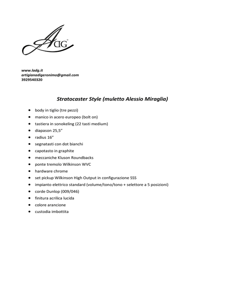 www.ladg.it [email protected] 3929540320 Stratocaster Style (muletto Alessio Miraglia) body in tiglio (tre pezzi) manico in acero europeo (bolt on) tastiera in sonokeling (22 tasti medium) diapason 25,5” radius 16” segnatasti con dot bianchi capotasto in graphite meccaniche Kluson Roundbacks ponte tremolo Wilkinson WVC hardware chrome set pickup Wilkinson High Output in configurazione SSS impianto elettrico standard (volume/tono/tono + selettore a 5 posizioni) corde Dunlop (009/046) finitura acrilica lucida colore arancione custodia imbottita