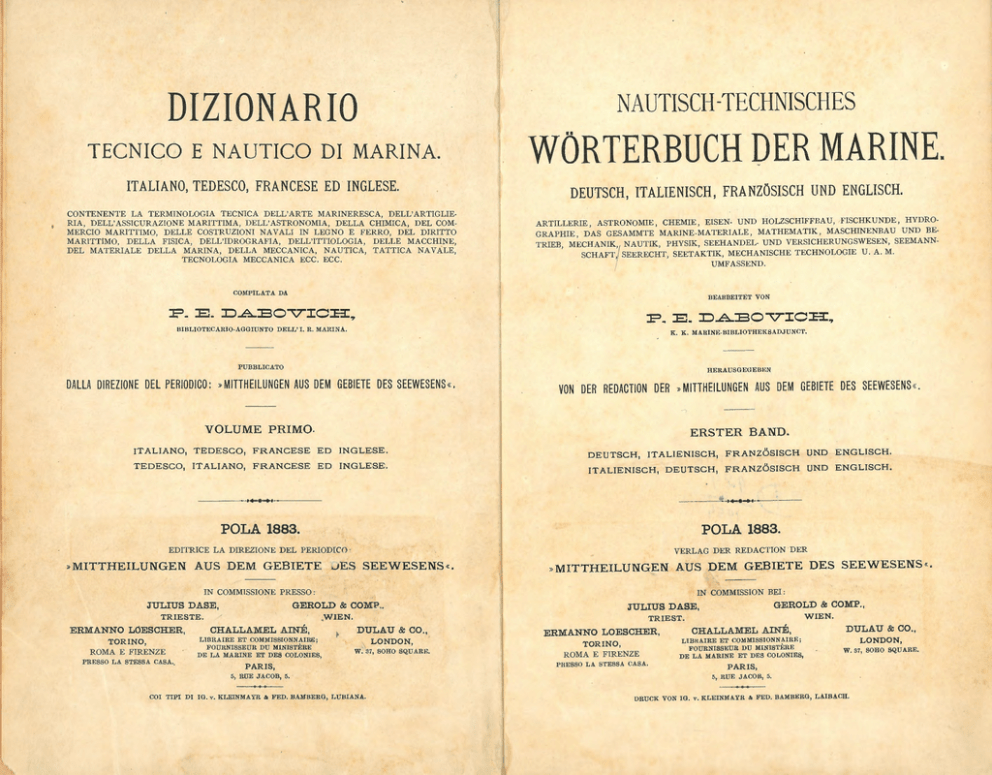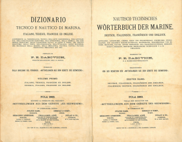 DIZIONARIO NAUTISCH-TECHNISCHES TECNICO E NAUTICO DI MARINA. WORTERBUCH DER MARINE. ITALIANO, TEDESCO, FRANCESE ED INGLESE. DEUTSCH, ITALIENISCH, FRANZOSISCH UND ENGLISCH. CONTENENTE LA TERMINOLOGIA TECNICA DELL'ARTE MARINERESCA, DELL'ARTIGLIERIA, DELL'ASSTCURAZIONE MARITI'IMA, DELL'ASTRONOMIA, DELLA CHIMICA, DEL COMMERCIO MARITTIMO, DELLE COSTRUZIONI NA VALI IN LEG NO E FERRO, DEL D!RITTO MARTTTIMO, DELLA FISICA, DELL'IDROGRAFIA, DELL'ITTIOLOGIA, DELLE MACCHINE, DEL MATERIALE DELLA MARINA, DELLA MECCANICA, NAUTICA, TATT!CA NAVALE, TECNOLOGIA MECCANICA ECC. ECC . ARTILLERIE, ASTRONOMIE, CHEMIE, EISEN- UND HOLZSCHIFFBAU, FISCHKUNDE, HYDROGRAPHIE, DAS GESAMMTE MAR!NE-MATERTALE, MATHEMATIK, MASCHTNENBAU UND BETRIEB, MECHANIK, NAUTIK, PHYSIK, SEEHANDEL- UND VERSICHERUNGSWESEN, SEEMANNSCHAFT,! SEERECHT, SEETAKTIK, MECHANISCHE TECHNOLOGIE U. A. M. UMFASSEND. COMPILATA DA BEARBEJTET VON J?. E. D.A..EO""'VJ:C::S:::., J?. E. D..A..EO""'VJ:C::S:::., BillLIOTECARJO-AGGIUNTO DELL' I. R. MARINA. K. K. MARINB-BIBLIO'l'HEKSADJUNCT. PUBBLICATO HERAUSGEUBBJON DALLA DIREZIONE DEL PERIODICO: » MITTHEILUNGEN AUS DEM GEBI ETE DES SEEWESENS«. VON DER REDACTION DER » MITTHEILUNGEN AUS DEM GEBI ETE DES SEEWESENS«. VOLUME PRIMO. ERSTER BAND. ITALIANO, TEDESCO, FRANCESE ED INGLESE. DEUTSCH, ITALIENISCH, FRANZOSISCH UND ENGLISCH. TEDESCO, ITALIANO, FRANCESE ED INGLESE. ITALIENISCH, DEUTSCH, FRANZOSISCH UND ENGLISCH. POLA 1883. POLA 1883. EDITRICE LA DIREZIONE DEL PERIODICO VERLAG DER REDACTION DER »MITTHEILUNGEN AUS DEM GEBIETE ..JES SEEWESENS«. »MITTHEILUNGEN AUS DEM GEBIETE DES SEEWESENS«. IN COMMISSIONE PRESSO: IN COMMISSION BEI: JULIUS DASE, GEROLD & COMP .. TRIESTE. .WIEN. JULIUS DASE, GEROLD & COMP., TRIEST. WIEN. ERMANNO LOESCHER, CHALLAMEL AlNE, DULAU & CO., ERMANNO LOESCHER, CHALLAMEL AlNE, DULAU & CO., TORINO, ROMA E FIRENZE LIBRAlRE ET COMMISSlONNAIRE; FO URNISSEUR DU MINISTERE DE LA MARINE E'l' DES COLONIES, LONDON, TORINO, ROMA E FIRENZE LIBHAIRE ET COMMISSIONNAIRB; FOURNISSEUR DU MINIS'l'ERE DE LA MARINB ET DES COLONIRS, W. 37, SOHO SQUARE. PRESSO LA STESSA CASA •. W . 37, SOHO SQUARE. PARIS, 5, RUE JACOB, 5. COl TIP! DI lG. v. KLEINMAYR & FED. BAMBERG, LUBIANA. PHESSO J,A STESSA CASA. LONDON, PARIS, 5 1 RUE J ACOH, 5. DRUCK VON IG. v. KLEINMAYR & FED. BAMBERG, LAIBACH. Toppo Toppo m., vedi »Soslt!gno di punta di tanzio«. Top po m. l Der Toppo l T o p p o 1 'I'opo. Toppreep n. ; Ladestag n. (Tak!.) 1 Guida [ CandelizzaJ per pemo/i dei parancl!i per imbarcare le lance o p,•r pm'ancld di straglio l Maroquin 1 Trialic sta!J. Toppsaltester m. (D. Mar.), s. "Marsunter· ofJ-izier«. Toppsegel n., s. »Segel 37 und 89«. Toppsegelschoner m., s. u. »Schoner«. Toppsgast m. (D. Mar.), s. »Marsgast«. Toppskadett m. (D. Mar.), s. u. »Caclet«. Toppstander m., s. »Commoclorstancler«. Topptakler m. pl. (D. Mar.) (Bordel.) 1 Cabbie1'i delle c~lfe l G a b i er s cl e s h u n e s 1 Top rijlemen. Topp und Take!. Vor - l A secco di vele 1 A-mats et a-cordes l UndM· bare po les; a-hull; hull-to. Vor Topp l_!nd Take! sein 1 Ess<!re tt secco di vele 1 E tr e 1t s e e cl e v o i l e s 1 To be under bare poles. Sich vor Topp und Take! legen Metle re a secco; 1nettere ttJta tzave a secco di vele l Mettre 1t s ec, a miits et a cordes; mettre les voiles cledansl To hand or take in all sails for 8Cudding. Toppwimpel m., s. u. »Vvimpel«. ToppwUrfel m. eines Mastes oder einer Stilnge lll1ascltio superiore, mase/tio, dado, taceo per la testa di moro d'wt a!bcro {Mincioto] 1 Tenon; tenon pour le chouque 1 (Top-)te11on. Torba f. 1 Der Torf 1 Tourbe l Peat; twj. Torcere tm cavo, vedi » Commetkre ztlt cavo«. Torchio m. l Die Presse 1 Pr e s s e 1 Pres::;. Vedi ane/te sotto »Strettoio«. Torcia f. d,z segnali 1 Die Signalfackel 1 Torche de signaux 1 Signal torch. · Torcitoio m. [Torco!o m.] per Jare legature ( Attr.) l Der Dreher; die span ische Wincle 1 Tresillon 1 Turniu,r7 fid; heave1·. Torcitoio m. da corderia (Fun.) 1 Der Dreher 1 Mani v elle d u co rd ic r 1 L aying-!took. Torcitura f. d'un cm'o 1 Der Schlag eines Tanes l Commettage de corclages 1 Lay, twist-ing of a I'Ope. Cavo 7/t, cite Ita troppa torcitttra. 1 Krapp geschlagenes Tau 1 Cordage commis s er re 1 Shor·t-laid rope. [To reolo m.], vedi » Torcitoio«. Tordalk m. (Orn.), s. »Ping-ttinus torda«. [Tordo m. de mar] (Itt.), vcdi "Labrus turdus«. Tore/li m. pl. (Quairate f. pl.) [Pa nice/li m. pl.) l Die Kielplanken 1 Virure s de g a b or cl 1 Gm·bom·d-stralces. Tore/fi e sopratorel!i 1 Die Kielgii.nge unci elie anliegenclen Gange 1 Gabords Torntau 'l'orniture 1100 et bordages adjacents 1 Torntau n. ; Tiirntau n.; Riickhalttau n. Ritemt!a; cavo di n'tegno 1 Retenue Gw ·/Joard and acljoining stmkes. Torf m., s. >Torba«. Checlc-rope; guy. Torntan, Riickhalttan des Schlittens zum Ablaufenlassen eines Schiffes 1 Ritenula (Batticulo) del/'invasatura 1 B o ss e du berceau; cable de retenue i Torfkohle f., s. u. »Kahle«. Tormentare (Art.) 1 Tormentiren 1 T o ur . m e nter 11b st min violentl!J; to hurt. Tormentare cd ajfaticare il nemic,, 1 Den Feind beunruhigen unci ermiiclen 1 Ha ras s er l' e n n e m i l 'l'u harass the en nem!/. Tornado m. (Meteor.) l Remo/ino 1 Tornade l Tur-nado. Torna l'arganol,' Svim !'arglllw! 1 (Gangspil! zurl\ck 1) l Devirez au cabestan! 1 Lawwhing rope. Toro 7/t, (Ast7-.) 1 Der Stier Taurus; bull. Walk baclc tlte capstan! Torpedermaat l'i,qger to1-pedo; spcw tor1Jerlo; bow-pole tm·pedo. Torpl'dz1te derivante l Die Treibmine Torpille 1 1 Der Exercirtorpedo ITorpille d' ex e rei ce 1 Dummy torpedo. Torpedim fis sa; mina f. subacquea l Die Seemine 1 Torpille fixe; mine so ns-marine 1 Submarine mine; sta#o- nrn'!J tm·pedo. Tm-pedz0ne fissa appoggiata sul fondo dell'acqua; ginnoto m. 1 Die Grunclmine l bank mit wechselnclem Umschwung T o ur a v i t e s s e v ar i a b l e 1Lrtthe with Copeanx de tour l derive remorquee; torpille clivergente 1 Slidc-lathe. Tontio a pedale l Die Fn ssdrehbank 1 Tour au pied 1 Foot-la