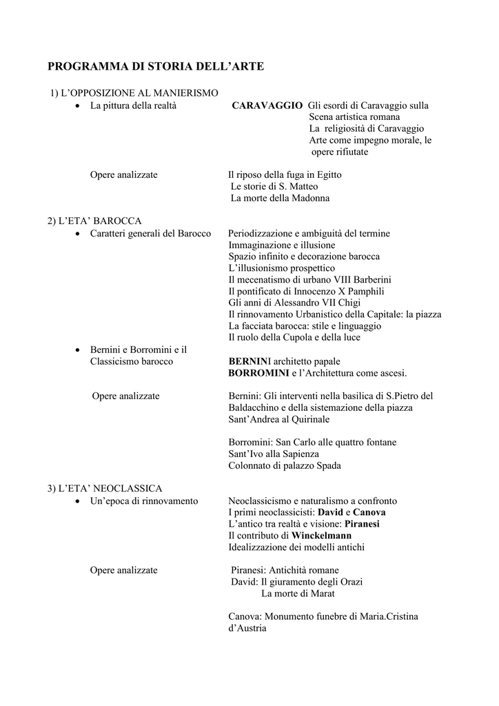 PROGRAMMA DI STORIA DELL’ARTE 1) L’OPPOSIZIONE AL MANIERISMO • La pittura della realtà Opere analizzate 2) L’ETA’ BAROCCA • Caratteri generali del Barocco • Bernini e Borromini e il Classicismo barocco Opere analizzate CARAVAGGIO Gli esordi di Caravaggio sulla Scena artistica romana La religiosità di Caravaggio Arte come impegno morale, le opere rifiutate Il riposo della fuga in Egitto Le storie di S. Matteo La morte della Madonna Periodizzazione e ambiguità del termine Immaginazione e illusione Spazio infinito e decorazione barocca L’illusionismo prospettico Il mecenatismo di urbano VIII Barberini Il pontificato di Innocenzo X Pamphili Gli anni di Alessandro VII Chigi Il rinnovamento Urbanistico della Capitale: la piazza La facciata barocca: stile e linguaggio Il ruolo della Cupola e della luce BERNINI architetto papale BORROMINI e l’Architettura come ascesi. Bernini: Gli interventi nella basilica di S.Pietro del Baldacchino e della sistemazione della piazza Sant’Andrea al Quirinale Borromini: San Carlo alle quattro fontane Sant’Ivo alla Sapienza Colonnato di palazzo Spada 3) L’ETA’ NEOCLASSICA • Un’epoca di rinnovamento Opere analizzate Neoclassicismo e naturalismo a confronto I primi neoclassicisti: David e Canova L’antico tra realtà e visione: Piranesi Il contributo di Winckelmann Idealizzazione dei modelli antichi Piranesi: Antichità romane David: Il giuramento degli Orazi La morte di Marat Canova: Monumento funebre di Maria.Cristina d’Austria 4) IL ROMANTICISMO • Il mestiere dell’Artista Il romanticismo: difficoltà di definizione Linea e colore in pittura Romanticismo e individualità Ideali romantici e istanze nazionali Una molteplicità di contenuti ed espressioni L’antiaccademismo. Il Pittoresco e il Sublime “Irregolare” contro “Finito Nuovi criteri estetici Il Sublime: la “risonanza di un animo grande” Dall’oggetto al soggetto Classicismo e verità L’osservazione della natura Neomediovalismo in Architettura La riscoperta delle cattedrali Opere analizzate Friedrich: Il monaco in riva al mare Turner: L’incendio della Camera dei Lords Constable: Il mulino di Flatford Gericault: La zattera della Medusa Delacroix: La libertà che guida il popolo La critica della città industriale 5) REALISMO E IMPRESSIONISMO • Verso un moderno sistema dell’Arte Un nuovo assetto politico, economico e sociale Urbanistica e Architettura alle prese con la modernità Le tendenze artistiche Pittura e fotografia Accademie e successione I Preraffaelliti Macchiaioli e impressionisti La rappresentazione del vero Tra Realismo e Impressionismo La pittura en plen air: Monet Il primato dell’occhio Rappresentare la vita moderna:Manet e Renoir Memoria e ragione: Cezanne Dall’Eclettismo al Razionalismo Costruttivo in Architettura La diffusione del gusto Gli esiti delle mescolanze eclettiche Le interpretazioni storiografiche Le stazioni ferroviarie, luogo emblematico dell’innovazione urbana La bellezza della razionalità costruttiva Opere analizzate Manet: La colazione sull’erba Olimpia Monet: La Cattedrale di Ruen 6) POSTIMPRESSIONISMO E AVANGUARDIE STORICHE • Artisti e mercato negli anni del postimpressionismo La crisi della scuola La formazione privata degli artisti Nuovi Salon Il superamento dell’Impressionismo Il Puntinismo Gauguin e van Gogh I Simbolisti La diffusione del Simbolismo Spunti di Novità I divisionisti alla triennale del 1891 Il novecento delle avanguardie Opere analizzate L’Espressionismo tedesco Die Brucke L’Espressionismo e la nascita delle avanguardie Matrici romantiche dell’avanguardia I Fauves La Brucke Il Cubismo: una nuova concezione dello spazio Figurativo Le fasi del Cubismo L’Avanguardia futurista La diffusione del Futurismo Il Cavaliere Azzurro: dall’Espressioismo all’Astrattismo Gli sviluppi del Cubismo G.G. Eiffel: La torre Eiffel G. Moreau: L’apparizione P.Gauguin: L’orana Maria V. van Gogh: La camera da letto P. Cezanne: La casa dell’impiccato E. Munch: Il Grido H. Matisse: La gioia di vivere La danza E.L. Kirchner: Scena di strada berlinese P. Ricasso: Les deimoiselles d’Avignon Bicchiere, chitarra e bottiglia V. Boccioni: La città che sale Forme uniche della continuità dello spazio