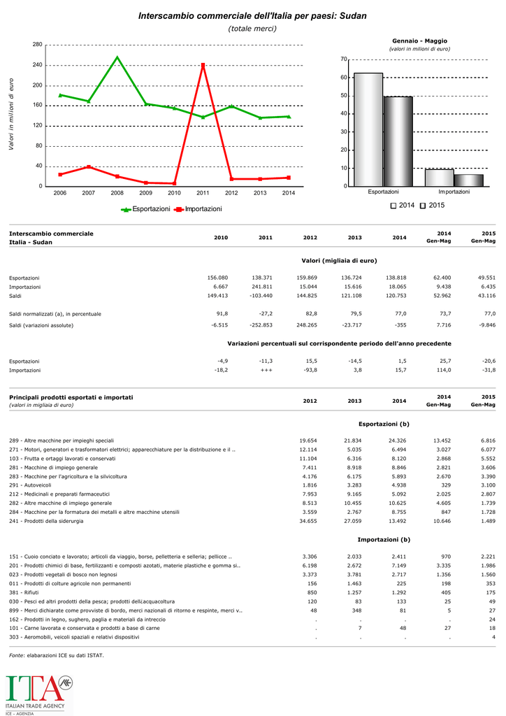 Interscambio commerciale dell'Italia per paesi: Sudan (totale merci) Gennaio - Maggio (valori in milioni di euro) 280 70 Val ori i n mi l i oni di euro 240 60 200 50 160 40 120 30 80 20 40 10 0 0 2006 2007 2008 2009 2010 Esportazioni Interscambio commerciale Italia - Sudan 2011 2012 2013 Esportazioni 2014 Im portazioni 2014 Importazioni 2010 2011 2012 2013 2014 2015 2014 2015 Gen-Mag Gen-Mag 49.551 Valori (migliaia di euro) Esportazioni 156.080 138.371 159.869 136.724 138.818 62.400 Importazioni 6.667 241.811 15.044 15.616 18.065 9.438 6.435 149.413 -103.440 144.825 121.108 120.753 52.962 43.116 91,8 -27,2 82,8 79,5 77,0 73,7 77,0 -6.515 -252.853 248.265 -23.717 -355 7.716 -9.846 Saldi Saldi normalizzati (a), in percentuale Saldi (variazioni assolute) Variazioni percentuali sul corrispondente periodo dell'anno precedente Esportazioni -4,9 -11,3 15,5 -14,5 1,5 25,7 -20,6 Importazioni -18,2 +++ -93,8 3,8 15,7 114,0 -31,8 2012 2013 2014 Principali prodotti esportati e importati (valori in migliaia di euro) 2014 2015 Gen-Mag Gen-Mag Esportazioni (b) 289 - Altre macchine per impieghi speciali 19.654 21.834 24.326 13.452 6.816 271 - Motori, generatori e trasformatori elettrici; apparecchiature per la distribuzione e il .. 12.114 5.035 6.494 3.027 6.077 103 - Frutta e ortaggi lavorati e conservati 11.104 6.316 8.120 2.868 5.552 281 - Macchine di impiego generale 7.411 8.918 8.846 2.821 3.606 283 - Macchine per l'agricoltura e la silvicoltura 4.176 6.175 5.893 2.670 3.390 291 - Autoveicoli 1.816 3.283 4.938 329 3.100 212 - Medicinali e preparati farmaceutici 7.953 9.165 5.092 2.025 2.807 282 - Altre macchine di impiego generale 8.513 10.455 10.625 4.605 1.739 284 - Macchine per la formatura dei metalli e altre macchine utensili 3.559 2.767 8.755 847 1.728 34.655 27.059 13.492 10.646 1.489 241 - Prodotti della siderurgia Importazioni (b) 151 - Cuoio conciato e lavorato; articoli da viaggio, borse, pelletteria e selleria; pellicce .. 3.306 2.033 2.411 970 2.221 201 - Prodotti chimici di base, fertilizzanti e composti azotati, materie plastiche e gomma si.. 6.198 2.672 7.149 3.335 1.986 023 - Prodotti vegetali di bosco non legnosi 3.373 3.781 2.717 1.356 1.560 011 - Prodotti di colture agricole non permanenti 156 1.463 225 198 353 381 - Rifiuti 850 1.257 1.292 405 175 030 - Pesci ed altri prodotti della pesca; prodotti dell¿acquacoltura 120 83 133 25 49 48 348 81 5 27 162 - Prodotti in legno, sughero, paglia e materiali da intreccio . . . . 24 101 - Carne lavorata e conservata e prodotti a base di carne . 7 48 27 18 303 - Aeromobili, veicoli spaziali e relativi dispositivi . . . . 4 899 - Merci dichiarate come provviste di bordo, merci nazionali di ritorno e respinte, merci v.. Fonte: elabarazioni ICE su dati ISTAT. (a) Il saldo normalizzato è dato dal rapporto fra il saldo commerciale e la somma di esportazioni e importazioni. (b) Gruppo Ateco 2007 - Graduatoria secondo l'ultimo periodo della serie. Interscambio commerciale dell'Italia per paesi: DETTAGLIO CLASSIFICAZIONI MERCEOLOGICHE Il gruppo ATECO " 011 - Prodotti di colture agricole non permanenti " comprende: - 01111 - Cereali (escluso il riso) - 01112 - Semi oleosi - 01113 - Legumi da granella - 01120 - Riso - 01130 - Ortaggi (inclusi i meloni) in foglia, a fusto, a frutto, in radici, bulbi e tuberi (escluse barbabietola da zucchero e patate) - 01133 - Barbabietola da zucchero - 01134 - Patate - 01140 - Canna da zucchero - 01150 - Tabacco - 01160 - Piante per la preparazione di fibre tessili - 01190 - Fiori, anche recisi, e sementi per fiori - 01199 - Piante da foraggio e di altre colture non permanenti Il gruppo ATECO " 023 - Prodotti vegetali di bosco non legnosi " comprende: - 02300 - Prodotti vegetali di bosco diversi dal legno Il gruppo ATECO " 030 - Pesci ed altri prodotti della pesca; prodotti dell¿acquacoltura " comprende: - 03000 - Prodotti della pesca e dell'acquacoltura in acqua di mare, salmastra,lagunare o in acque dolci Il gruppo ATECO " 101 - Carne lavorata e conservata e prodotti a base di carne " comprende: - 10110 - Carne non di volatili e prodotti vari della macellazione (pellami, strutto, frattaglie ecc.) - 10120 - Carne di volatili e prodotti della loro macellazione - 10130 - Prodotti a base di carne (inclusa la carne di volatili) Il gruppo ATECO " 103 - Frutta e ortaggi lavorati e conservati " comprende: - 10310 - Patate lavorate e conservate - 10320 - Succhi di frutta e di ortaggi - 10390 - Frutta e ortaggi lavorati e conservati (esclusi i succhi di frutta e di ortaggi) Il gruppo ATECO " 151 - Cuoio conciato e lavorato; articoli da viaggio, borse, pelletteria e selleria; pellicce preparate e tinte " comprende: - 15110 - Cuoio e pelle conciati e preparati; pellicce tinte e preparate - 15120 - Altri articoli da viaggio, borse e simili, pelletteria e selleria Il gruppo ATECO " 162 - Prodotti in legno, sughero, paglia e materiali da intreccio " comprende: - 16210 - Fogli da impiallacciatura e pannelli a base di legno - 16220 - Pavimenti in parquet assemblato - 16231 - Porte e finestre in legno (escluse porte blindate) - 16232 - Altri elementi in legno e falegnameria per l'edilizia - 16240 - Imballaggi in legno - 16291 - Altri prodotti vari in legno (esclusi i mobili) - 16292 - Prodotti della lavorazione del sughero - 16293 - Articoli in paglia e materiali da intreccio - 16294 - Cornici per specchi, fotografie e tele da pittura Il gruppo ATECO " 201 - Prodotti chimici di base, fertilizzanti e composti azotati, materie plastiche e gomma sintetica in forme primarie " comprende: - 20110 - Gas industriali - 20120 - Coloranti e pigmenti - 20130 - Altri prodotti chimici di base inorganici - 20140 - Altri prodotti chimici di base organici - 20150 - Fertilizzanti e composti azotati (escluso il compost) - 20160 - Materie plastiche in forme primarie - 20170 - Gomma sintetica in forme primarie Il gruppo ATECO " 212 - Medicinali e preparati farmaceutici " comprende: - 21200 - Medicinali ed altri preparati farmaceutici Il gruppo ATE