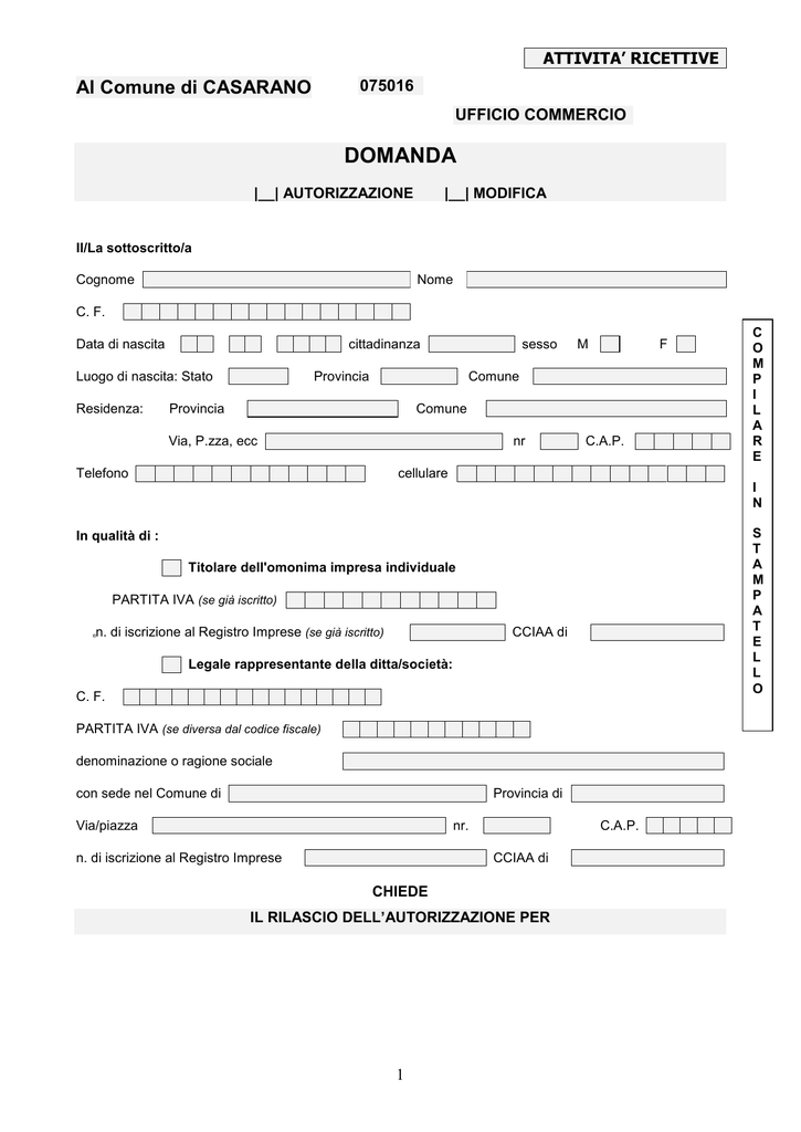 ATTIVITA’ RICETTIVE 075016 Al Comune di CASARANO UFFICIO COMMERCIO DOMANDA |__| AUTORIZZAZIONE |__| MODIFICA Il/La sottoscritto/a Nome Cognome C. F. Data di nascita cittadinanza Luogo di nascita: Stato Residenza: sesso Provincia M F Comune Comune Provincia nr Via, P.zza, ecc C.A.P. C O M P I L A R E cellulare Telefono I N S T A M P A T E L L O In qualità di : Titolare dell'omonima impresa individuale PARTITA IVA (se già iscritto) n. di iscrizione al Registro Imprese (se già iscritto) CCIAA di Legale rappresentante della ditta/società: C. F. PARTITA IVA (se diversa dal codice fiscale) denominazione o ragione sociale Provincia di con sede nel Comune di nr. Via/piazza C.A.P. CCIAA di n. di iscrizione al Registro Imprese CHIEDE IL RILASCIO DELL’AUTORIZZAZIONE PER 1 ATTIVITA’ RICETTIVE PARTE A – INSEDIAMENTO NUOVA STRUTTURA L’autorizzazione amministrativa per l’apertura di una struttura ricettiva |__| albergo, |__| dipendenza, |__| residenza turistico alberghiera, (specificare la denominazione) ___________________________________ Ubicata in via _______________________________________ n. ______ Foglio _______ partic. ________ A) Composta da CAMERE E SERVIZI COMUNI Con bagno o doccia e gabinetto privato a 1 a 2 letto letti B) Con solo bagno o doccia privato a 1 a 2 letto letti Con solo gabinetto privato a 1 letto a 2 letti APPARTAMENTI monolocali con cucina Piano numero Ricettività totale : Con acqua corrente calda e fredda a 1 a 2 letto letti Con acqua corrente fredda Senza acqua corrente a 1 letto a 1 letto a 2 letti a 2 letti Totale camere a 1 letto Totale letti a 2 letti 2 camere Posti letto Letti aggiunti Servizi comuni Bagni o docce 3 o più camere Con cucina Senza cucina Con cucina Senza cucina numero Posti letto numero Posti letto camere n. |__|__|__| Gabinetti letti n. |__|__|__| bagni n. |__|__|__| Periodo d’apertura |__| tutto l’anno |__| stagionale L’attività |__| prevede dal |__|__| |__|__| |__|__|__|__| al |__|__| |__|__| |__|__|__|__| |__| non prevede la somministrazione alle sole persone alloggiate. PARTE B – MODIFICA STRUTTURA RICETTIVA L’autorizzazione amministrativa per la modifica di una struttura ricettiva |__| albergo, |__| dipendenza, |__| residenza turistico alberghiera, (specificare la denominazione) ___________________________________ Ubicata in via _______________________________________ n. ______ Foglio _______ partic. ________ Dotata di regolare autorizzazione amministrativa n. |__|__|__| rilasciata in data |__|__| |__|__| |__|__|__|__| C) Composta da CAMERE E SERVIZI COMUNI Con bagno o doccia e gabinetto privato a 1 a 2 letto letti D) Piano Con solo bagno o doccia privato a 1 a 2 letto letti Con solo gabinetto privato a 1 letto a 2 letti APPARTAMENTI monolocali con cucina numero Ricettività totale : Posti letto Con acqua corrente calda e fredda a 1 a 2 letto letti Con acqua corrente fredda Senza acqua corrente a 1 letto a 1 letto a 2 letti a 2 letti Totale camere a 1 letto Letti aggiunti Totale letti a 2 letti 2 camere Servizi comuni Bagni o docce 3 o più camere Con cucina Senza cucina Con cucina Senza cucina numero Posti letto numero Posti letto camere n. |__|__|__| letti n. |__|__|__| Gabinetti bagni n. |__|__|__| Periodo d’apertura |__| tutto l’anno stagionale dal |__|__| |__|__| |__|__|__|__| al |__|__| |__|__| |__|__|__|__| perfettamente|__| conscio delle responsabilità conseguenti alle dichiarazioni mendaci o alle false A tal fine attestazioni e dei loro effetti franon cuiprevede – oltre quelli eventuali di natura – l’adozione di sanzioni L’attività |__| prevede |__| la somministrazione allepenale sole persone alloggiate 2 ATTIVITA’ RICETTIVE AUTOCERTIFICAZIONE A tal fine perfettamente conscio delle responsabilità conseguenti alle dichiarazioni mendaci o alle false attestazioni e dei loro effetti fra cui il divieto di prosecuzione dell'attività nonché l'impossibilità della sua conformazione alla normativa vigente (Art. 76 D.P.R. 445/2000), compila e dichiara quanto previsto nelle rispettive sezioni: Il/La sottoscritto/a Nome Cognome C. F. Data di nascita cittadinanza Luogo di nascita: Stato Residenza: Provincia sesso M F Comune Comune Provincia nr Via, P.zza, ecc C.A.P. DICHIARA di non essere fallito e di non avere procedure fallimentari in corso; 1 2 di non aver riportato condanne penali e di non avere procedimenti penali in corso né provvedimenti amministrativi definitivi che non consentono l'esercizio o la continuazione dell'attività; 3 che non sussistono nei propri confronti e dei famigliari seco conviventi appresso indicati Nome Cognome C. F. Nome Cognome C. F. Nome Cognome C. F. cause di divieto, di decadenza o di sospensione di cui all’art. 10 della legge 575/65 (antimafia) Data FIRMA del Titolare o Legale Rappresentante L'autentica della firma non è richiesta se si allega copia di un valido documento di riconoscimento 3 ATTIVITA’ RICETTIVE QUADRO B AUTOCERTIFICAZIONE SOCIETÀ Il/La sottoscritto/a Nome Cognome C. F. Legale rappresentante della ditta/società: C. F. PARTITA IVA (se diversa dal codice fiscale) denominazione o ragione sociale con sede nel Comune di Provincia di Via/piazza nr. n. di iscrizione al Registro Imprese C.A.P. CCIAA di Costituita con atto del a rogito del Notaio Repertorio n. registrato a iscritta al Registro delle imprese della C.C.I.A.A. al n. organo amministrativo così composto (in caso di SNC riportare tutti i soci; in caso di SAS tutti i soci accomandatari n caso di SRL, SPA, SAP, Società Cooperativa ed Associazioni tutti i componenti dell'organo di amministrazione specificandone l'incarico ricoperto) Cognome Nome C. F. Cognome Nome C. F. Cognome Nome C. F. DICHIARA 1 Che la società rappresentata non si trova in stato di fallimento, di liquidazione, di concordato preventivo od in altre situazioni equivalenti ai sensi della vigente normativa né che a suo carico non è in corso procedimento per la dichiarazione di una di tali situazioni. 2 che nei confronti dei sogge