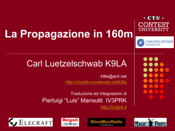 La Propagazione in 160m Carl Luetzelschwab K9LA [email protected] http://mysite.ncnetwork.net/k9la Traduzione ed integrazioni di Pierluigi “Luis” Mansutti IV3PRK http://iv3prk.it Premessa Carl Luetzelschwab K9LA è uno dei più autorevoli studiosi della propagazione ionosferica, con un particolare interesse per i 160m da lungo tempo collabora con l’ARRL e le maggiori riviste americane di radio; molto del materiale da lui pubblicato è disponibile sul suo sito http://mysite.ncnetwork.net/k9la da molti anni interviene nelle più importanti convention DX con presentazioni riguardanti la propagazione in 160m Questa presentazione, utilizzata da K9LA nella convention RSGB del 2010, è stata tradotta in italiano, modificata con la sua autorizzazione ed integrata con nuove pagine di miei commenti e grafici storici che, sulla base di 18 anni di esperienze, illustrano quello che ci si può attendere dai 160 metri in Italia. IV3PRK Contenuti della presentazione Breve aggiornamento sul ciclo 24° Principi fisici fondamentali Normale propagazione Osservazioni interessanti Previsioni per i 160m (o loro mancanza!) Conclusioni Situazione del ciclo solare 24° - Macchie solari L’attività delle macchie solari appare in buona ripresa Aggiornamento ciclo 24°- Indice Ap N.ro dei giorni in un mese con Indice Ap < 7 (Bleu) vs. n.ro omogeneo delle macchie solari (rosso) dalla fine del ciclo 21° all’inizio del ciclo 24° L’attività geomagnetica più calma che abbiamo mai visto! Introduzione C’è ancora molto che non conosciamo sulla propagazione in 160 metri! Il settore principale dove siamo privi di sufficienti conoscenze è quello della bassa ionosfera, cioè la regione D e la parte inferiore dello strato E in realtà non disponiamo di alcun parametro giornaliero collegato a questa zona della ionosfera Quindi non aspettatevi che questa presentazione sia “La Rivelazione dei Segreti dei 160 metri.” Un consiglio : per “capire” meglio la propagazione dei 160m, bisogna essere molto attivi in 160 m. K9LA Principi Fondamentali di Fisica Cosa ci vuole per fare un QSO? Una sufficiente ionizzazione per rimandare il segnale a Terra La MUF non è un problema a 1.8 MHz anche nel cuore della notte al minimo del ciclo solare (Queste sono le MUF F0F2) overhead Sun Percorso del segnale in relazione all’angolo d’irradiazione verticale 40o 30o 20o 10o 0o 400 km 300 km 200 km 100 km 1000 km 2000 km ray trace on 1.8 MHz on path across the northern tier of the US at solar minimum around midnight Di notte e con bassi angoli d’irradiazione entra ancora in gioco lo strato E foE (freq.critica verticale) è a circa 0.4 MHz di notte Ad angoli inferiori a circa 7o il segnale è rifratto verso Terra dallo strato E Ad angoli superiori il segnale non perfora, ma viene rifratto dallo strato F Cosa ci vuole per fare un QSO? Bassi indici di attività geomagnetica Condizione fondamentale per i percorsi alle medie ed alte latitudini L’influenza è minore sui percorsi trans-equatoriali 1. Vento Solare 2. Ovale dell’Aurora 3. Indice K ( ed A ) 4. Osservatori Canadesi (Tnx VE6WZ) Cosa ci vuole per fare un QSO? Un segnale abbastanza forte da essere copiabile L’assorbimento ionosferico a 1.8 MHz è un ostacolo fisso e reale, molto elevato, che tende a ridurre il segnale sotto la soglia del rumore Il rumore atmosferico ed il rumore locale a volte sono proibitivi S7 Questo è il grafico tipico del rumore locale, prodotto dalle attività umane, e massimo in 160m S5 S3 S1 1.8 MHz ====== La prima necessità per l’attività DX in 160m. è quella di antenne riceventi a basso rumore Rifrazione ed Assorbimenti La rifrazione e gli assorbimenti sono inversamente proporzionali al quadrato della frequenza Quindi per un dato profilo di densità di elettroni Più bassa è la frequenza, maggiore la rifrazione (curvatura del segnale irradiato) Più bassa è la frequenza, maggiore l’assorbimento che lo stesso raggio subisce La RF in 160m viene curvata maggiormente e subisce i massimi assorbimenti Percorso del segnale sui 28 MHz Le componenti ordinaria e straordinaria dell’onda (o-wave ed x-wave) seguono quasi lo stesso percorso o-wave ed x-wave subiscono più o meno le stesse perdite totali Indice di rifrazione praticamente uguale La componente straordinaria (X-wave) si piega leggermente di più Gli assorbimenti sono gli stessi Apogeo ~ 240 km Sulle bande HF più alte la “o-wave” e l’ “x-wave” si propagano allo stesso modo Percorso del segnale su 1.8 MHz La “o-wave” e la “x-wave” non seguono lo stesso percorso Indice di rifrazione significativamente diverso La componente straordinaria si piega molto di più La “o-wave” e la “x-wave” non subiscono lo stesso ammontare di perdite Assorbimenti molto diversi La componente straordinaria non viene presa in considerazione quando la frequenza operativa è vicino alla “gyro-frequenza” degli elettroni Generalmente solo la “o-wave” è utile in 160m, e la polarizzazione del segnale alle alte e medie latitudini tende ad essere elittica ( verticale) che si trova fra .7 e 1.7 MHz in tutto il mondo Apogeo della o-wave ~ 170 km L’onda dei 160m non va molto in alto nella ionosfera Che differenza dagli 80 metri ! da PROPLAB PRO Entrambi i segnali partono con un angolo di elev. 15° Quello di 1.8 MHz viene rifratto a 164km e raggiunge terra a 1.149 km (primo salto) dopo aver perso 10.8 dB per assorbimenti Quello di 3.8 MHz viene rifratto a 215km e raggiunge terra alla distanza di 1.531 km dopo aver perso solo 2.1 dB per assorbimenti. Quindi per coprire una distanza di 9.300 km (da qui al Giappone od alla West Coast) con normale propagazione “multi hop” sono necessari: • 6 salti in 80 m. con un totale di perdite totale per assorbimenti di 12.8 dB • 8 salti in 160 m. con un totale di perdite per assorbimenti di 87.4 dB Multi-hop in 160m In seguito alle precedenti slides è evidente che la propagazione multi-hop in 160m avviene con salti che sono brevi e c