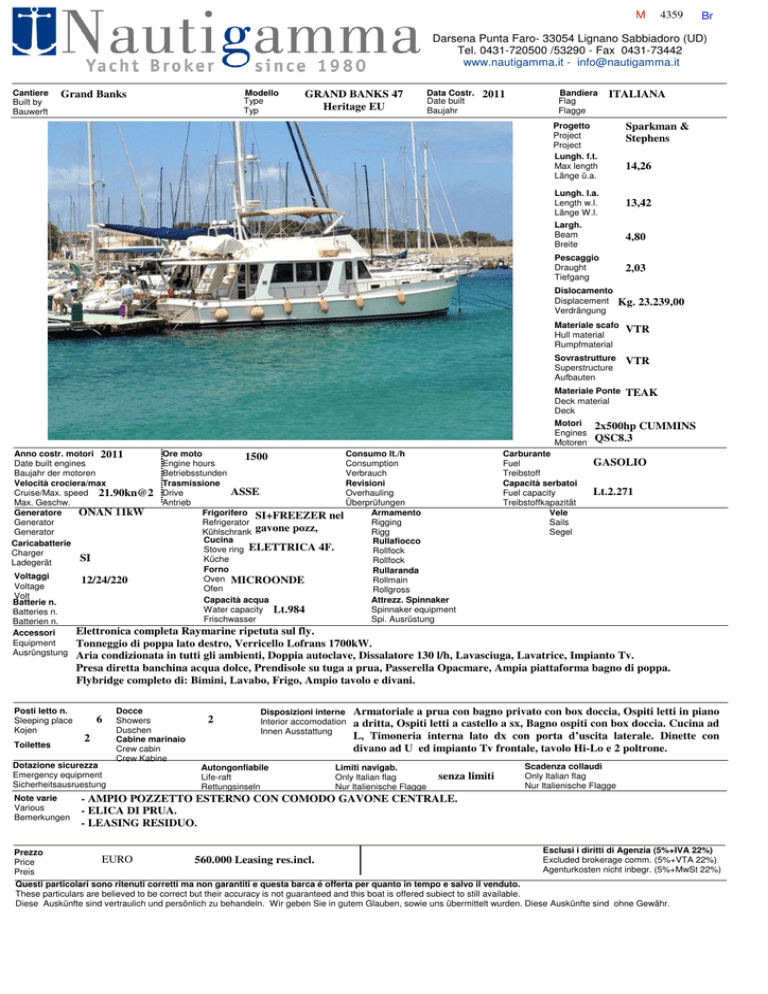 M 4359 Br Darsena Punta Faro- 33054 Lignano Sabbiadoro (UD) Tel. 0431-720500 /53290 - Fax 0431-73442 www.nautigamma.it - [email protected] Cantiere Built by Bauwerft Modello Type Typ Grand Banks GRAND BANKS 47 Heritage EU Data Costr. Date built Baujahr 2011 Bandiera Flag Flagge ITALIANA Sparkman & Stephens Progetto Project Project Lungh. f.t. Max length Länge ü.a. Lungh. l.a. Length w.l. Länge W.l. 13,42 Largh. Beam Breite 4,80 Pescaggio Draught Tiefgang 2,03 Dislocamento Displacement Verdrängung Voltaggi Voltage Volt Batterie n. Batteries n. Batterien n. Accessori Equipment Ausrûngstung Posti letto n. Sleeping place Kojen Toilettes 12/24/220 VTR Sovrastrutture Superstructure Aufbauten VTR Materiale Ponte Deck material Deck TEAK Prezzo Price Preis Carburante Fuel Treibstoff Capacità serbatoi Fuel capacity Treibstoffkapazität Vele Sails Segel 2x500hp CUMMINS QSC8.3 GASOLIO Lt.2.271 Elettronica completa Raymarine ripetuta sul fly. Tonneggio di poppa lato destro, Verricello Lofrans 1700kW. Aria condizionata in tutti gli ambienti, Doppia autoclave, Dissalatore 130 l/h, Lavasciuga, Lavatrice, Impianto Tv. Presa diretta banchina acqua dolce, Prendisole su tuga a prua, Passerella Opacmare, Ampia piattaforma bagno di poppa. Flybridge completo di: Bimini, Lavabo, Frigo, Ampio tavolo e divani. 6 2 Dotazione sicurezza Emergency equipment Sicherheitsausruestung Note varie Various Bemerkungen Ore moto Consumo lt./h 1500 Engine hours Consumption Betriebsstunden Verbrauch Trasmissione Revisioni ASSE Drive Overhauling Antrieb Überprüfungen Frigorifero SI+FREEZER nel Armamento Refrigerator Rigging gavone pozz, Kühlschrank Rigg Cucina Rullafiocco ELETTRICA 4F. Stove ring Rollfock Küche Rollfock Forno Rullaranda Oven MICROONDE Rollmain Ofen Rollgross Attrezz. Spinnaker Capacità acqua Water capacity Lt.984 Spinnaker equipment Frischwasser Spi. Ausrüstung Kg. 23.239,00 Materiale scafo Hull material Rumpfmaterial Motori Engines Motoren Anno costr. motori 2011 Date built engines Baujahr der motoren Velocità crociera/max Cruise/Max. speed 21.90kn@2 Max. Geschw. 400rpm ONAN 11kW Generatore Generator Generator Caricabatterie Charger SI Ladegerät 14,26 Docce Showers Duschen Cabine marinaio Crew cabin Crew Kabine 2 Disposizioni interne Interior accomodation Innen Ausstattung Autongonfiabile Life-raft Rettungsinseln Armatoriale a prua con bagno privato con box doccia, Ospiti letti in piano a dritta, Ospiti letti a castello a sx, Bagno ospiti con box doccia. Cucina ad L, Timoneria interna lato dx con porta d’uscita laterale. Dinette con divano ad U ed impianto Tv frontale, tavolo Hi-Lo e 2 poltrone. Limiti navigab. Only Italian flag Nur Italienische Flagge senza limiti Scadenza collaudi Only Italian flag Nur Italienische Flagge - AMPIO POZZETTO ESTERNO CON COMODO GAVONE CENTRALE. - ELICA DI PRUA. - LEASING RESIDUO. EURO 560.000 Leasing res.incl. Lire Esclusi i diritti di Agenzia (5%+IVA 22%) Excluded brokerage comm. (5%+VTA 22%) Agenturkosten nicht inbegr. (5%+MwSt 22%) Questi particolari sono ritenuti corretti ma non garantiti e questa barca é offerta per quanto in tempo e salvo il venduto. These particulars are believed to be correct but their accuracy is not guaranteed and this boat is offered subiect to still available. Diese Auskünfte sind vertraulich und persönlich zu behandeln. Wir geben Sie in gutem Glauben, sowie uns übermittelt wurden. Diese Auskünfte sind ohne Gewähr.