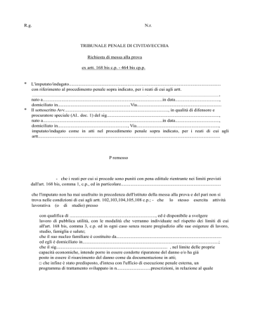 R.g. N.r. TRIBUNALE PENALE DI CIVITAVECCHIA Richiesta di messa alla prova ex artt. 168 bis c.p. - 464 bis cp.p. * L'imputato/indagato.................................................................................................................................. con riferimento al procedimento penale sopra indicato, per i reati di cui agli artt. ...............................................................................................................................................................................................................................................................................'....................................................................................................................................................................... 5 nato a......................................................................................................in data....................................., domiciliato in..............................................................Via........................................................................ * Il sottoscritto Avv........................................................................................, in qualità di difensore e procuratore speciale (Al.. doc. 1) del sig................................................................................................, nato a......................................................................................................in data....................................., domiciliato in..........................................................., Via......................................................................, imputato/indagato come in atti nel procedimento penale sopra indicato, per i reati di cui agli artt........................................................................................................................................................... P remesso - che i reati per cui si procede sono puniti con pena edittale rientrante nei limiti previsti dall'art. 168 bis, comma 1, c.p., ed in particolare..................................................................................... che l'imputato non ha mai usufruito in precedenza dell'istituto della messa alla prova e del pari non si trova nelle condizioni di cui agli artt. 102,103,104,105,108 c.p.; - che lo stesso esercita attività lavorativa (o di studio) presso con qualifica di ........................................................................., ed è disponibile a svolgere lavoro di pubblica utilità, con le modalità che verranno individuate nel rispetto dei limiti di cui all'art. 168 bis, comma 3, c.p. ed in ogni caso senza recare pregiudizio alle sue esigenze di lavoro, studio, famiglia e salute; che il suo nucleo familiare è costituito da.......................................................................................... ed egli è domiciliato in....................................................................................................................; che il sig............................................................................................... , nel limite delle proprie capacità economiche, intende porre in essere condotte riparatone del danno e/o ha già posto in essere il risarcimento del danno come da documentazione in atti; □ che infine è stato predisposto, d'intesa con l'ufficio di esecuzione penale esterna, un programma di trattamento sviluppato in n.............................prescrizioni, in relazione al quale l'imputato/indagato ha già espresso consenso, programma sulla base del quale sarà possibile eseguire la messa alla prova (doc. 2 ); □ ovvero che non essendo stato possibile ad oggi elaborare, d'intesa con l'ufficio di esecuzione esterna, un programma di trattamento, si allega attestazione rilasciata dall'Uepe competente, comprovante il deposito di richiesta di programma di trattamento ex art. 464 bis, comma 4, c.p.p., fornendo sin d'ora la disponibilità dell' imputato/indagato e del suo difensore a collaborare in tale attività. Altro: Tutto ciò premesso, il sottoscritto Chiede che l'Ili.mo Tribunale di Civitavecchia * voglia disporre la sospensione del procedimento penale e la messa alla prova del sig. * voglia prendere atto del deposito della suddetta domanda ex art. 464 bis, comma 4, c.p.p. e disponga rinvio in attesa della definizione del programma di trattamento e di invio del medesimo da parte dell'Uepe ai sensi dell'art. 141 ter, comma 4, disp. art., onde procedere alla sospensione del procedimento e alla messa alla prova. Si producono: Doc. 1) nomina del difensore e procura speciale; Doc. 2) programma di trattamento corredato della documentazione allegata alla domanda di trattamento e di consenso e/o attestazione dell'Uepe di deposito della domanda di trattamento ex art. 464 bis, comma 4, c.p.p. - Altro: □ L'ìmputato/indagato Sig. □ Il procuratore speciale Aw...........................................