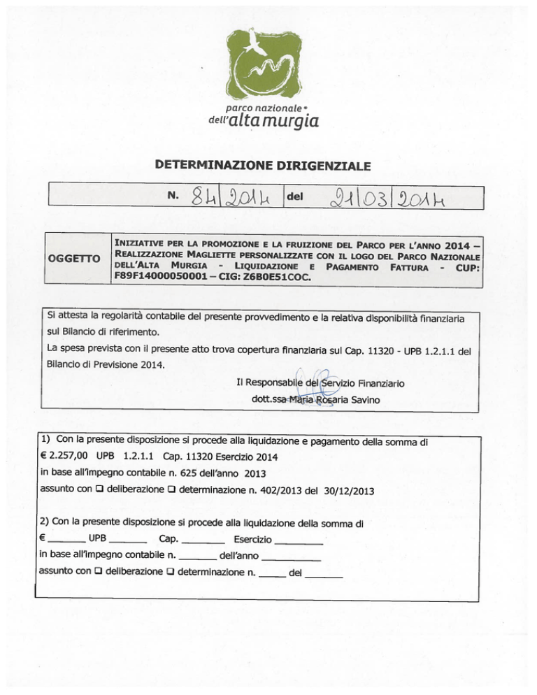 parco nazionale dell’alta murgia DETERMINAZIONE DIRIGENZIALE N. del INIZIATIVE PER LA PROMOZIONE E LA FRUIZIONE DEL PARCO PER L’ANNO 2014 REALIZZAZIONE MAGLIETTE PERSONALIZZATE CON IL LOGO DEL PARCO NAZIONALE DELL’ALTA MURGIA LIQUIDAZIONE E PAGAMENTO FATFURA CUP: — OGGETTO - F89F14000050001 — - CIG: Z6BOE51COC. Si attesta la regolarità contabile del presente prowedimento e la relativa disponibilità finanziaria sul Bilancio di riferimento. La spesa prevista con il presente atto trova copertura finanziaria sul Cap. 11320 Bilancio di Previsione 2014. , - UPB 1.2.1.1 del / Il Responsabile del Servizio Finanziario dott.ssaMfaria Savino 1) Con la presente disposizione si procede alla liquidazione e pagamento della somma di € 2.257,00 UPB 1.2.1.1 Cap. 11320 Esercizio 2014 in base all’impegno contabile n. 625 dell’anno 2013 assunto con IJ deliberazione LJ determinazione n. 402/2013 del 30/12/2013 2) Con la presente disposizione si procede alla liquidazione della somma di UPB Cap. Esercizio € in base all’impegno contabile n. dell’anno assunto con LJ deliberazione Li determinazione n. del parco nazionale dell’alta murgia IL DIRETTORE F.F. CONSIDERATO che ad oggi l’Ente Parco ha approvato il Bilancio di Previsione 2014 con deliberazione Presidenziale n. 22/2013 del 20/12/2013, e che ai sensi dell’art. 22 comma 2 del Regolamento di Contabilità dell’Ente è consentita la gestione provvisoria, commisurando i dodicesimi agli stanziamenti previsti dall’ultimo bilancio di previsione regolarmente approvato; VISTA la Determinazione Dirigenziale n. 402/2013 del 30/12/2013 con la quale è stata impegnata la somma di € 40.000,00 sul Cap. 11320 “Campagna di comunicazione ed informazione sul Parco” del Bilancio di previsione 2013, per la realizzazione del materiale informativo e divulgativo dell’Ente, nonché per la realizzazione di gadget da distribuire nell’ambito delle manifestazioni che si andranno a realizzare nel corso dell’anno 2014; CONSIDERATO che nella Relazione programmatica allegata al Bilancio di previsione 2014, approvato con Deliberazione Presidenziale n. 22/2013 del 20/12/2013, è stato stabilito che l’anno 2014 sarà caratterizzato da una serie di iniziative per la promozione e la fruizione del Parco e a titolo esemplificativo si riportano di seguito alcune iniziative: 3A edizione di “UP Festa del Parco Nazionale dell’Alta Murgia” 3t edizione del “Festival della Ruralità” Iniziative di fruizione del Castel del Monte d’intesa con la Direzione Regionale per i Beni e le Attività Culturali, con la Sovrintendenza per il Paesaggio ed i Beni Culturali e con il Comune di Andria; - — - - CONSIDERATO che al fine rendere visibile l’immagine dell’Ente sull’intero territorio del Parco, si è reso opportuno provvedere alla realizzazione di magliette personalizzate da distribuire gratuitamente nell’ambito delle manifestazioni, ed in particolare in occasione del convegno organizzato presso la sede di questo Ente per un progetto di studio su specie invasive aliene al quale hanno partecipato studenti provenienti dall’Estonia, Polonia, Turchia e Spagna; VISTO che la fornitura e stampa delle magliette non è disponibile in nessuna Convenzione attiva della CONSTP; VISTO che l’art. 77 del Regolamento di Amministrazione e Contabilità dell’Ente prevede che per servizi o forniture inferiori a ventimila euro, con esclusione dell’I.V.A, è consentito l’affidamento diretto da parte del responsabile del procedimento; VISTO che per le vie brevi è stato richiesto il preventivo di spesa alla D&B Stampagrafica Bongo S.n.c. con sede in Gravina in Puglia alla Trav. di Via Cartesio, 8 Zona PIP, per la fornitura e stampa del materiale su citato e che, sempre per le vie brevi la ditta citata ha comunicato che alla fornitura richiesta saranno applicati gli stessi prezzi effettuati negli anni precedenti; — VISTO che con nota prot. n. 747 del 28/02/2014 si è provveduto a confermare alla suddetta ditta l’ordinativo di n. 500 magliette personalizzate con il logo del Parco Nazionale dell’Alta Murgia, al costo complessivo totale di € 2.257,00, comprensivo di IVA al 22%; parco nazionale dell’alta murgia VISTO che la D&B Stampagrafica Bongo S.n.c. ha provveduto alla regolare conseg na della fornitura richiesta; VISTO che la ditta su citata in data 10/03/2014 ha fatto pervenire la fattura n. 102 del 10/03/2014 dell’ammontare complessivo di € 2.257,00, comprensivo di IVA al %; 22 DATO ATTO che la somma di € 2.257,00, da liquidare e pagare con il presente provvedimen to è già stata impegnata sul Cap. 11320 “Campagna di comunicazione ed informazione sul Parco” del Bilancio di previsione 2014; VISTO che la ditta su citata risulta in regola con i versamenti contributivi, come da DURC agli atti dell’Ente; VISTO il Regolamento di Amministrazione e contabilità dell’Ente che all’art. 32 disciplina la liquidazione delle spese; Tutto ciò premesso, quale espletata istruttoria, DETERMINA DI DARE ATTO che la somma di € 2.257,00, da liquidare e pagare con il presen te provvedimento, è già stata impegnata sul Cap. 11320 “Campagna di comunicazion e ed informazione sul Parco” del Bilancio di previsione 2014 per la realizzazione del materi ale informativo e divulgativo dell’Ente, nonché per la realizzazione di gadget da distribuire nell’am bito delle manifestazioni che si andranno a realizzare nel corso dell’anno 2014, come dettagl iatamente descritto in narrativa Impegno Definitivo n. 625/2013. - DI DARE ATTO che la ditta D&B Stampagrafica Bongo S.n.c. risulta in regola con i versam enti contributivi, come risulta dal DURC, agli atti dell’Ente. DI LIQUIDARE E PAGARE in favore di D&B Stampagrafica Bongo S.n.c. con sede in Gravin a in Puglia alla Trav. di Via Cartesio, 8 Zona PIP, la fattura n. 102 del 10/03/2014 dell’am montare complessivo di € 2.257,00, comprensivo di IVA al 22% relativa alla fornitura di n. 500 maglie tte p