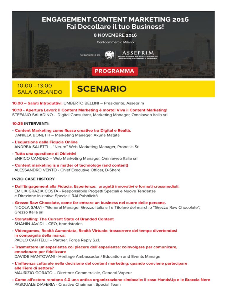 PROGRAMMA 10:00 - 13:00 SALA ORLANDO SCENARIO 10.00 – Saluti Introduttivi: UMBERTO BELLINI – Presidente, Asseprim 10:10 - Apertura Lavori: Il Content Marketing è morto! Viva il Content Marketing! STEFANO SALADINO - Digital Consultant, Marketing Manager, Omniaweb Italia srl 10:25 INTERVENTI: • Content Marketing come flusso creativo tra Digital e Realtà. DANIELA BONETTI – Marketing Manager, Akuna Matata • L’equazione della Fiducia Online ANDREA SALETTI - “Neuro” Web Marketing Manager, Pronesis Srl • Tutta una questione di Obiettivi ENRICO CANDEO – Web Marketing Manager, Omniaweb Italia srl • Content marketing is a matter of technology (and content) ALESSANDRO VENTO - Chief Executive Officer, D-Share INZIO CASE HISTORY • Dall’Engagement alla Fiducia. Esperienze, progetti innovativi e formati crossmediali. EMILIA GRAZIA COSTA - Responsabile Progetti Speciali e Nuove Tendenze e Direzione Iniziative Speciali, RAI Pubblicità • Grezzo Raw Chocolate, come far entrare un business nel cuore delle persone. NICOLA SALVI - “General Manager Grezzo Italia srl e Titolare del marchio “Grezzo Raw Chocolate”, Grezzo Italia srl • Storytelling: The Current State of Branded Content SHAHIN JAVIDI - CEO, brandstories • Videogames, Realtà Aumentata, Realtà Virtuale: trascorrere del tempo divertendosi in compagnia della marca. PAOLO CAPITELLI – Partner, Forge Reply S.r.l. • Trasmettere un’esperienza col piacere dell’esperienza: coinvolgere per comunicare, emozionare per fidelizzare DAVIDE MANTOVANI - Heritage Ambassador / Education and Events Manage • L’influenza culturale nella decisione del content marketing: quando conviene partecipare alle Fiere di settore? MAURIZIO GORATO – Direttore Commerciale, General Vapeur • Come all’estero rendono 4.0 una antica organizzazione sindacale: il caso HandsUp e le Braccia Nere PASQUALE DIAFERIA - Creative Chairman, Special Team 14:00 - 17:00 SALA COLUCCI CONSAPEVOLEZZA E RAFFORZAMENTO DEL BRAND 14:00 - Apertura Lavori STEFANO SALADINO - Digital Consultant, Marketing Manager , Omniaweb Italia srl Moderatrice PATRIZIA CARIDI - Founder & Project Manager, Investo Idea – Investomagazine.com – startupgeneration.it • LA BELLA STORIA - Gioca le tue carte REGINA MORETTO - Esploratrice di Scrittura Potente • I contenuti? Sono come le MILF. Cosa puoi imparare da Pornhub per la tua strategia digitale. EMANUELA CIUFFOLI - Socia fondatrice di Gazduna srl - Consulente e Formatrice MARCO PULZELLI - Socio fondatore di Gazduna Srl, Fashion buyer • Sesso, emoji e video adv: il content marketing ai tempi delle app di dating ALESSIO CONTI - Social Media & Communication Design, Freelance consultant, Alessio Conti Social Media & Communication Design • Creare Brand Awareness: Perché la digital animation is the new black! RICCARDO MARTORIELLO - CEO & Digital Strategist & strategic planner, RIMAcomunica.it CRISTINA SERESINI – Animation & Motion Graphic Director/ Teacher, DIANA FILM STUDIO • Il Content Marketing funziona: l’esempio di Comunicaresulweb.com [case study] ALESSANDRO SCURATI - Content Marketing Specialist e cofondatore di BusinessDifferente.com • Vita da Brand: gestire Rischi e cogliere Opportunita’ FEDERICO ZILLER – Consulente, Imprese di Talento • Anche gli eventi B2B possono volare tra i Trend Topic ALESSANDRA COLAO - Managing Partner, Doppia Elica • Social Media Policy - Insieme consapevolmente NADIA ZABBEO - Founder & Director, DIGYSIT 14:30 - 17:30 SALA ORLANDO LA GENERAZIONE DI NUOVI CONTATTI E LA TRASFORMAZIONE DI LEAD IN PROSPECT E DEI PROSPECT IN CLIENTI 14:30 - Apertura Lavori STEFANO SALADINO - Digital Consultant, Marketing Manager , Omniaweb Italia srl Moderatore GIUSEPPE FRANCO - Consulente, formatore e autore per passione, goloso per lavoro :) • Proposta per un regolamento a difesa del consumatore di Pubblicità online LUCA OLIVERIO - Digital Strategy Manager, Cernuto Pizzigoni & Partners • Rispondere al dilemma del Marketing Manager: passare dalla Noia alla Storia. Content Marketing per far maturare i prospect in clienti DONATELLA ARDEMAGNI - Titolare, 39Marketing • Instagram per generare clienti e diventare punto di riferimento del settore DAVIDE DAL MASO - Libero Professionista, Consulente e Docente di Social Media Marketing • Snapchat: moda o opportunità per le aziende? Come integrare le Snapchat Stories in un piano di Content Marketing. Simonetta Pozzi - Consulente/Formatore • Come intercettare i clienti “dietro l’angolo” con la Local Search LUCA BOVE – Fondatore, IM Evolution • Annunci mirati e landing coerenti... è così che si converte! CHIARA FRANCESCA STORTI - Web Marketing Consultant spicelab.it, CHIARASTORTI • Ottimizza la tua landing page in 7 semplici mosse DAVIDE MASCETTI - Consulente di Web Marketing e Titolare, DMSTUDIOWEB • La Customer Experience che fa viaggiare la Mobilita’ sostenibile ANDREA BOSSO - Direttore Strategia e Consulenza, Domino • L’acquisizione di un cliente parte dal piano editoriale: il caso dedicatoame.it ANDREA CANNIZZARO – Key Account Manager, DM COMMERCE a part of DM GROUP SpA 15:00 - 18:00 SALA TURISMO LA FIDELIZZAZIONE DEL CLIENTE NELL’ERA DELLA SOVRAESPOSIZIONE ALL’OFFERTA E ALL’INFORMAZIONE 15:00 - Apertura Lavori STEFANO SALADINO - Digital Consultant, Marketing Manager , Omniaweb Italia srl Moderatrice SAORIN ELISABETTA - Digital Consultant • L’efficace sinergia tra tecnologia e fattore umano per la fidelizzazione del cliente. La potenza delle risorse personali per differenziarsi dalla concorrenza. Come si fa? PATRIZIA MARZOLA – Psicologa • Percorsi di Content Marketing per fidelizzare il cliente DAVIDE COLONNELLO - Classe Quattro Srl – Presidente • Coltivare i lead e fidelizzare i clienti con l’Email Marketing in 5 -semplici- passi ALESSANDRO “MORLOI” GRAZIOLI - “Responsabile Marketing & Customer Care e Coautore del blog EmailMarketingBlog.it”, VOXmail • L’Evoluzione: il Marketi