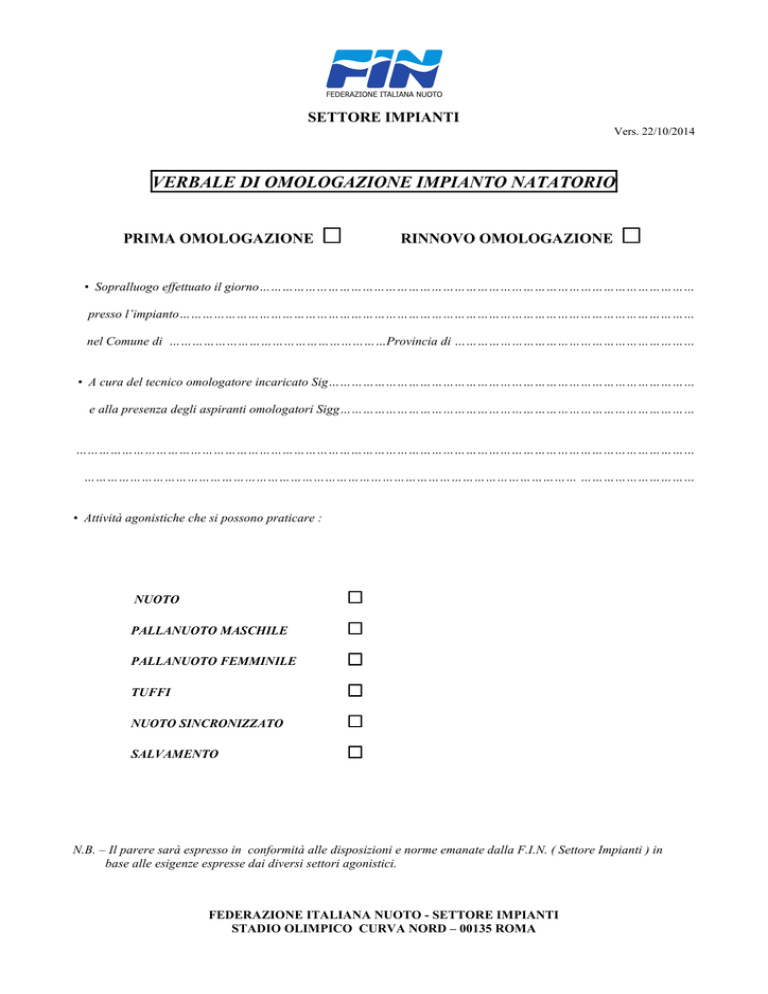 SETTORE IMPIANTI Vers. 22/10/2014 VERBALE DI OMOLOGAZIONE IMPIANTO NATATORIO PRIMA OMOLOGAZIONE RINNOVO OMOLOGAZIONE • Sopralluogo effettuato il giorno…………………………………………………………………………………………………… presso l’impianto……………………………………………………………………………………………………………………… nel Comune di …………………………………………………Provincia di ……………………………………………………… • A cura del tecnico omologatore incaricato Sig…………………………………………………………………………………… e alla presenza degli aspiranti omologatori Sigg………………………………………………………………………………… ……………………………………………………………………………………………………………………………………………… ………………………………………………………………………………………………………………… ………………………… • Attività agonistiche che si possono praticare : NUOTO PALLANUOTO MASCHILE PALLANUOTO FEMMINILE TUFFI NUOTO SINCRONIZZATO SALVAMENTO N.B. – Il parere sarà espresso in conformità alle disposizioni e norme emanate dalla F.I.N. ( Settore Impianti ) in base alle esigenze espresse dai diversi settori agonistici. FEDERAZIONE ITALIANA NUOTO - SETTORE IMPIANTI STADIO OLIMPICO CURVA NORD – 00135 ROMA SETTORE IMPIANTI Vers. 22/10/2014 CARATTERISTICHE GENERALI E TECNICHE DELL’IMPIANTO NATATORIO GENERALI • Comune ………………………………………………………………………………………………Provincia ………………… • Denominazione dell’impianto…………………………………………………………………………………………………… • Indirizzo……………………………………………………………………………cap………………tel………………………… • Proprietario………………………………………………………………………………………………………………………… • Gestore……………………………………………………………………………………………………………………………… • Anno di ultimazione della costruzione…………………………………………………………………………………………… CARATTERISTICHE DELL’ IMPIANTO • Piscina con vasca/e all’aperto • Piscina con vasca/e al coperto • Piscina con vasca/e all’aperto e vasca/e al coperto • Piscina con copertura mobile • Piscina con copertura fissa • Piscina con vasca all’aperto con copertura gonfiabile • Dimensioni vasche lunghezza larghezza profondità min vasca A vasca B vasca C vasca D vasca E vasca F FEDERAZIONE ITALIANA NUOTO - SETTORE IMPIANTI STADIO OLIMPICO CURVA NORD – 00135 ROMA profondità max SETTORE IMPIANTI Vers. 22/10/2014 ATTREZZATURE VASCHE A B C Blocchi di partenza su un lato Blocchi di partenza su due lati Corsie galleggianti normali Corsie galleggianti frangionda Fasce segna corsie su fondo e testate Fasce segna corsie su fondo e testate Segnalatori di virata Contro starter ( segnale falsa partenza ) Conta vasche Tabellone tempi e punteggi Campi e porte pallanuoto Segnalatore 35 secondi Pedana arbitri Predisposizione apparecchio e piastre cronometraggio automatico Apparecchio sonoro starter Podio premiazioni Piattaforme tuffi da mt. 1 n…………mt.3 n………… Trampolini tuffi da mt. 1 n…………mt.3 n………… Sistema agitatore superficie per tuffi Attrezzature nuoto sincronizzato Atre Attrezzature sul piano vasca Pontone mobile – dimensioni: ………………………………………………………………………………………………………………………………………… FEDERAZIONE ITALIANA NUOTO - SETTORE IMPIANTI STADIO OLIMPICO CURVA NORD – 00135 ROMA D E F SETTORE IMPIANTI Vers. 22/10/2014 • Bordi di partenza e virata: parete verticale continua di 30 cm. superiore al livello dell’acqua in muratura con piastre di virata mobili con panchetta mobile • Impianto trattamento acqua Filtrazione con filtri a sabbia Filtrazione con filtri a diatomee Filtrazione altro tipo Disinfezione con cloro - composti Disinfezione con cloro - ozono Disinfezione con raggi ultravioletti Riscaldamento acqua vasca (scambiatori vasche) • Impianto di riscaldamento Termoventilazione sala vasca Termoventilazione spogliatoi e servizi Condizionamento aria ambienti vari Altro tipo di riscaldamento • Impianto di illuminazione artificiale Vasche coperte Vasche scoperte ( Subacquea ) • Impianto di amplificazione sonora Interno sala vasche Subacqueo vasche FEDERAZIONE ITALIANA NUOTO - SETTORE IMPIANTI STADIO OLIMPICO CURVA NORD – 00135 ROMA SETTORE IMPIANTI Vers. 22/10/2014 • Tribuna spettatori non previste prospicienti le vasche coperte prospicienti le vasche scoperte possibilità di installare tribune provvisorie smontabili n………… posti n………… posti n………… posti • Tribune atleti non previste prospicienti le vasche coperte prospicienti le vasche scoperte possibilità di installare tribune provvisorie n………… posti n………… posti n………… posti • Area servizi Spogliatoi a rotazione uomini e donne Spogliatoi in comune maschili Spogliatoi in comune femminili Spogliatoi giudici cronometristi maschili Spogliatoi giudici cronometristi femminili Spogliatoi istruttori maschili Spogliatoi istruttori femminili Segreteria gare Direzione Sala stampa Servizio bar Palestra Infermeria Servizi handicap Presidio di bonifica accesso vasche Altri locali ( magazzino piano vasche , ecc, ) Locale controllo antidoping FEDERAZIONE ITALIANA NUOTO - SETTORE IMPIANTI STADIO OLIMPICO CU