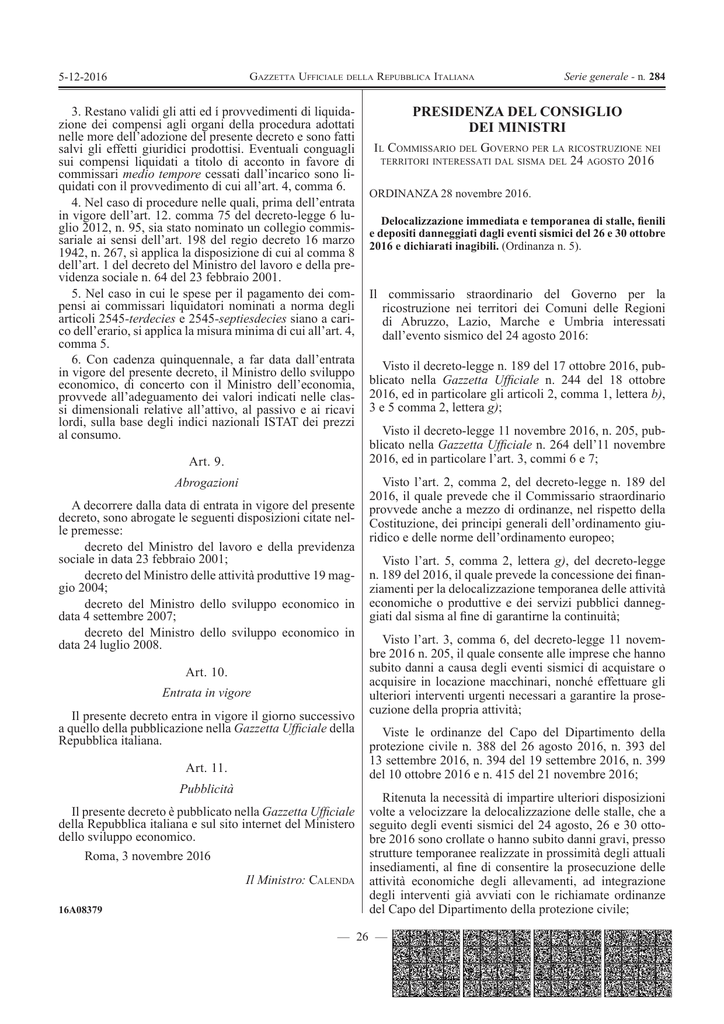5-12-2016 GAZZETTA UFFICIALE DELLA REPUBBLICA ITALIANA 3. Restano validi gli atti ed í provvedimenti di liquidazione dei compensi agli organi della procedura adottati nelle more dell’adozione del presente decreto e sono fatti salvi gli effetti giuridici prodottisi. Eventuali conguagli sui compensi liquidati a titolo di acconto in favore di commissari medio tempore cessati dall’incarico sono liquidati con il provvedimento di cui all’art. 4, comma 6. 4. Nel caso di procedure nelle quali, prima dell’entrata in vigore dell’art. 12. comma 75 del decreto-legge 6 luglio 2012, n. 95, sia stato nominato un collegio commissariale ai sensi dell’art. 198 del regio decreto 16 marzo 1942, n. 267, sì applica la disposizione di cui al comma 8 dell’art. 1 del decreto del Ministro del lavoro e della previdenza sociale n. 64 del 23 febbraio 2001. 5. Nel caso in cui le spese per il pagamento dei compensi ai commissari liquidatori nominati a norma degli articoli 2545-terdecies e 2545-septiesdecies siano a carico dell’erario, si applica la misura minima di cui all’art. 4, comma 5. 6. Con cadenza quinquennale, a far data dall’entrata in vigore del presente decreto, il Ministro dello sviluppo economico, di concerto con il Ministro dell’economia, provvede all’adeguamento dei valori indicati nelle classi dimensionali relative all’attivo, al passivo e ai ricavi lordi, sulla base degli indici nazionali ISTAT dei prezzi al consumo. Art. 9. Abrogazioni A decorrere dalla data di entrata in vigore del presente decreto, sono abrogate le seguenti disposizioni citate nelle premesse: decreto del Ministro del lavoro e della previdenza sociale in data 23 febbraio 2001; decreto del Ministro delle attività produttive 19 maggio 2004; decreto del Ministro dello sviluppo economico in data 4 settembre 2007; decreto del Ministro dello sviluppo economico in data 24 luglio 2008. Art. 10. Entrata in vigore Il presente decreto entra in vigore il giorno successivo a quello della pubblicazione nella Gazzetta Ufficiale della Repubblica italiana. Art. 11. Pubblicità Il presente decreto è pubblicato nella Gazzetta Ufficiale della Repubblica italiana e sul sito internet del Ministero dello sviluppo economico. Roma, 3 novembre 2016 Il Ministro: CALENDA 16A08379 Serie generale - n. 284 PRESIDENZA DEL CONSIGLIO DEI MINISTRI I L COMMISSARIO DEL GOVERNO PER LA RICOSTRUZIONE NEI TERRITORI INTERESSATI DAL SISMA DEL 24 AGOSTO 2016 ORDINANZA 28 novembre 2016. Delocalizzazione immediata e temporanea di stalle, fienili e depositi danneggiati dagli eventi sismici del 26 e 30 ottobre 2016 e dichiarati inagibili. (Ordinanza n. 5). Il commissario straordinario del Governo per la ricostruzione nei territori dei Comuni delle Regioni di Abruzzo, Lazio, Marche e Umbria interessati dall’evento sismico del 24 agosto 2016: Visto il decreto-legge n. 189 del 17 ottobre 2016, pubblicato nella Gazzetta Ufficiale n. 244 del 18 ottobre 2016, ed in particolare gli articoli 2, comma 1, lettera b), 3 e 5 comma 2, lettera g); Visto il decreto-legge 11 novembre 2016, n. 205, pubblicato nella Gazzetta Ufficiale n. 264 dell’11 novembre 2016, ed in particolare l’art. 3, commi 6 e 7; Visto l’art. 2, comma 2, del decreto-legge n. 189 del 2016, il quale prevede che il Commissario straordinario provvede anche a mezzo di ordinanze, nel rispetto della Costituzione, dei principi generali dell’ordinamento giuridico e delle norme dell’ordinamento europeo; Visto l’art. 5, comma 2, lettera g), del decreto-legge n. 189 del 2016, il quale prevede la concessione dei finanziamenti per la delocalizzazione temporanea delle attività economiche o produttive e dei servizi pubblici danneggiati dal sisma al fine di garantirne la continuità; Visto l’art. 3, comma 6, del decreto-legge 11 novembre 2016 n. 205, il quale consente alle imprese che hanno subito danni a causa degli eventi sismici di acquistare o acquisire in locazione macchinari, nonché effettuare gli ulteriori interventi urgenti necessari a garantire la prosecuzione della propria attività; Viste le ordinanze del Capo del Dipartimento della protezione civile n. 388 del 26 agosto 2016, n. 393 del 13 settembre 2016, n. 394 del 19 settembre 2016, n. 399 del 10 ottobre 2016 e n. 415 del 21 novembre 2016; Ritenuta la necessità di impartire ulteriori disposizioni volte a velocizzare la delocalizzazione delle stalle, che a seguito degli eventi sismici del 24 agosto, 26 e 30 ottobre 2016 sono crollate o hanno subito danni gravi, presso strutture temporanee realizzate in prossimità degli attuali insediamenti, al fine di consentire la prosecuzione delle attività economiche degli allevamenti, ad integrazione degli interventi già avviati con le richiamate ordinanze del Capo del Dipartimento della protezione civile; — 26 — 5-12-2016 GAZZETTA UFFICIALE DELLA REPUBBLICA ITALIANA Rilevato che la predisposizione e sistemazione delle aree ove collocare le stalle temporanee è stata disciplinata dalle citate ordinanze del Capo del Dipartimento della protezione civile, laddove si è previsto che a tali attività provvedano i soggetti pubblici (Regioni e Comuni o altri soggetti pubblici da questi individuati) o direttamente i privati interessati; Visto, in particolare, l’art. 1, comma 2, della citata ordinanza n. 415 del 2016, ai sensi del quale, in ragione dell’estensione e diffusione dei danni subiti dagli operatori del settore agricolo e zootecnico a seguito degli eventi sismici verificatisi il 26 e 30 ottobre 2016, la realizzazione delle opere di urbanizzazione necessarie al posizionamento dei moduli abitativi provvisori rurali nonché dei relativi allacci, previste dall’art. 3, comma 3, dell’ordinanza n. 399 del 2016, nonché la realizzazione delle aree necessarie per la messa in opera dei ricoveri e impianti temporanei per la stabulazione, l’alimentazione e la mungitura degli animali, nonché per la conservazione del latte, fienili e depositi, previste dall’art. 7, comma 3, dell’ord