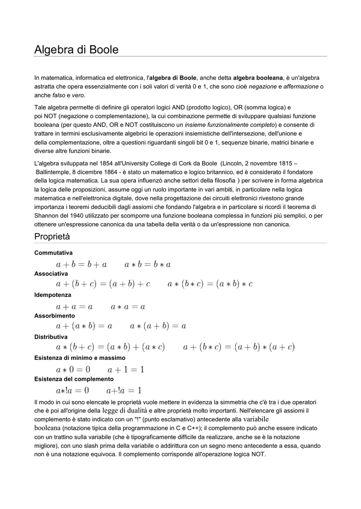 Algebra di Boole In matematica, informatica ed elettronica, l'algebra di Boole, anche detta algebra booleana, è un'algebra astratta che opera essenzialmente con i soli valori di verità 0 e 1, che sono cioè negazione e affermazione o anche falso e vero. Tale algebra permette di definire gli operatori logici AND (prodotto logico), OR (somma logica) e poi NOT (negazione o complementazione), la cui combinazione permette di sviluppare qualsiasi funzione booleana (per questo AND, OR e NOT costituiscono un insieme funzionalmente completo) e consente di trattare in termini esclusivamente algebrici le operazioni insiemistiche dell'intersezione, dell'unione e della complementazione, oltre a questioni riguardanti singoli bit 0 e 1, sequenze binarie, matrici binarie e diverse altre funzioni binarie. L'algebra sviluppata nel 1854 all'University College di Cork da Boole (Lincoln, 2 novembre 1815 – Ballintemple, 8 dicembre 1864 - è stato un matematico e logico britannico, ed è considerato il fondatore della logica matematica. La sua opera influenzò anche settori della filosofia ) per scrivere in forma algebrica la logica delle proposizioni, assume oggi un ruolo importante in vari ambiti, in particolare nella logica matematica e nell'elettronica digitale, dove nella progettazione dei circuiti elettronici rivestono grande importanza i teoremi deducibili dagli assiomi che fondando l'algebra e in particolare si ricordi il teorema di Shannon del 1940 utilizzato per scomporre una funzione booleana complessa in funzioni più semplici, o per ottenere un'espressione canonica da una tabella della verità o da un'espressione non canonica. Proprietà Commutativa Associativa Idempotenza Assorbimento Distributiva Esistenza di minimo e massimo Esistenza del complemento Il modo in cui sono elencate le proprietà vuole mettere in evidenza la simmetria che c'è tra i due operatori che è poi all'origine della legge di dualità e altre proprietà molto importanti. Nell'elencare gli assiomi il complemento è stato indicato con un "!" (punto esclamativo) antecedente alla variabile booleana (notazione tipica della programmazione in C e C++); il complemento può anche essere indicato con un trattino sulla variabile (che è tipograficamente difficile da realizzare, anche se è la notazione migliore), con uno slash prima della variabile o addirittura con un segno meno antecedente a essa, quando non è una notazione equivoca. Il complemento corrisponde all'operazione logica NOT. Si elencano ora la legge di dualità e alcune proprietà derivanti dagli assiomi ora visti con le relative dimostrazioni; oltre a queste conseguenze ci sono poi due importanti teoremi dell'algebra booleana che sono i teoremi di De Morgan e il teorema di Shannon. I teoremi che si dimostrano ora sono validi per qualsiasi "porzione di realtà" che soddisfa gli assiomi di quest'algebra astratta e in particolare saranno applicabili nell'algebra degli insiemi, nell'algebra della logica delle proposizioni e nell'algebra dei circuiti. Legge di dualità Da qualsiasi identità boolena se ne può trarre un'altra per dualità, sostituendo cioè a ogni operatore e agli elementi 0 e 1 il rispettivo duale: il duale di + è *, il duale di 0 è 1 (la dimostrazione di questo sta al prossimo paragrafo), il duale di a è in generale !a (a negato, NOT a). Grazie a questa legge si può vedere come i 14 postulati dati per definire l'algebra booleana non sono tutti indipendenti tra loro: in particolare si vede che PX e PX' (per X=1,...,7) sono uno il duale dell'altro! Complementi di 0 e 1 0 e 1 sono uno il complementare dell'altro: per dimostrarlo basta verificare la definizione di complemento, cioè che Si vede immediatamente che applicando rispettivamente la proprietà del minimo e quella del massimo e il teorema ora enunciato risulta così dimostrato. Si nota che, per come è strutturata quest'algebra, questa dimostrazione ha permesso di dimostrare a partire dagli assiomi che l'elemento neutro esiste ed è unico (l'esistenza non è quindi postulata e l'unicità è insita nell'esistenza essendo solo 2 i valori con cui sta lavorando, cosa non vera per altri tipi di algebra e altre strutture algebriche!). Convoluzione Negando due volte lo stesso elemento si ottiene l'elemento stesso (logica aristotelica: una doppia negazione corrisponde a un'affermazione). Per dimostrarlo basta considerare l'assioma di esistenza del complemento considerato su due elementi a e b=!a: Essendo valida la proprietà commutativa e siccome il complemento esiste unico, se ne deduce facilmente che , che è quello che si voleva dimostrare. Elementi neutri 0 è l'elemento neutro della somma e 1 è l'elemento neutro del prodotto. Per la dimostrazione basta sfruttare la proprietà dell'assorbimento grazie alla quale si deduce che: Ora, sfruttando la proprietà del massimo e minimo per la quale a*0=0 e a+1=1, si deduce facilmente che: che è quello che si doveva dimostrare. Assorbimento del complemento L'assorbimento del complemento dice che Per dimostrarlo basta applicare la proprietà distributiva secondo la quale: dopodiché, notando che a+!a=1 e che 1 è l'elemento neutro del prodotto logico risulta dimostrato il teorema. Per la legge di dualità si capisce anche che esiste un teorema duale a questo che sarà: Questo teorema può essere preso per vero accettando la validità della legge di dualità oppure può essere dimostrato in modo del tutto analogo al precedente. Si nota che, nello scrivere l'espressione duale, si è dovuta rispettare la precedenza di applicazione delle operazioni e perciò le parentesi intorno ad a+!b della seconda espressione sono necessarie! Teorema dell'elemento unico Se e , allora y è unico (o anche x è unico perché si vede che, essendo valida la proprietà commutativa, il ruolo di x e y nelle espressioni è lo stesso!). Per la dimostrazione si suppone per assurdo che esistano due valori distinti y e z che soddisfano alle due espressioni, e cioè Essendo anche che si