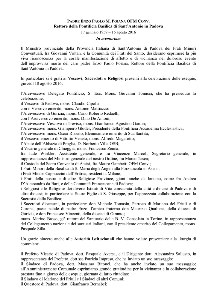 PADRE ENZO PAOLO M. POIANA OFM CONV. Rettore della Pontificia Basilica di Sant’Antonio in Padova 17 gennaio 1959 – 16 agosto 2016 In memoriam Il Ministro provinciale della Provincia Italiana di Sant’Antonio di Padova dei Frati Minori Conventuali, fra Giovanni Voltan, e la Comunità dei Frati del Santo, desiderano esprimere la più viva riconoscenza per la corale manifestazione di affetto e di vicinanza nel doloroso evento dell’improvvisa morte del caro padre Enzo Paolo Poiana, Rettore della Pontificia Basilica di Sant’Antonio in Padova. In particolare si è grati ai Vescovi, Sacerdoti e Religiosi presenti alla celebrazione delle esequie, giovedì 18 agosto 2016: l’Arcivescovo Delegato Pontificio, S. Ecc. Mons. Giovanni Tonucci, che ha presieduto la celebrazione; il Vescovo di Padova, mons. Claudio Cipolla, con il Vescovo emerito, mons. Antonio Mattiazzo: l’Arcivescovo di Gorizia, mons. Carlo Roberto Redaelli, con l’Arcivescovo emerito, mons. Dino De Antoni; l’Arcivescovo-Vescovo di Treviso, mons. Gianfranco Agostino Gardin; l’Arcivescovo mons. Giampiero Gloder, Presidente della Pontificia Accademia Ecclesiastica; l’Arcivescovo mons. Oscar Rizzato, Elemosiniere emerito di Sua Santità; il Vescovo emerito di Vittorio Veneto, mons. Alfredo Magarotto; l’Abate dell’Abbazia di Praglia, D. Norberto Villa OSB; il Vicario generale di Chioggia, mons. Francesco Zenna; fra Jude Winkler, Assistente generale, e fra Vincenzo Marcoli, Segretario generale, in rappresentanza del Ministro generale del nostro Ordine, fra Marco Tasca; il Custode del Sacro Convento di Assisi, fra Mauro Gambetti OFM Conv.; I Frati Minori della Basilica di S. Maria degli Angeli alla Porziuncola in Assisi; i Frati Minori Cappuccini dell’Eritrea, residenti a Milano; i Frati della nostra e di altre Religiose Province, giunti anche da lontano, come fra Andrea D’Alessandro da Bari, e delle Comunità Francescane di Padova; i Religiosi e le Religiose dei diversi Istituti di Vita consacrata della città e diocesi di Padova e di altre diocesi; in particolare le Suore Figlie di S. Giuseppe, per l’apprezzata collaborazione con la Sacrestia della Basilica; i Sacerdoti diocesani, in particolare: don Michele Tomasin, Parroco di Mariano del Friuli e di Corona, paese natale di padre Enzo, l’amico fraterno don Maurizio Qualizza, della diocesi di Gorizia, e don Francesco Vincenti, della diocesi di Otranto; mons. Marino Basso, già rettore del Santuario della B. V. Consolata in Torino, in rappresentanza del Collegamento nazionale dei santuari italiani, con il presidente emerito del Collegamento, mons. Pasquale Silla. Un grazie sincero anche alle Autorità Istituzionali che hanno voluto presenziare alla liturgia di commiato: il Prefetto Vicario di Padova, dott. Pasquale Aversa, e il Dirigente dott. Alessandro Sallusto, in rappresentanza del Prefetto, dott.ssa Patrizia Impresa, che ha inviato un suo messaggio; il Sindaco di Padova, dott. Massimo Bitonci, che ha anche inviato un suo messaggio; all’Amministrazione Comunale esprimiamo grande gratitudine per la vicinanza e la collaborazione prestata fino a giorno delle esequie, giornata di lutto cittadino; il Sindaco di Mariano del Friuli e i Sindaci di altri Comuni; il Questore di Padova, dott. Gianfranco Bernabei; Il Vicepresidente della Provincia di Padova, Fabio Bui; il Presidente del Consiglio Regionale del Veneto, Roberto Ciambetti, anche in rappresentanza del Presidente della Regione Veneto, dott. Luca Zaia; il Presidente del Tribunale di Padova, dott. Sergio Fusaro; il Procuratore Capo della Repubblica presso il Tribunale di Padova, dott. Matteo Stuccilli; il Rettore dell’Università di Padova, prof. Rosario Rizzuto; il Prefetto di Milano, dott. Alessandro Marangoni; il Questore di Vicenza, dott. Gaetano Giampietro; il Vice Questore di Treviso; l’on. Flavio Zanonato, europarlamentare; il Presidente della Camera di Commercio di Padova, Fernando Zilio; il Vicepresidente dell’Automobile Club di Padova, Nicola Borotto; le Autorità Militari e di Pubblica Sicurezza, di ogni ordine e grado: Esercito, Carabinieri, Guardia di Finanza, Polizia di Stato, Polizia Locale, Polizia Stradale, Corpo Forestale dello Stato, Vigili del Fuoco; il Direttore generale dell’Azienda Ulss 16 di Padova, dott. Domenico Scibetta, con il Direttore sanitario, dott.ssa Patrizia Benini; il Direttore generale dell’azienda ospedaliera di Padova, dott. Luciano Flor; i Presidenti e i Responsabili delle varie Fondazioni, Istituzioni e Associazioni culturali, economiche, sanitarie, assistenziali e sportive del territorio; il Console generale di Polonia a Milano; la Rappresentante dell’Ambasciatore di Polonia presso il Quirinale; il Collegio di Presidenza della Veneranda Arca di Sant’Antonio; il Centro Studi Antoniani; gli Ordini, le Associazioni, i Movimenti e i Gruppi collegati o in relazione con la Basilica del Santo: Sovrano Militare Ordine di Malta, Ordine Equestre del Santo Sepolcro di Gerusalemme, Arciconfraternita di Sant’Antonio di Padova, Ordine Francescano Secolare, Gioventù Francescana, Milizia dell’Immacolata, Pia Unione Macellai Militi dell’Immacolata; il Presidente, Alessandro Tognon, e i Membri dell’Associazione «Volontari della Speranza» di Padova-Via Orto Botanico, riconoscenti e memori delle molteplici iniziative di carità promosse con entusiasmo assieme al rettore del Santo, padre Enzo, nel nome di Sant’Antonio; le Comunità Neocatecumenali di Padova, che hanno beneficiato della collaborazione fraterna e generosa di padre Enzo. Grazie anche alla rappresentanza dei detenuti, verso i quali padre Enzo non ha fatto mancare la sua fraterna presenza, specialmente in occasione del pellegrinaggio delle Reliquie di Sant’Antonio nel carcere di Padova. Sono moltissimi i messaggi di partecipazione giunti in questi giorni: da Sua Eminenza il Cardinale Albert Malcom Ranjith, Arcivescovo di Colombo, Sri Lanka; dall’Arcivescovo-Vescovo di Trieste, mons. Giampaolo