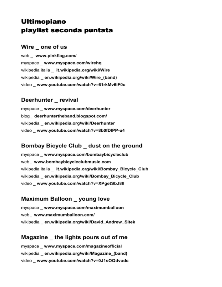 Ultimopiano playlist seconda puntata Wire _ one of us web _ www.pinkflag.com/ myspace _ www.myspace.com/wirehq wikipedia italia _ it.wikipedia.org/wiki/Wire wikipedia _ en.wikipedia.org/wiki/Wire_(band) video _ www.youtube.com/watch?v=61rkMv6iF0c Deerhunter _ revival myspace _ www.myspace.com/deerhunter blog _ deerhuntertheband.blogspot.com/ wikipedia _ en.wikipedia.org/wiki/Deerhunter video _ www.youtube.com/watch?v=8b0fDIPP-u4 Bombay Bicycle Club _ dust on the ground myspace _ www.myspace.com/bombaybicycleclub web _ www.bombaybicycleclubmusic.com wikipedia italia _ it.wikipedia.org/wiki/Bombay_Bicycle_Club wikipedia _ en.wikipedia.org/wiki/Bombay_Bicycle_Club video _ www.youtube.com/watch?v=XPgetSbJ8II Maximum Balloon _ young love myspace _ www.myspace.com/maximumballoon web _ www.maximumballoon.com/ wikipedia _ en.wikipedia.org/wiki/David_Andrew_Sitek Magazine _ the lights pours out of me myspace _ www.myspace.com/magazineofficial wikipedia _ en.wikipedia.org/wiki/Magazine_(band) video _ www.youtube.com/watch?v=0J1sOQdvudc Abe Vigoda _ dream of my love myspace _ www.myspace.com/abevigoda wikipedia _ en.wikipedia.org/wiki/Abe_Vigoda_(band) video _ www.lastfm.it/music/Abe+Vigoda/+videos/+1-LecL36mSzFw Il Teatro degli Orrori _ direzioni diverse myspace _ www.myspace.com/ilteatrodegliorrori web _ www.ilteatrodegliorrori.com/ wikipedia italia _ it.wikipedia.org/wiki/Il_Teatro_degli_Orrori video _ www.youtube.com/watch?v=XIwBwfp-5aU Air _ Kelly watch the stars myspace _ www.myspace.com/intairnet web _ en.aircheology.com/ wikipedia _ en.wikipedia.org/wiki/Air_(French_band) video _ www.youtube.com/watch?v=Rui0hzN-EFE Friendly Fires _ jump in the pool myspace _ www.myspace.com/friendlyfires web _ www.wearefriendlyfires.com/ wikipedia _ en.wikipedia.org/wiki/Friendly_Fires wikipedia italia _ it.wikipedia.org/wiki/Friendly_Fires video _ www.youtube.com/watch?v=ofRCldHb7X0