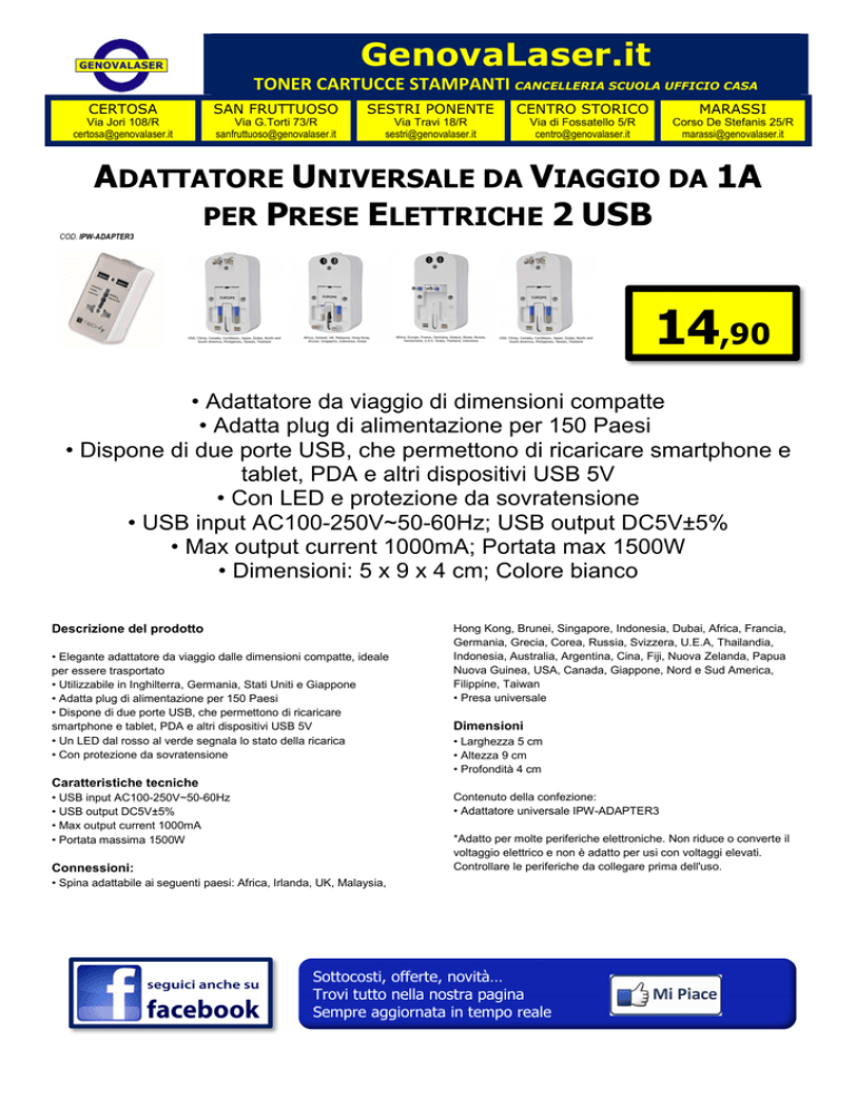 GenovaLaser.it TONER CARTUCCE STAMPANTI CANCELLERIA SCUOLA UFFICIO CASA CERTOSA SAN FRUTTUOSO SESTRI PONENTE CENTRO STORICO MARASSI Via Jori 108/R [email protected] Via G.Torti 73/R [email protected] Via Travi 18/R [email protected] Via di Fossatello 5/R [email protected] Corso De Stefanis 25/R [email protected] ADATTATORE UNIVERSALE DA VIAGGIO DA 1A PER PRESE ELETTRICHE 2 USB COD. IPW-ADAPTER3 14,90 • Adattatore da viaggio di dimensioni compatte • Adatta plug di alimentazione per 150 Paesi • Dispone di due porte USB, che permettono di ricaricare smartphone e tablet, PDA e altri dispositivi USB 5V • Con LED e protezione da sovratensione • USB input AC100-250V~50-60Hz; USB output DC5V±5% • Max output current 1000mA; Portata max 1500W • Dimensioni: 5 x 9 x 4 cm; Colore bianco Descrizione del prodotto • Elegante adattatore da viaggio dalle dimensioni compatte, ideale per essere trasportato • Utilizzabile in Inghilterra, Germania, Stati Uniti e Giappone • Adatta plug di alimentazione per 150 Paesi • Dispone di due porte USB, che permettono di ricaricare smartphone e tablet, PDA e altri dispositivi USB 5V • Un LED dal rosso al verde segnala lo stato della ricarica • Con protezione da sovratensione Hong Kong, Brunei, Singapore, Indonesia, Dubai, Africa, Francia, Germania, Grecia, Corea, Russia, Svizzera, U.E.A, Thailandia, Indonesia, Australia, Argentina, Cina, Fiji, Nuova Zelanda, Papua Nuova Guinea, USA, Canada, Giappone, Nord e Sud America, Filippine, Taiwan • Presa universale Dimensioni • Larghezza 5 cm • Altezza 9 cm • Profondità 4 cm Caratteristiche tecniche Contenuto della confezione: • Adattatore universale IPW-ADAPTER3 • USB input AC100-250V~50-60Hz • USB output DC5V±5% • Max output current 1000mA • Portata massima 1500W *Adatto per molte periferiche elettroniche. Non riduce o converte il voltaggio elettrico e non è adatto per usi con voltaggi elevati. Controllare le periferiche da collegare prima dell'uso. Connessioni: • Spina adattabile ai seguenti paesi: Africa, Irlanda, UK, Malaysia, Sottocosti, offerte, novità… Trovi tutto nella nostra pagina Sempre aggiornata in tempo reale