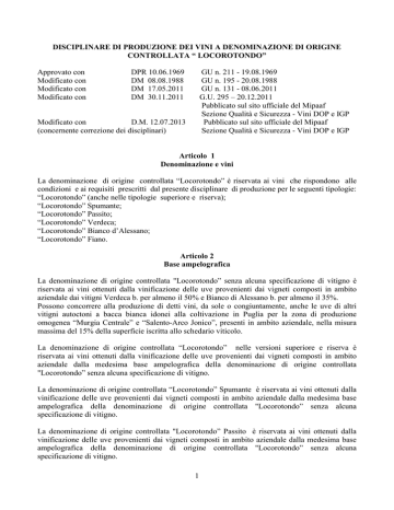 DISCIPLINARE DI PRODUZIONE DEI VINI A DENOMINAZIONE DI ORIGINE CONTROLLATA “ LOCOROTONDO” Approvato con Modificato con Modificato con Modificato con DPR 10.06.1969 DM 08.08.1988 DM 17.05.2011 DM 30.11.2011 GU n. 211 - 19.08.1969 GU n. 195 - 20.08.1988 GU n. 131 - 08.06.2011 G.U. 295 – 20.12.2011 Pubblicato sul sito ufficiale del Mipaaf Sezione Qualità e Sicurezza - Vini DOP e IGP Pubblicato sul sito ufficiale del Mipaaf Sezione Qualità e Sicurezza - Vini DOP e IGP Modificato con D.M. 12.07.2013 (concernente correzione dei disciplinari) Articolo 1 Denominazione e vini La denominazione di origine controllata “Locorotondo” è riservata ai vini che rispondono alle condizioni e ai requisiti prescritti dal presente disciplinare di produzione per le seguenti tipologie: “Locorotondo” (anche nelle tipologie superiore e riserva); “Locorotondo” Spumante; “Locorotondo” Passito; “Locorotondo” Verdeca; “Locorotondo” Bianco d’Alessano; “Locorotondo” Fiano. Articolo 2 Base ampelografica La denominazione di origine controllata "Locorotondo” senza alcuna specificazione di vitigno è riservata ai vini ottenuti dalla vinificazione delle uve provenienti dai vigneti composti in ambito aziendale dai vitigni Verdeca b. per almeno il 50% e Bianco di Alessano b. per almeno il 35%. Possono concorrere alla produzione di detti vini, da sole o congiuntamente, anche le uve di altri vitigni autoctoni a bacca bianca idonei alla coltivazione in Puglia per la zona di produzione omogenea “Murgia Centrale” e “Salento-Arco Jonico”, presenti in ambito aziendale, nella misura massima del 15% della superficie iscritta allo schedario viticolo. La denominazione di origine controllata “Locorotondo” nelle versioni superiore e riserva è riservata ai vini ottenuti dalla vinificazione delle uve provenienti dai vigneti composti in ambito aziendale dalla medesima base ampelografica della denominazione di origine controllata "Locorotondo” senza alcuna specificazione di vitigno. La denominazione di origine controllata “Locorotondo” Spumante è riservata ai vini ottenuti dalla vinificazione delle uve provenienti dai vigneti composti in ambito aziendale dalla medesima base ampelografica della denominazione di origine controllata "Locorotondo” senza alcuna specificazione di vitigno. La denominazione di origine controllata "Locorotondo” Passito è riservata ai vini ottenuti dalla vinificazione delle uve provenienti dai vigneti composti in ambito aziendale dalla medesima base ampelografica della denominazione di origine controllata "Locorotondo” senza alcuna specificazione di vitigno. 1 La denominazione di origine controllata “Locorotondo” con la specificazione dei vitigni Verdeca , Bianco di Alessano e Fiano è riservata ai vini ottenuti dalla vinificazione delle uve dei medesimi vitigni presenti nei vigneti, composti in ambito aziendale, per almeno l’85%. Possono concorrere alla produzione di detti vini, da sole o congiuntamente, anche le uve di altri vitigni a bacca bianca idonei alla coltivazione in Puglia per la zona di produzione omogenea “Murgia Centrale” e “Salento-Arco Jonico”, presenti in ambito aziendale, nella misura massima del 15% della superficie iscritta all’albo dei vigneti. Articolo 3 Zona di produzione delle uve La zona di produzione del vino “Locorotondo” comprende gli interi territori dei comuni di: Locorotondo e di Cisternino ed in parte il territorio comunale di Fasano che resta così delimitato: partendo dal confine territoriale Locorotondo – Fasano segue la strada statale n. 172 dei Trulli, fino alla biforcazione della stessa per la Selva di Fasano, segue lungo la strada asfaltata fino al centro di detta località (Casina Municipale) a quota 386, prosegue fino al confine tra i territori di Fasano e Monopoli, segue la linea di confine tra il comune di Fasano e i comuni di Monopoli, Alberobello e Locorotondo fino all’incrocio con la strada statale 172. Articolo 4 Norme per la viticoltura - Condizioni naturali dell’ambiente. Le condizioni ambientali e di coltura dei vigneti destinati alla produzione dei vini a denominazione di origine controllata “Locorotondo” devono essere quelle della zona o, comunque, atte a conferire alle uve e ai vini derivati le specifiche caratteristiche. I vigneti devono trovarsi su terreni ritenuti idonei per le produzioni delle denominazioni di origine di cui si tratta. Sono da escludere i terreni eccessivamente umidi o insufficientemente soleggiati. - Densità di impianto. Per i nuovi impianti e i reimpianti la densità dei ceppi per ettaro non può essere inferiore a 3.500. - Forme di allevamento e sesti di impianto. I sesti di impianto e le forme di allevamento consentiti sono quelli già usati nella zona. - Irrigazione, forzatura. E’ vietata ogni pratica di forzatura. E’ consentita l’irrigazione di soccorso. - Resa a ettaro e gradazione minima naturale. Le rese massime di uva per ettaro in coltura specializzata per la produzione dei vini di cui all’Art. 1 ed i titoli alcolometrici naturali minimi delle relative uve destinate alla vinificazione, devono essere rispettivamente le seguenti: Tipologia vini Produzione uva t/ha Titolo alcol. vol. nat. minimo “Locorotondo” 13,00 9,50% “Locorotondo” Superiore 10,00 11,00% “Locorotondo” Riserva 13,00 9,50% “Locorotondo” Spumante 13,00 9,50% “Locorotondo” Passito 13,00 9,50% “Locorotondo” Verdeca 13,00 10,00% “Locorotondo” Bianco di Alessano 13,00 10,00% “Locorotondo” Fiano 13,00 10,00% A tali limiti, anche in annate eccezionalmente favorevoli, le rese dovranno essere riportate, purché l’eccedenza produttiva non superi del 20% i limiti medesimi. Qualora tali limiti vengano superati, tutta la produzione non avrà diritto alla denominazione di origine controllata. 2 Articolo 5 Norme per la vinificazione - Zona di vinificazione. Le operazioni di vinificazione, di invecchiamento e di appassimento delle uve devono essere 