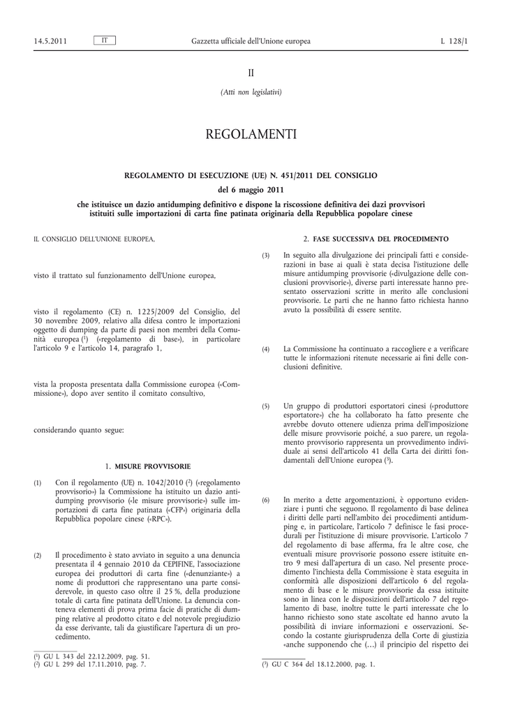 14.5.2011 IT Gazzetta ufficiale dell’Unione europea L 128/1 II (Atti non legislativi) REGOLAMENTI REGOLAMENTO DI ESECUZIONE (UE) N. 451/2011 DEL CONSIGLIO del 6 maggio 2011 che istituisce un dazio antidumping definitivo e dispone la riscossione definitiva dei dazi provvisori istituiti sulle importazioni di carta fine patinata originaria della Repubblica popolare cinese 2. FASE SUCCESSIVA DEL PROCEDIMENTO IL CONSIGLIO DELL'UNIONE EUROPEA, (3) In seguito alla divulgazione dei principali fatti e conside razioni in base ai quali è stata decisa l'istituzione delle misure antidumping provvisorie («divulgazione delle con clusioni provvisorie»), diverse parti interessate hanno pre sentato osservazioni scritte in merito alle conclusioni provvisorie. Le parti che ne hanno fatto richiesta hanno avuto la possibilità di essere sentite. (4) La Commissione ha continuato a raccogliere e a verificare tutte le informazioni ritenute necessarie ai fini delle con clusioni definitive. (5) Un gruppo di produttori esportatori cinesi («produttore esportatore») che ha collaborato ha fatto presente che avrebbe dovuto ottenere udienza prima dell'imposizione delle misure provvisorie poiché, a suo parere, un regola mento provvisorio rappresenta un provvedimento indivi duale ai sensi dell'articolo 41 della Carta dei diritti fon damentali dell'Unione europea (3). (6) In merito a dette argomentazioni, è opportuno eviden ziare i punti che seguono. Il regolamento di base delinea i diritti delle parti nell'ambito dei procedimenti antidum ping e, in particolare, l'articolo 7 definisce le fasi proce durali per l'istituzione di misure provvisorie. L'articolo 7 del regolamento di base afferma, fra le altre cose, che eventuali misure provvisorie possono essere istituite en tro 9 mesi dall'apertura di un caso. Nel presente proce dimento l'inchiesta della Commissione è stata eseguita in conformità alle disposizioni dell'articolo 6 del regola mento di base e le misure provvisorie da essa istituite sono in linea con le disposizioni dell'articolo 7 del rego lamento di base, inoltre tutte le parti interessate che lo hanno richiesto sono state ascoltate ed hanno avuto la possibilità di inviare informazioni e osservazioni. Se condo la costante giurisprudenza della Corte di giustizia «anche supponendo che (…) il principio del rispetto dei visto il trattato sul funzionamento dell'Unione europea, visto il regolamento (CE) n. 1225/2009 del Consiglio, del 30 novembre 2009, relativo alla difesa contro le importazioni oggetto di dumping da parte di paesi non membri della Comu nità europea (1) («regolamento di base»), in particolare l'articolo 9 e l'articolo 14, paragrafo 1, vista la proposta presentata dalla Commissione europea («Com missione»), dopo aver sentito il comitato consultivo, considerando quanto segue: 1. MISURE PROVVISORIE (1) (2) Con il regolamento (UE) n. 1042/2010 (2) («regolamento provvisorio») la Commissione ha istituito un dazio anti dumping provvisorio («le misure provvisorie») sulle im portazioni di carta fine patinata («CFP») originaria della Repubblica popolare cinese («RPC»). Il procedimento è stato avviato in seguito a una denuncia presentata il 4 gennaio 2010 da CEPIFINE, l'associazione europea dei produttori di carta fine («denunziante») a nome di produttori che rappresentano una parte consi derevole, in questo caso oltre il 25 %, della produzione totale di carta fine patinata dell'Unione. La denuncia con teneva elementi di prova prima facie di pratiche di dum ping relative al prodotto citato e del notevole pregiudizio da esse derivante, tali da giustificare l'apertura di un pro cedimento. (1) GU L 343 del 22.12.2009, pag. 51. (2) GU L 299 del 17.11.2010, pag. 7. (3) GU C 364 del 18.12.2000, pag. 1. L 128/2 IT Gazzetta ufficiale dell’Unione europea diritti della difesa richieda che gli esportatori siano infor mati dei principali fatti e considerazioni sulla cui base si è inteso istituire dazi provvisori, il mancato rispetto di questi diritti non può, in quanto tale, avere per effetto di viziare il regolamento che istituisce i dazi definitivi, in quanto, nel corso della procedura di adozione di que st'ultimo regolamento, si è posto rimedio al vizio che ha inficiato la procedura di adozione del regolamento corrispondente che istituisce i dazi provvisori (1)». Nel presente caso la Commissione ha adempiuto agli obblighi riguardanti la divulgazione a norma del regolamento di base e il diritto della difesa dei produttori esportatori è stato rispettato nel corso della procedura che ha portato all'adozione del presente regolamento. (7) La natura provvisoria delle misure adottate in conformità all'articolo 7 del regolamento di base è rispecchiata, fra le altre cose, dal periodo massimo di sei mesi durante il quale possono essere istituite nonché dal fatto che qua lunque dazio provvisorio è protetto solo da una garanzia. La Commissione inoltre non ha mai impedito alle parti, qualora esse sentissero la necessità di essere ascoltate nuovamente nella fase in questione, di presentare richie ste per ulteriori udienze prima del termine di 9 mesi stipulato per legge per l'istituzione di misure provvisorie. (8) I, produttore esportatore ha chiesto di accedere ai dati utilizzati provenienti dall'unica società degli Stati Uniti d'America (USA) che ha fornito informazioni conformi alle disposizioni dell'articolo 2, paragrafo 7, lettera a), per la determinazione del valore normale. Si sosteneva che altrimenti la parte non sarebbe stata in grado di accedere agli elementi di prova che avevano costituito la base per l'istituzione delle misure provvisorie e che ciò non solo violava il diritto di difesa della parte ma era anche con trario al principio della buona amministrazione. La stessa parte ha fatto presente che la divulgazione di dati riser vati riguardanti parti specifiche avrebbe potuto essere messa a disposizione dei rappresentanti legali del produt tore esportatore. I rappresentanti legal