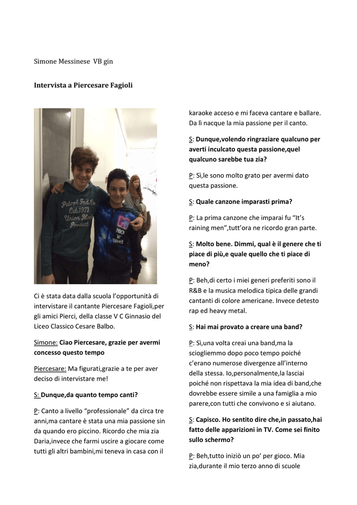 Simone Messinese VB gin Intervista a Piercesare Fagioli karaoke acceso e mi faceva cantare e ballare. Da lì nacque la mia passione per il canto. S: Dunque,volendo ringraziare qualcuno per averti inculcato questa passione,quel qualcuno sarebbe tua zia? P: Sì,le sono molto grato per avermi dato questa passione. S: Quale canzone imparasti prima? P: La prima canzone che imparai fu “It’s raining men”,tutt’ora ne ricordo gran parte. S: Molto bene. Dimmi, qual è il genere che ti piace di più,e quale quello che ti piace di meno? Ci è stata data dalla scuola l’opportunità di intervistare il cantante Piercesare Fagioli,per gli amici Pierci, della classe V C Ginnasio del Liceo Classico Cesare Balbo. Simone: Ciao Piercesare, grazie per avermi concesso questo tempo Piercesare: Ma figurati,grazie a te per aver deciso di intervistare me! S: Dunque,da quanto tempo canti? P: Canto a livello “professionale” da circa tre anni,ma cantare è stata una mia passione sin da quando ero piccino. Ricordo che mia zia Daria,invece che farmi uscire a giocare come tutti gli altri bambini,mi teneva in casa con il P: Beh,di certo i miei generi preferiti sono il R&B e la musica melodica tipica delle grandi cantanti di colore americane. Invece detesto rap ed heavy metal. S: Hai mai provato a creare una band? P: Sì,una volta creai una band,ma la sciogliemmo dopo poco tempo poiché c’erano numerose divergenze all’interno della stessa. Io,personalmente,la lasciai poiché non rispettava la mia idea di band,che dovrebbe essere simile a una famiglia a mio parere,con tutti che convivono e si aiutano. S: Capisco. Ho sentito dire che,in passato,hai fatto delle apparizioni in TV. Come sei finito sullo schermo? P: Beh,tutto iniziò un po’ per gioco. Mia zia,durante il mio terzo anno di scuole medie,inviò alcune registrazioni di un paio di canzoni cantate da me a “Ti lascio una canzone”,programma condotto da Antonella Clerici. Non pensavamo che mi avrebbero mai accettato,e invece dopo qualche tempo giunse una lettera che mi invitava alla sede del programma,a Roma,per tenere un provino. Sia io che mia zia eravamo increduli,ma ci recammo ugualmente alla sede. Il provino durò quaranta minuti,durante il quale i giudici mi elogiarono ripetutamente,stupefatti e soddisfatti di quello che sapevo fare. Al termine del provino dissero che avrebbero voluto nuovamente sentirmi a gennaio,ma questa volta con delle canzoni scelte da loro. Mi recai dunque nuovamente lì a gennaio,e nonostante l’atmosfera fredda che accompagnò lo svolgersi del provino,fui accettato e,tra febbraio e maggio,partecipai al programma. P: Non sbagli. Mi muovevo ogni giovedì da casa mia per andare a Roma per partecipare al programma,e tornavo sabato in giornata. Inoltre dovevo studiare,in fondo andavo ancora alle medie. S: Sicuramente fu un’esperienza molto faticosa,o sbaglio? P: Grazie a te,mi ha fatto molto piacere parlare con te! S: Posso immaginare. Dunque Pierci, attualmente stai imparando a suonare qualche strumento o stai programmando qualche concerto? P: Sì ad entrambe le domande,sto imparando a suonare il pianoforte siccome penso che un cantante debba essere in grado di accompagnare la propria voce con un qualche strumento,e ho in programma un paio di date per Natale,anche se solo in via teorica per ora. S: Va bene Piercesare, grazie per il tempo che mi hai concesso,è stato un piacere intervistarti!