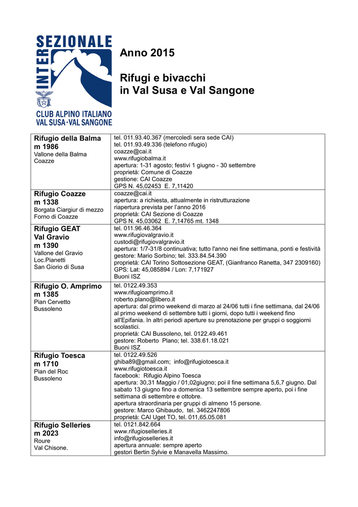 Anno 2015 Rifugi e bivacchi in Val Susa e Val Sangone Rifugio della Balma m 1986 Vallone della Balma Coazze Rifugio Coazze m 1338 Borgata Ciargiur di mezzo Forno di Coazze Rifugio GEAT Val Gravio m 1390 Vallone del Gravio Loc.Pianetti San Giorio di Susa Rifugio O. Amprimo m 1385 Pian Cervetto Bussoleno Rifugio Toesca m 1710 Pian del Roc Bussoleno Rifugio Selleries m 2023 Roure Val Chisone. tel. 011.93.40.367 (mercoledì sera sede CAI) tel. 011.93.49.336 (telefono rifugio) [email protected] www.rifugiobalma.it apertura: 1-31 agosto; festivi 1 giugno - 30 settembre proprietà: Comune di Coazze gestione: CAI Coazze GPS N. 45,02453 E. 7,11420 [email protected] apertura: a richiesta, attualmente in ristrutturazione riapertura prevista per l’anno 2016 proprietà: CAI Sezione di Coazze GPS N. 45,03062 E. 7,14765 mt. 1348 tel. 011.96.46.364 www.rifugiovalgravio.it [email protected] apertura: 1/7-31/8 continuativa; tutto l'anno nei fine settimana, ponti e festività gestore: Mario Sorbino; tel. 333.84.54.390 proprietà: CAI Torino Sottosezione GEAT, (Gianfranco Ranetta, 347 2309160) GPS: Lat: 45,085894 / Lon: 7,171927 Buoni ISZ tel. 0122.49.353 www.rifugioamprimo.it [email protected] apertura: dal primo weekend di marzo al 24/06 tutti i fine settimana, dal 24/06 al primo weekend di settembre tutti i giorni, dopo tutti i weekend fino all'Epifania. In altri periodi aperture su prenotazione per gruppi o soggiorni scolastici. proprietà: CAI Bussoleno, tel. 0122.49.461 gestore: Roberto Plano; tel. 338.61.18.021 Buoni ISZ tel. 0122.49.526 [email protected]; [email protected] www.rifugiotoesca.it facebook: Rifugio Alpino Toesca apertura: 30,31 Maggio / 01,02giugno; poi il fine settimana 5,6,7 giugno. Dal sabato 13 giugno fino a domenica 13 settembre sempre aperto, poi i fine settimana di settembre e ottobre. apertura straordinaria per gruppi di almeno 15 persone. gestore: Marco Ghibaudo, tel. 3462247806 proprietà: CAI Uget TO, tel. 011,65.05.081 tel. 0121.842.664 www.rifugioselleries.it [email protected] apertura annuale: sempre aperto gestori Bertin Sylvie e Manavella Massimo. Rifugio Guido Rey m 1761 Pré Meunier Oulx Rifugio Levi-Molinari m 1849 Grange della Valle Exilles Rifugio III Alpini m 1772 Les Granges de la Vallée Étroite, Valle Stretta 05100 Nevache Rifugio I Re Magi m 1769 Valle Stretta, B.P.204 05100 Briançon Rifugio Camillo Scarfiotti m 2160 Grange du Fond Bardonecchia Rifugio Avanzà m 2538 Passo Avanzà Venaus Rifugio Luigi Vaccarone m 2747 Lago dell'Agnello Giaglione Rifugio Stellina m 2610 Punta Carolei Novalesa Rifugio Baita Gimont m 2035 Pian Gimont Cesana Torinese Categoria: C - 20 posti letto tel.:0122 831390 fax: 011.1970.6503 prenotazione 349.30.78.110 - [email protected] responsabile: Claudio, tel. 011.02.02.256 - 335.59.66.771 [email protected] www.rifugioguidorey.it - http://www.caiuget.it proprietà: CAI Sezione:UGET Torino, tel. 011.53.79.83 apertura estiva: da luglio a metà settembre apertura invernale: da Natale e fine Marzo GPS 45° 1'38.55" 6°45'22.63" tel. 0122.58.241 – 339.42.69.402 - 011.96.32.151 [email protected] apertura: 15/6-15/9 continuativo; dal 01/05 al 31/05 e dal 15/09 al 15/10 aperto tutti i weekend e in settimana su prenotazione gestore: Polvere Di Stelle SNC di Pozzi Marco & C. proprietà: CAI TO, tel. 011.53.92.60 tel. +39 0122 902071 (rifugio) [email protected]. apertura: primavera su prenotazione 15/6-15/9, weekend sempre proprietario: Riccardo Novo - tel. + 39 335 6179182 tel. +39.349.6112920 - +39.368.91.79.52 - +39.0122.96.451 apertura invernale: dal 26/12 al 06/01 e dal 01/02 a Pasqua tutti i giorni apertura estiva: dal 15/6 al 15/9 tutti i giorni; negli altri periodi: tutti i weekend e su prenotazione in settimana proprietà: Renato Nervo tel. +39.0122.96451 GPS 45.068792555489601 6.6295623779296902 tel. 0122.90.18.92 [email protected] apertura: fine settimana nella seconda metà di settembre; continuativa da metà giugno a metà settembre. gestore: Giovanni Odin, tel. 333.67.15.086 proprietà: CAI Torino, tel. 011.54.60.31 tel. 0122.50.330 - 342.76.32.2120 apertura: agosto, festivi luglio-settembre proprietà: Comune di Venaus gestore: Carlo Caffo (Associazione Turistica Pro Loco di Venaus), tel. 340.18.41.602 GPS N. 45° 10' 15" E. 06° 57' 08" tel. 0122.33226 http://www.rifugiovaccarone.eu/ prenotazioni: +39.0122 33 226 (rifugio) - +39 347.96.57.918 (nei periodi di chiusura) apertura estiva: dal 1/07 al 31/08 e nei fine settimana di giugno e settembre gestore: Nino Malavenda proprietà: Comune di Giaglione, in concessione al C.A.I. Chiomonte GPS N45 09.237 E6 55.025 tel. 0122.65.3333 apertura: Bivacco/Rifugio è aperto tutto l'anno e custodito in luglio ed agosto, dopo solo se ci sono prenotazioni di gruppi. proprietà: Comune di Novalesa. referente Francesco Foglia, tel. 348/7932330 [email protected] UTM 5008750 N - 346350 E tel. +39.0122.878033, prenotazione sempre gradita [email protected] facebook: Baita Gimont gestore: Bruno Morella, +39.328.7099155 coperto da rete cellulare; a disposizione degli ospiti una rete wifi UTM N 44° 55’ 20,1’’ E 006° 46’ 00,9’’ Rifugio Alpino La Chardouse m 1659 Borgata Vazon 5 Oulx Rifugio Arlaud m 1770 Montagne Seu Salbertrand Rifugio La Riposa m 2200 Mompantero Rifugio Ernesto Tazzetti m 2642 Rifugio Alpino cat “C” tel. +39.339.6085107 - +39.338.9343937 www.rifugiolachardouse.it [email protected] - [email protected] apertura: estate da metà giugno a metà settembre, inverno dal 26 dicembre al 10 gennaio e tutti i fine settimana, primavera e autunno tutti i fine settimana e festività in genere gestore: Valentina Jorio e Claudio Sandrone, Proprietario: V.Jorio – C.Sandrone GPS 45°01’02.87” 6°48’55.08’’ Posto tappa GTA, Via Alpina, Glorioso Rimpatrio Valdese www.rifugioarlaud.it [email protected] proprietà: Elisa Pecar, tel. 335.40.16.24 detto anche "La riposa"; raggiungibile da Susa tramite l'antica strada militare "Susa - Reposa" in circa 40 minuti, o dalle mulatt