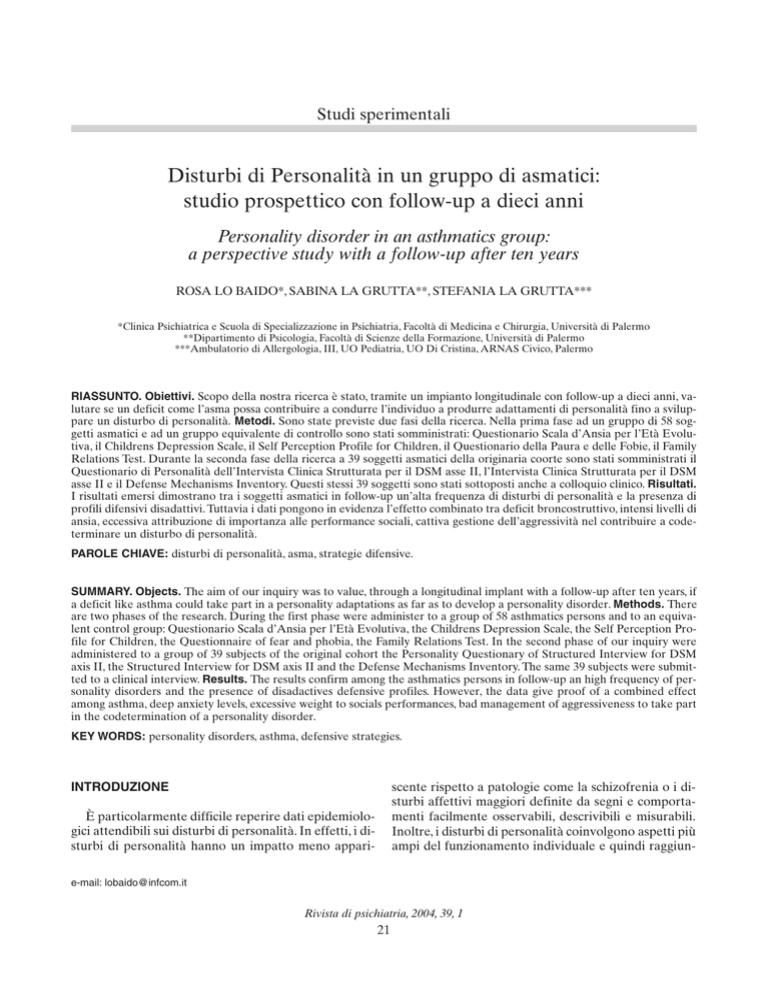 Studi sperimentali Disturbi di Personalità in un gruppo di asmatici: studio prospettico con follow-up a dieci anni Personality disorder in an asthmatics group: a perspective study with a follow-up after ten years ROSA LO BAIDO*, SABINA LA GRUTTA**, STEFANIA LA GRUTTA*** *Clinica Psichiatrica e Scuola di Specializzazione in Psichiatria, Facoltà di Medicina e Chirurgia, Università di Palermo **Dipartimento di Psicologia, Facoltà di Scienze della Formazione, Università di Palermo ***Ambulatorio di Allergologia, III, UO Pediatria, UO Di Cristina, ARNAS Civico, Palermo RIASSUNTO. Obiettivi. Scopo della nostra ricerca è stato, tramite un impianto longitudinale con follow-up a dieci anni, valutare se un deficit come l’asma possa contribuire a condurre l’individuo a produrre adattamenti di personalità fino a sviluppare un disturbo di personalità. Metodi. Sono state previste due fasi della ricerca. Nella prima fase ad un gruppo di 58 soggetti asmatici e ad un gruppo equivalente di controllo sono stati somministrati: Questionario Scala d’Ansia per l’Età Evolutiva, il Childrens Depression Scale, il Self Perception Profile for Children, il Questionario della Paura e delle Fobie, il Family Relations Test. Durante la seconda fase della ricerca a 39 soggetti asmatici della originaria coorte sono stati somministrati il Questionario di Personalità dell’Intervista Clinica Strutturata per il DSM asse II, l’Intervista Clinica Strutturata per il DSM asse II e il Defense Mechanisms Inventory. Questi stessi 39 soggetti sono stati sottoposti anche a colloquio clinico. Risultati. I risultati emersi dimostrano tra i soggetti asmatici in follow-up un’alta frequenza di disturbi di personalità e la presenza di profili difensivi disadattivi. Tuttavia i dati pongono in evidenza l’effetto combinato tra deficit broncostruttivo, intensi livelli di ansia, eccessiva attribuzione di importanza alle performance sociali, cattiva gestione dell’aggressività nel contribuire a codeterminare un disturbo di personalità. PAROLE CHIAVE: disturbi di personalità, asma, strategie difensive. SUMMARY. Objects. The aim of our inquiry was to value, through a longitudinal implant with a follow-up after ten years, if a deficit like asthma could take part in a personality adaptations as far as to develop a personality disorder. Methods. There are two phases of the research. During the first phase were administer to a group of 58 asthmatics persons and to an equivalent control group: Questionario Scala d’Ansia per l’Età Evolutiva, the Childrens Depression Scale, the Self Perception Profile for Children, the Questionnaire of fear and phobia, the Family Relations Test. In the second phase of our inquiry were administered to a group of 39 subjects of the original cohort the Personality Questionary of Structured Interview for DSM axis II, the Structured Interview for DSM axis II and the Defense Mechanisms Inventory. The same 39 subjects were submitted to a clinical interview. Results. The results confirm among the asthmatics persons in follow-up an high frequency of personality disorders and the presence of disadactives defensive profiles. However, the data give proof of a combined effect among asthma, deep anxiety levels, excessive weight to socials performances, bad management of aggressiveness to take part in the codetermination of a personality disorder. KEY WORDS: personality disorders, asthma, defensive strategies. INTRODUZIONE scente rispetto a patologie come la schizofrenia o i disturbi affettivi maggiori definite da segni e comportamenti facilmente osservabili, descrivibili e misurabili. Inoltre, i disturbi di personalità coinvolgono aspetti più ampi del funzionamento individuale e quindi raggiun- È particolarmente difficile reperire dati epidemiologici attendibili sui disturbi di personalità. In effetti, i disturbi di personalità hanno un impatto meno apparie-mail: [email protected] Rivista di psichiatria, 2004, 39, 1 21 Lo Baido R, et al. dio dello sviluppo. Emerge, quindi, che fidarsi esclusivamente delle caratteristiche descrittive sarebbe fuorviante e si fa preminente la necessità di vigilare sui comportamenti età specifici, utilizzando un approccio clinico binario che tiene in considerazione sia pattern comportamentali descrittivi di specifici disturbi di personalità sia caratteristiche strutturali che sottendono l’organizzazione di personalità di base. Per quanto riguarda i segni predittivi comuni ad ogni disturbo di personalità la letteratura è abbastanza unanime. La non-flessibilità è un tratto disadattivo che mostra stabilità nel tempo e costituisce un segno precursore comune ad ogni disturbo di personalità. E del resto un disturbo di personalità è definito da DSM come “un modello abituale di esperienza interiore e di comportamento, stabile e di lunga durata, inflessibile e pervasivo, che devia marcatamente rispetto alle aspettative della cultura dell’individuo” (7). Gli effetti disadattivi della non-flessibilità appaiono meno evidenti quando il soggetto si trova in situazioni più strutturate e prevedibili, mentre si evidenziano, particolarmente, nei periodi di cambiamento e di stress rilevandosi nel modo in cui le transizioni sono affrontate (6). Tali periodi possono includere attività che pongono richieste presenti in ciascuna transizione evolutiva, che vanno da maggiori contatti interpersonali (ad esempio nuove amicizie o maggiore intimità nelle relazioni) a situazioni competitive con il rischio del fallimento e dell’umiliazione (esami, sport di squadra, performance sul lavoro) al raggiungimento di nuovi livelli di autonomia (ad esempio dormire fuori casa, accesso alla scuola superiore, primo o nuovo lavoro). Altri predittori dello sviluppo di disturbi di personalità (11) nell’adulto descritti in letteratura sono le cosiddette disabilità di apprendimento settoriale (il deficit di attenzione, il comportamento ipercinetico e iperattivo, la scarsa concentrazi