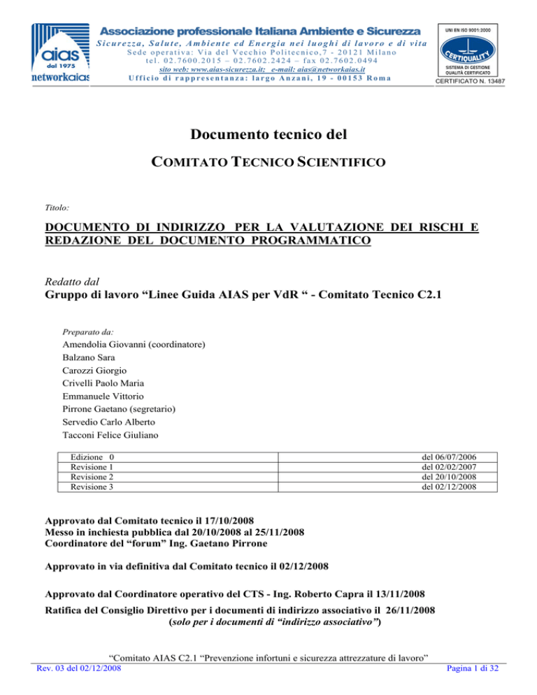 Associazione professionale Italiana Ambiente e Sicurezza Sicurezza, Salute, Ambiente ed Energia nei luoghi di lavoro e di vita Sede operativa: Via del Vecchio Politecnico,7 - 20121 Milano tel. 02.7600.2015 – 02.7602.2424 – fax 02.7602.0494 sito web: www.aias-sicurezza.it; e-mail: [email protected] Ufficio di rappresentanza: largo Anzani, 19 - 00153 Roma CERTIFICATO N. 13487 Documento tecnico del COMITATO TECNICO SCIENTIFICO Titolo: DOCUMENTO DI INDIRIZZO PER LA VALUTAZIONE DEI RISCHI E REDAZIONE DEL DOCUMENTO PROGRAMMATICO Redatto dal Gruppo di lavoro “Linee Guida AIAS per VdR “ - Comitato Tecnico C2.1 Preparato da: Amendolia Giovanni (coordinatore) Balzano Sara Carozzi Giorgio Crivelli Paolo Maria Emmanuele Vittorio Pirrone Gaetano (segretario) Servedio Carlo Alberto Tacconi Felice Giuliano Edizione 0 Revisione 1 Revisione 2 Revisione 3 del 06/07/2006 del 02/02/2007 del 20/10/2008 del 02/12/2008 Approvato dal Comitato tecnico il 17/10/2008 Messo in inchiesta pubblica dal 20/10/2008 al 25/11/2008 Coordinatore del “forum” Ing. Gaetano Pirrone Approvato in via definitiva dal Comitato tecnico il 02/12/2008 Approvato dal Coordinatore operativo del CTS - Ing. Roberto Capra il 13/11/2008 Ratifica del Consiglio Direttivo per i documenti di indirizzo associativo il 26/11/2008 (solo per i documenti di “indirizzo associativo”) “Comitato AIAS C2.1 “Prevenzione infortuni e sicurezza attrezzature di lavoro” Rev. 03 del 02/12/2008 Pagina 1 di 32 Titolo DOCUMENTO DI INDIRIZZO PER LA VALUTAZIONE DEI RISCHI E REDAZIONE DEL DOCUMENTO PROGRAMMATICO DOCUMENTO DI INDIRIZZO PER LA VALUTAZIONE DEI RISCHI E REDAZIONE DEL DOCUMENTO PROGRAMMATICO PREMESSE Il presente documento è stato elaborato dal “Comitato AIAS C. 2.1 – Gruppo di lavoro Procedura “Valutazione dei Rischi” con l’obiettivo di fornire agli associati AIAS un supporto metodologico all’elaborazione della valutazione dei rischi e redazione del Documento Programmatico, fornendo così uno strumento di lavoro indirizzato a utenti professionali che si accingono ad effettuare la “valutazione dei rischi” in un ambiente di lavoro, ai sensi del D.Lgs.81/08, o una revisione della stessa, nei casi previsti. Avvertenza importante: Tutti i documenti qui riprodotti hanno valore esclusivamente informativo, e di essi AIAS garantisce la correttezza scientifica del metodo utilizzato, pur non assicurando la fedeltà ai testi originali e l’affidabilità delle fonti. Documenti, informazioni, dati e modelli forniti dal presente servizio sono riservati agli associati AIAS per un uso esclusivamente professionale, di essi non è consentita la riproduzione, diffusione e/o la comunicazione senza esplicito consenso di AIAS il Socio è autorizzato all’utilizzo professionale degli stessi sotto la propria esclusiva responsabilità. Riproduzione riservata Ai sensi dell’art. 1, comma 1 del decreto legge 22 marzo del 2004, n. 72, come modificato dalla legge di conversione 21 maggio 2004, n. 128, le opere qui pubblicate e/o riprodotte sul sito NetworkAIAS hanno assolto gli obblighi derivanti dalla normativa sul diritto d’autore e sui diritti connessi. La riproduzione, la comunicazione al pubblico, la messa a disposizione del pubblico, il noleggio e il prestito, la pubblica esecuzione e la diffusione senza l’autorizzazione del titolare dei diritti è vietata. Alle violazioni si applicano le sanzioni previste dagli art. 171, 171-bis, 171-ter, 174-bis e 174 ter della legge 633/1941. “Comitato AIAS C2.1 “Prevenzione infortuni e sicurezza attrezzature di lavoro” Procedura per la redazione del documento di Valutazione dei Rischi. Rev. 03 del 02/12/2008 Pagina 2 di 32 Titolo DOCUMENTO DI INDIRIZZO PER LA VALUTAZIONE DEI RISCHI E REDAZIONE DEL DOCUMENTO PROGRAMMATICO INDICE: 1 2 3 4 5 SCOPO 1.1 DISPOSIZIONE DI LEGGE E DEFINIZIONI 1.2 ORIENTAMENTI COMUNITARI E DEFINIZIONI ESAME PRELIMINARE 2.1 VERIFICA DELLA CONFORMITA’ FORMALE – ADEMPIMENTI AMMINISTRATIVI 2.2 VERIFICA DELLA CONFORMITA’ SOSTANZIALE - RIFERIMENTI NORMATIVI 2.3 ANALISI ANDAMENTO INFORTUNISTICO AZIENDALE - MODELLO DI RIFERIMENTO REDAZIONE DEL DOCUMENTO VALUTAZIONE DEI RISCHI 3.1 IDENTIFICAZIONE AZIENDA 3.2 IDENTIFICAZIONE AREE E/O ATTIVITA’ DI LAVORO OMOGENEE 3.3 INDIVIDUAZIONE/IDENTIFICAZIONE DEI PERICOLI 3.4 IDENTIFICAZIONE DELLE PERSONE ESPOSTE E INDIVIDUAZIONE DEI RISCHI 3.5 VALUTAZIONE DEI RISCHI 3.6 INDIVIDUAZIONE DELLE MISURE DI PREVENZIONE E PROTEZIONE 3.7 REDAZIONE DEL DOCUMENTO PROGRAMMATICO CONTROLLO E AGGIORNAMENTO DELLE MISURE DI PREVENZIONE E PROTEZIONE 4.1 GESTIONE E PROGRAMMA D’ATTUAZIONE DELLE MISURE DI PREVENZIONE E PROTEZIONE • 4.2 VERIFICA DELL’EFFICIENZA E DELL’EFFICACIA DELLE MISURE DI PREVENZIONE E PROTEZIONE E AGGIORNAMENTO DEL PIANO DI ATTUAZIONE E/O DEI CONTROLLI PERIODICI DIAGRAMMA DI FLUSSO DEL PROCESSO DI VALUTAZIONE DEI RISCHI SOMMARIO DELLE FASI PER LA GESTIONE DELLAVALUTAZIONE DEI RISCHI E PER LA REDAZIONE DEL DOCUMENTO PROGRAMMATICO GESTIONE FASE P D C A INDICE CONTENUTI 05 P -2 DATI IDENTIFICATIVI ORGANIZZATIVI E GESTIONALI 05 P -1 ESAME PRELIMINARE 05 P0 DIAGRAMMA DI FLUSSO 05 P1 INDIVIDUAZIONE AREE E ATTIVITA’ OMOGENEE INDIVIDUAZIONE/IDENTIFICAZIONE PERICOLI 05 P2 PERSONE ESPOSTE ED INDIVIDUAZIONE DEI RISCHI 05 P3 VALUTAZIONE DEI RISCHI 05 D1 MISURE DI PREVENZIONE E PROTEZIONE 05 D2 DOCUMENTO PROGRAMMATICO 05 C1 CONTROLLO OPERATIVO 05 A1 GESTIONE DINAMICA AGGIORNAMENTO E PROGRAMMAZIONE “Comitato AIAS C2.1 “Prevenzione infortuni e sicurezza attrezzature di lavoro” Procedura per la redazione del documento di Valutazione dei Rischi. Rev. 03 del 02/12/2008 Pagina 3 di 32 Titolo DOCUMENTO DI INDIRIZZO PER LA VALUTAZIONE DEI RISCHI E REDAZIONE DEL DOCUMENTO PROGRAMMATICO 1 SCOPO A distanza di oltre dieci anni dal recepimento della direttiva 89/391 e delle sette direttive associate (89/654, 89/655, 89/656, 90/269, 90/270, 90/394, e 90/679) è doveroso ricordare e riproporre alcune asserzioni trasmesse dall’UE tramite la di