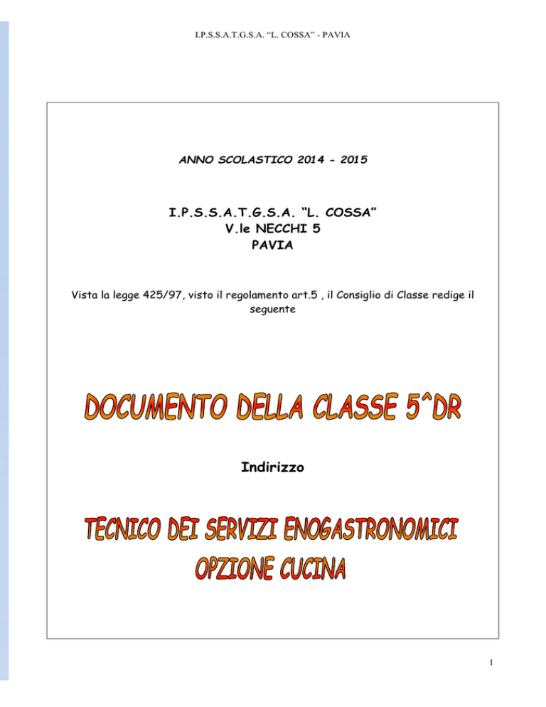 I.P.S.S.A.T.G.S.A. “L. COSSA” - PAVIA ANNO SCOLASTICO 2014 - 2015 I.P.S.S.A.T.G.S.A. “L. COSSA” V.le NECCHI 5 PAVIA Vista la legge 425/97, visto il regolamento art.5 , il Consiglio di Classe redige il seguente Indirizzo 1 I.P.S.S.A.T.G.S.A. “L. COSSA” - PAVIA PROFILO PROFESSIONALE Il Tecnico dei Servizi per l’ “Enogastronomia” opzione cucina è responsabile delle attività di ristorazione nelle varie componenti in cui essa si articola, in rapporto anche alla specifica tipologia di struttura ristorativa in cui opera. Pertanto egli deve: avere specifiche competenze nei diversi campi relativi ai servizi della Ristorazione possedere conoscenze tecniche, culturali e organizzative rispetto all’intero settore saper utilizzare due lingue straniere possedere adeguate capacità di comunicazione nei rapporti interpersonali. In particolare: 1. Controllare e utilizzare gli alimenti e le bevande sotto il profilo organolettico, merceologico,chimico-fisico, nutrizionale e gastronomico. 2. Predisporre menu coerenti con il contesto e le esigenze della clientela, anche in relazione a specifiche necessità dietologiche. 3. Adeguare e organizzare la produzione e la vendita in relazione alla domanda dei mercati, valorizzando i prodotti tipici. E’ capace di: Percepire problemi Individuare soluzioni Controllare situazioni complesse Inserirsi nella gestione delle funzioni amministrative e aziendali sia nell’area dell’amministrazione aziendale sia in quelle di controllo di gestione. operare in aziende di varia natura e dimensione nell’ambito dei servizi della ristorazione. 2 I.P.S.S.A.T.G.S.A. “L. COSSA” - PAVIA QUADRO ORARIO MATERIA CLASSE IV CLASSE V Italiano 4 4 Storia 2 2 Inglese 3 3 Francese/Spagnolo 3 3 Matematica 3 3 Ed. Fisica 2 2 1 1 5 5 3 3 4 4 2 2 32 32 AREA COMUNE Religione (per coloro che se ne avvalgono) AREA INDIRIZZO Diritto e tecnica amministrative struttura ricettiva Scienza e cultura dell'alimentazione Laboratorio servizio enogastronomico Laboratorio di sala e vendita Totale ore 3 I.P.S.S.A.T.G.S.A. “L. COSSA” - PAVIA DATI RELATIVI AL CONSIGLIO DI CLASSE Materia Docente Continuita’ didattica nel biennio post-qualifica Religione Italiano Storia Inglese Francese/Spagnolo Matematica Diritto e tecniche amministrative della struttura ricettiva Scienze degli alimenti Lab. di servizi enogastronomici settore cucina Lab. di servizi enogastronomici sala e vendita Educazione fisica Insegnate sostegno Impala Enrico Passiglia Lina Passiglia Lina Carlini Carla Ranzini A./Cesano A. Nascardi Luca SI SI SI SI SI francese/NO spagnolo NO Montanari Mariasilvia SI Sergi Domenico NO Franzese Francesco NO Roccaro Francesco SI Marabelli Erminio Del Porto Dario SI SI 4 I.P.S.S.A.T.G.S.A. “L. COSSA” - PAVIA PROFILO DELLA CLASSE All’inizio dell’anno la classe era costituita da 25 alunni, ad Aprile l’alunno Vicente Rodriguez non hanno più frequentato le lezioni avendo superato il numero massimo di assenza previste per legge, pur non essendosi mai ritirato ufficialmente. Attualmente è composta da 24 alunni regolarmente frequentanti, quasi tutti provenienti dalla 4^D indirizzo ristorazione, dagli alunni non ammessi all’Esame di Stato nell’a.s. 2013-2014: Bertoli Carlotta proveniente dalla 5DR, Frangipani Giovanni proveniente dalla 5AR, Grandi Silvio proveniente dalla 5AR , Illuminato Jader proveniente dalla 5DR, Miniati Alessandro proveniente dalla 5CR, Turrin Giada proveniente dalla 5CR , Vicente Rodriguez provenienti da 5DR. ELENCO ALUNNI NUM COGNOME NOME 1 2 3 4 5 6 7 8 9 10 11 12 13 14 15 16 17 18 19 20 21 22 23 24 25 ARMANDI BAJANA BARBAGLIA BARBIN BERTOLI CORTEGGIO DI STEFANO FRANGIPANI GRANDI ILLUMINATO IMPARATO INVERNIZZI MACIAS CORDOVA MARDEDAJ MARENGHI MINIATI MONTINI PRIMKAEW RATAZZI RIBONI SACCHI SAULI SPECIALE TURRIN VICENTE DANIELE PINTO JOSE FRANCISCO ANDREA LAURA CARLOTTA ANTONIO PASQUALE GIOVANNI SILVIO JADER VINCENZO VALENTINA JOSELYN MICHELLE ARJANA DIEGO ALESSANDRO DAVIDE NATTAWUT MATTIA ANDREA ANDREA ALKET NICOLO GIADA MARINA RODRIGUEZ CARLOS E’ previsto l’inserimento di alunni privatisti all’interno della VDR. 5 I.P.S.S.A.T.G.S.A. “L. COSSA” - PAVIA DATI RELATIVI ALLE CLASSI 4^ D ristorazione La classe 4^D ristorazione era costituita da 28 alunni . Al termine dell’anno scolastico la situazione globale è risultata la seguente: Risultati dello scrutinio finale della classe 4^D ristorazione N. studenti N. studenti Materia promossi promossi con 6 con 7 Italiano 14 2 Storia 13 3 Francese 1 1 Spagnolo 5 5 Inglese 15 3 Matematica 7 4 Diritto e tecnica amministrativa Lab.servizi enogastrono mia cucina Lab.enogast ronomia sala Alimenti_ Alimentaz Ed-Fisica Area professionali zzante N. studenti promossi con 8 1 2 1 2 1 N. studenti promossi con 9-10 0 0 3 1 N. studenti con sospensione del giudizio 1 0 0 0 0 5 8 1 3 4 2 4 9 5 0 0 15 3 0 0 0 11 2 4 0 1 3 5 9 1 0 1 0 3 14 0 Sintesi scrutinio finale classe 4^D ristorazione SITUAZIONE Promossi a giugno Sospensione del giudizio Promossi a settembre Non promossi Numero ALUNNI 12 6 6 10 6 I.P.S.S.A.T.G.S.A. “L. COSSA” - PAVIA DATI RELATIVI ALLA CLASSE 5^D ristorazione Interventi di recupero effettuati nella classe 5^D ristorazione L’attività didattica della prima fase dell’anno scolastico è stata dedicata alla verifica del lavoro estivo assegnato e al ripasso, con l’intera classe, dei lineamenti essenziali del programma dell’anno precedente. I docenti hanno approntato le seguenti attività per colmare le lacune emerse durante l’anno scolastico: Pausa didattica: durante le ore curriculari di lezione, per recuperare tematiche dei programmi delle varie materie non ben assimilate. Recupero in itinere: ogni qualvolta i docenti l’abbiano ritenuto indispensabile per meglio puntualizzare tematiche ed argomenti indispensabili allo svolgimento dell’Esame di Stato. ATTIVITA’ INTEGRATIVE CURRICULARI ED EXTRACURRICULARI ANNO SCOLASTICO 2014/2015 ATTIVITA’ Teatro Don Bosco Pavia RELATORE TITOLO 