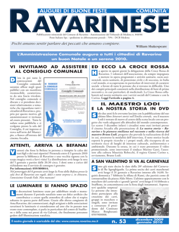 Pubblicazione trimestrale del Comune di Ravarino - Autorizzazione del Tribunale di Modena n. 840/86 Poste Italiane Spa - spedizione in abbonamento postale - 70% - DCB Modena Pochi amano sentir parlare dei peccati che amano compiere. William Shakespeare L’Amministrazione Comunale augura a tutti i cittadini di Ravarino un buon Natale e un sereno 2010. VI INVITIAMO AD ASSISTERE AL CONSIGLIO COMUNALE ED ECCO LA CROCE ROSSA ’ora in poi tutte le del Consiglio comunale saranno affisse negli spazi pubblici con un manifesto riconoscibile, caratterizzato da una fascia tricolore. Nel consiglio comunale si discute e si prendono decisioni relativamente a tematiche che riguardano tutti i cittadini di Ravarino e, proprio per questo motivo, gli amministratori vi invitano ad essere presenti. Tutte le sedute sono pubbliche e si svolgono presso la sala del Consiglio, il cui ingresso si trova nell’atrio del Municipio, a fianco all’entrata del cinema Arcadia. a mettere in opera programmi e attività sanitarie, socio-assistenziali, socio-sanitarie, di protezione civile e di soccorso, in Italia e nel mondo, si occuperanno in particolare di interventi di carattere sociale a favore di tutte le persone che si trovano in difficoltà. Uno dei compiti principali consisterà nella distribuzione di beni di prima necessità e, in casi particolari, di medicinali. La Croce Rossa collaborerà nel nostro territorio con i servizi sociali del Comune e con la Caritas. Leggi l’articolo a pagina 4. D convocazioni ATTENTI, ARRIVA LA BEFANA! orresti che fosse la Befana in persona a riempire la calza dei V tuoi figli o dei tuoi nipotini? Prenotala entro il 3 gennaio 2010 presso la biblioteca di Ravarino e una vecchia signora con la scopa magica verrà a farvi visita! La distribuzione avrà luogo la sera del 5 gennaio a partire dalle 20.30 circa. I doni sono a carico del richiedente ma il servizio di consegna è gratuito. Per informazioni: 059/800844. Nel pomeriggio del 6 gennaio avrà luogo la Festa della Befana presso la sala Arci di Ravarino con regali, dolci e tante sorprese e, in chiusura, l’attesissimo Grande Falò. Non mancate! LE LUMINARIE SI FANNO SPAZIO e decorazioni luminose usate per addobbare strade e monu- L menti durante il periodo natalizio sono un dolce artificio che contribuisce a creare quella atmosfera di calore che si respira soltanto in questa parte dell’anno. Grazie allo sforzo congiunto di Ama Ravarino, dei commercianti, degli artigiani e delle associazioni ravarinesi le luminarie si estenderanno ad aree che in passato non erano state contemplate, si parla in particolare del centro di Stuffione e della zona nei pressi di via Galvani, che finalmente potranno godere dell’illuminazione natalizia. a aperto in questi giorni la delegazione della Croce Rossa di H Ravarino. I volontari dell’associazione, da sempre impegnata IL MAESTRO LODI E LA NOSTRA STORIA IN DVD olo due anni fa lo avevamo lasciato con la pubblicazione del suo S ultimo libro Itinerari storici nell’Emilia centrale, ora il maestro Lodi è tornato di nuovo al centro della scena locale con un progetto che vuole adeguarsi alle abitudini del mondo contemporaneo. Lo scorso 3 dicembre infatti i cittadini sono stati invitati presso il cinema Arcadia alla presentazione di La nostra storia – Ravarino e la pianura emiliana nel racconto e nella ricerca del maestro Bruno Lodi, progetto che prevede la realizzazione di dvd in cui, attraverso la modalità dell’intervista, il noto storico locale esporrà le proprie ricerche e i propri studi, alla riscoperta di un territorio ricco di luoghi di interesse culturale, architettonico e ambientale. Durante la serata, in cui è stato presentato il video promozionale, sono intervenuti il sindaco Marino Gatti, l’assessore alla cultura Maurizia Rebecchi, il regista Gianni Carino e, ovviamente, Bruno Lodi. A SAN VALENTINO SI VA AL CARNEVALE ono già state decise le date della 28a edizione del Carneva- S le di Re Sgorghiguelo. La prima uscita dei carri mascherati avrà luogo il 31 gennaio a Ravarino intorno alle 14,00. Seguirà domenica 7 febbraio la sfilata di Rami, che partirà come di consuetudine da piazza Aldo Moro. L’ultimo appuntamento con le maschere del carnevale e i grandi ‘gettiti’ avrà luogo il 14 febbraio a Stuffione, in concomitanza con la festa degli innamorati. Aspettatevi qualche sorpresa! Le persone che intendono partecipare alla creazione dei carri, gruppi in maschere o singoli, sono invitate a contattare il presidente del Comitato Marco Borghesani: 059/900008. Il nostro giornale è scaricabile dal sito: www.comune.ravarino.mo.it n. 53 dicembre 2009 gennaio 2010 COME ERAVAMO... AMICHE DELLA RISAIA (1939) In piedi, da sinistra: Paola Cerchiari, Novella Pedrazzi, … Mondatori, Anna Ghelfi, …, Ines Bigiani; Sedute (da sinistra): Antonietta Fregni; Maria Tassi; Maria Ghelfi; Maria Bigiani. Scuola elementare di Rami, classe 1ª, anno scolastico 1962/1963 (foto consegnata da Ilmo Stancari) In piedi da sinistra: Dia Traversi, Nadia Guerra, insegnante Maria Teresa Pederzini, Maria Grazia Muzzioli, Nadia Fava, Margherita Morselli, Rossella Cioni. Accosciati, da sinistra: Ilmo Stancari, Roberto Marchetti, Valter Muzzioli, Omer Fregni. Chi desidera pubblicare una foto su questa rubrica deve rivolgersi a Mira Guazzi (Ufficio Cultura del Comune - tel. 059/800814). Tutte le foto, dopo la pubblicazione, vengono restituite. Acquista uno spazio pubblicitario sul giornale di Ravarino Info: 059.800814 COMUNITÀ RAVARINESE Pubblicazione trimestrale del Comune di Ravarino Via Roma, 173 - 41017 Ravarino E-mail: [email protected] N. 53 – Dicembre 2009-Gennaio 2010 Direttore: Evaristo Pancaldi Redazione: Alessandro Bulfarini, Moreno Gesti, Mira Guazzi. ESCAVAZIONI E DEMOLIZIONI Via Canaletto, 1036 - 41017 RAVARINO (MO) Tel. e Fax 059 90.02.75 2 LUCA: 338 6508422 - LUCIANO: 335 6069915 Hanno collaborato: Claudia Bastai, Gianni Benincasa, Cristina Bignardi, Federica Calvi, Stefano Conventi, Marcel