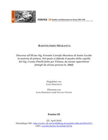 BARTOLOMEO MARANTA Discorso all’Ill.mo Sig. Ferrante Carrafa Marchese di Santo Lucido in materia di pittura. Nel quale si difende il quadro della capella del Sig. Cosmo Pinelli fatto per Titiano, da alcune oppositioni fattegli da alcune persone (c. 1562) Eingeleitet von LUBA FREEDMAN Übersetzt von LUBA FREEDMAN und VIVIANA TONON Fontes 82 [22. April 2016] Zitierfähige URL: http://archiv.ub.uni-heidelberg.de/artdok/volltexte/2016/2213 URN: urn:nbn:de:bsz:16-artdok-22134 Bartolomeo Maranta’s ‘Discourse’ on Titian’s Annunciation in Naples: introduction1 Figure 1: Titian, The Annunciation, c. 1562. Oil on canvas, 280 x 193.5 cm, Naples: Museo Nazionale di Capodimonte. Ministero per i Beni e le Attività culturali e del turismo – Fototeca del Polo Museale della Campagna The Article was published in Journal of Art Historiography, 13.2015. The author must acknowledge with gratitude the several scholars who contributed to this project: Barbara De Marco, Christiane J. Hessler, Peter Humfrey, Francesco S. Minervini, Angela M. Nuovo, Pietro D. Omodeo, Ulrich Pfisterer, Gavriel Shapiro, Graziella Travaglini, Raymond B. Waddington, Kathleen M. Ward and Richard Woodfield. 1 1 Overview The ‘Discourse’ on Titian’s Annunciation is the first known text of considerable length whose subject is a painting by a then-living artist.2 The only manuscript of this text is held in the Biblioteca Nazionale of Naples. The translated title is: ‘A Discourse of Bartolomeo Maranta to the most ill. Sig. Ferrante Carrafa, Marquis of Santo Lucido, on the subject of painting. In which the picture, made by Titian for the chapel of Sig. Cosmo Pinelli, is defended against some opposing comments made by some persons’.3 Maranta wrote the discourse to argue against groundless opinions about Titian’s Annunciation he overheard in the Pinelli chapel. Expert judgement, in his view, requires that the viewer understands the artist’s intentions as they are conveyed in the painting. The Annunciation was painted by Titian (Tiziano Vecellio, c. 1480, Pieve di Cadore – 27 August 1576, Venice) for the altar of the Pinelli chapel in the Neapolitan church of San Domenico Maggiore.4 Maranta’s ‘Discourse’ appears to be the only sixteenth-century consideration of this painting, and the circumstances of obtaining Titian’s painting, the date of its installation in the chapel, and even the date of Maranta’s ‘Discourse’, can be determined from texts relating to the author. According to Maranta, Cosimo desired to have the Annunciation painted by ‘the hand of Titian’, and Cosimo’s son Gian Vincenzo began the process of procuring it for the chapel after his relocation to Padua (that is, some time after 3 August 1558).5 On 11 October 1558, Ferrante Carafa inherited the noble rank of the ‘Marchese di Santo Lucido’,6 and Maranta refers to him as such in the title of his ‘Discourse’, so the year 1558 can be firmly established as the terminus post quem for both the commission of the painting from Titian and the composition of the ‘Discourse’. The relation of the Pinelli Annunciation to the painting by Titian in the Venetian church of San Salvador that bears the same title (though it lays emphasis on the Incarnation) establishes August 1563 as a terminus ante quem for the creation of this work for the Neapolitan church.7 It is most likely that the painting was installed in the Pinelli chapel by March 1562. The 2 Angelo Borzelli, Bartolommeo Maranta. Difensore del Tiziano, Naples: Gennaro, 1902; Giuseppe Solimene, Un umanista venosino (Bartolomeo Maranta) giudica Tiziano, Naples: Società aspetti letterari, 1952; and Paola Barocchi, ed., Scritti d’arte del Cinquecento, Milan- Naples: Einaudi, 1971, 3 vols, 1:863-900. For the translation see below. 3 Ms. Branc. II C 5, c. 260r: ‘DISCORSO DI BARTOLOMEO MARANTA ALL’ILLmo SIG. FERRANTE Carrafa Marchese di Santo Lucido in materia di pittura. Nel quale si difende il quadro della cappella del sig. Cosmo Pinelli fatto per TITIANO, da alcune oppositioni fattegli da alcune persone’. 4 Roberto Longhi, ‘Giunte a Tiziano’, L’Arte, 28.6, 1925, 40-50, drew attention to Titian’s Annunciation in Naples. A recent study by Anna Chiara Alabiso, ed., Tiziano per Napoli. L’Annunciazione di San Domenico Maggiore; vicende storicoartistiche, tecnica di esecuzione e restauro, Naples: Nicola Longobardi Editore, 2010, offers a survey of Titian’s other paintings on the same subject. 5 See the date in Bartolomeo Maranta, Methodi cognoscendorum simplicium libri tres, cum indice copioso, Venice: Vincenzo Valgrisi, 1559, vi. 6 Biagio Aldimari, Historia genealogica della famiglia Carafa, Naples: Antonio Bulifon, 1691, 3 vols, 2:325-6. 7 Daniela Bohde, ‘Titian’s three-altar project in the Venetian church of San Salvador: strategies of self- representation by members of the Scuola Grande di San Rocco’, Renaissance Studies, 15, 2001, 466 at 450-72, provides evidence for the 2 similarities of style between the Angel Gabriel in this painting and the Goddess Diana in the Death of Actaeon (London: National Gallery), whose terminus ante quem is 1559,8 enable this date to be given as a terminus post quem for the Pinelli altarpiece, a date that fits neatly with other works Titian painted in the early 1560s. This essay suggests that a more precise terminus post quem for the ‘Discourse’ is April 1562. The ‘Discourse’ originated as a consequence of a heated debate on the painting between Maranta and Scipione Ammirato that probably took place on 25 March 1562 after they had heard Mass – as Maranta himself reports – in the Pinelli chapel, consecrated to the Annunciation of the Blessed Virgin Mary: 25 March is the Feast of the Annunciation. Maranta describes an uncommon event in his life, because he usually attended Franciscan services and rarely came to San Domenico Maggiore to celebrate major feasts. The text of the ‘Discourse’ is catalogued in the Brancac