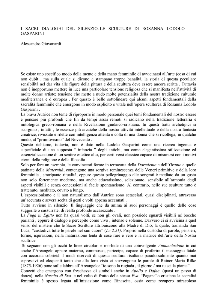I SACRI DIALOGHI DEL SILENZIO. LE SCULTURE DI ROSANNA LODOLO GASPARINI Alessandro Giovanardi Se esiste uno specifico modo della mente e della mano femminile di avvicinarsi all’arte (cosa di cui non dubit , ma sulla quale si dicono e stampano troppe banalità, la storia di questa peculiare sensibilità nel dar vita alle figure della pittura e della scultura deve essere ancora scritta . Tuttavia non è inopportuno mettere in luce una particolare tensione religiosa che si manifesta nell’attività di molte donne artiste; tensione che mette a nudo molte potenzialità della nostra tradizione culturale mediterranea e d europea . Per questo è bello sottolineare qui alcuni aspetti fondamentali della sacralità femminile che emergono in modo esplicito e vitale nell’opera scultorea di Rosanna Lodolo Gasparini . La brava Autrice non teme di riproporre in modo personale quei temi fondamentali del nostro essere e pensare più profondi che fin da tempi assai remoti si radicano nella tradizione letteraria e mitologica greco-romana e nella Rivelazione giudaico-cristiana. In questi tratti archetipici si scorgono , infatti , le essenze più arcaiche della nostra attività intellettuale e della nostra fantasia creatrice, rivissute e rilette con intelligenza attenta e colta di una donna che si ricollega, in qualche modo, al “primitivismo” del Novecento . Questo richiamo, tuttavia, non è dato nella Lodolo Gasparini come una ricerca ingenua e superficiale di una supposta “ infanzia ” degli antichi, ma come elegantissima stilizzazione ed essenzializzazione di un sentire estetico alto, per certi versi classico capace di misurarsi con i motivi eterni della religione e della filosofia . Solo per fare un esempio, le convincenti forme in terracotta della Dormiente e dell’Orante e quelle patinate della Maternità, contengono una sorgiva reminescenza delle Veneri primitive e della loro femminile , straripante ritualità; eppure questo pellegrinaggio alle sorgenti è mediato da un gusto non solo fortemente moderno, ma anche educatissimo, selezionato, sensibile all’armonia degli aspetti visibili e senza concessioni al facile spontaneismo. Al contrario, nelle sue sculture tutto è trattenuto, meditato, covato a lungo. L’espressionismo e il non naturalismo dall’Autrice sono setacciati, quasi disciplinati, attraverso un’accurata e severa scelta di gesti e volti appena accennati . Tutto avviene in silenzio. Il linguaggio che dà anima ai suoi personaggi è quello delle cose suggerite o sussurrate, di realtà profonde accarezzate . La Fuga in Egitto non ha quasi volti, se non gli ovali, non possiede sguardi visibili né bocche parlanti , eppure il dialogo è percepito come vivo , intenso e solenne. Davvero ci si avvicina a quel senso del mistero che le Sacre Scritture attribuiscono alla Madre di Dio, la quale, tramanda San Luca, “custodiva tutte le parole nel suo cuore” (Lc 2,51). Proprio nella custodia di parole, pensieri, forme, ispirazioni, nella maturazione lenta di cose rare e vere è la matrice dell’arte della Nostra scultrice. Si seguano con gli occhi le linee circolari e morbide di una coinvolgente Annunciazione in cui anche l’Arcangelo appare materno, commosso, partecipe, capace di proferire il messaggio fatale con accorata sobrietà. I modi riservati di questa scultura risultano paradossalmente quanto mai espressivi ed eloquenti tanto che alla loro vista ci sovvengono le parole di Rainer Maria Rilke (1875-1926) pone sulle labbra all’Arcangelo: “io sono la rugiada , il giorno / ma tu sei la pianta”. Concetti che emergono con freschezza di simboli anche in Apollo e Dafne (quasi un passo di danza), nella Nascita di Eva e nel volto di frutto della stessa Eva. “Pagana”o cristiana la sacralità femminile è spesso legata all’iniziazione come Rinascita, ossia come recupero miracoloso dell’integrità originaria smarrita dall’uomo nell’allontanarsi dal Divino, via spirituale che nel Cattolicesimo si fonde con lo scenario tragico della Morte e Resurrezione di Cristo, a cui l’Autrice rende omaggio con le meste e posate formelle della Via Crucis (Il Cireneo e la Veronica). Così, tornando alla Maternità e confrontandola con il gruppo Primi passi che in qualche maniera la continua e la compie, il ricordo va ad un’opera del 1945, la Maternità lignea di Alfredo Chighine (1914 – 1974), o alla raffinata scultura in pietra che Vittorio Tavernari (1919 – 1987) dedica alla Carità nel 1953: segni di una religiosità espressionista e quasi romantica, dovuta al magistero cristiano di Giacomo Manzù (1908-1991) in un mondo culturale dominato dalle correnti neorealiste. Tuttavia se qui l’antica sacralità cattolica, pregna, fra l’altro, di elementi precristiani si disponeva a divenire emblema sociale e politico e a volte ideologico, nella Lodolo Gasparini i gesti della quotidianità intendono, invece, recuperare la frattura col sacro e investire sul valore della bellezza, come destino rituale e teologico delle arti. Si può palare di sacralità dell’intimo, non di intimismo, né di minimalismo. In questo senso, un ultimo sguardo alla Fuga in Egitto e all’Annunciazione, ci conduce ad un’implicita meditazione sul dialogo, oggetti riflessione molto antico (Platone, Giustino, Abelardo, Lullo, Petrarca, Tasso) ma che torna oggi a fecondare il pensiero e le arti. I due significativi cavalli di Intesa, espressionisti, vitali, primitivi, simbolici, indicano la verità dell’arte della Lodolo Gasparini che si dà nella scintilla fra identità che s’incontrano, si guardano, si porgono parole e pensieri, dando luogo all’illuminazione estetica e spirituale. Ma ciò che qui è un richiamo aperto e gioioso per lo più resta un eloquente bisbiglio che pone in relazione solitudini profonde e ricchissime . Allo stesso modo in cui l’Arcangelo di Rilke si rivolge alla Madre di Dio: “non fosti mai tanto sola / vedi : appena mi senti; / nel bosco io sono un mite vento, / ma tu, t