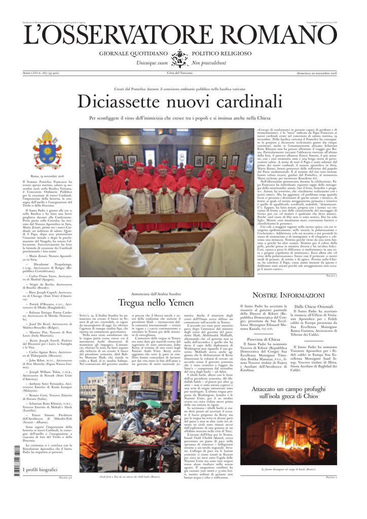 Spedizione in abbonamento postale Roma, conto corrente postale n. 649004 Copia € 1,00 Copia arretrata € 2,00 L’OSSERVATORE ROMANO GIORNALE QUOTIDIANO Unicuique suum Anno CLVI n. 267 (47.402) POLITICO RELIGIOSO Non praevalebunt Città del Vaticano domenica 20 novembre 2016 . Creati dal Pontefice durante il concistoro ordinario pubblico nella basilica vaticana Diciassette nuovi cardinali Per sconfiggere il virus dell’inimicizia che cresce tra i popoli e si insinua anche nella Chiesa «Cercare di trasformarci in persone capaci di perdono e di riconciliazione»: è la “meta” indicata da Papa Francesco ai nuovi cardinali creati nel concistoro di sabato mattina, 19 novembre. Nella basilica vaticana il Pontefice ha consegnato la porpora a diciassette ecclesiastici giunti dai cinque continenti, anche se l’ottantasettenne africano Sebastian Koto Khoarai non ha potuto affrontare il viaggio per Roma. Particolarmente toccante l’abbraccio riservato all’ultimo della lista, il parroco albanese Ernest Simoni, il più anziano, con i suoi ottantotto anni e una lunga storia di persecuzioni subite. A nome di tutti il Papa è stato salutato dal primo dei nuovi cardinali, il nunzio apostolico in Siria, Mario Zenari, fattosi portavoce delle sofferenze del popolo del Paese mediorientale. E al termine del rito tutti insieme hanno voluto recarsi, guidati dal Pontefice, al monastero Mater ecclesiae per incontrare Benedetto XVI. Nell’allocuzione pronunciata durante la celebrazione, Papa Francesco ha individuato «quattro tappe della mistagogia della misericordia: amate, fate il bene, benedite e pregate». Azioni, ha avvertito, che «facilmente realizziamo con i nostri amici». Ma, ha aggiunto, «il problema sorge quando Gesù ci presenta i destinatari di queste azioni: i nemici», di fronte ai quali «il nostro atteggiamento primario e istintivo è quello di squalificarli, screditarli, maledirli, “demonizzarli”». Eppure, ha fatto notare, proprio con i nemici «ci troviamo di fronte a una delle caratteristiche del messaggio di Gesù» per cui «il nemico è qualcuno che devo amare». Perché «nel cuore di Dio non ci sono nemici, Dio ha solo figli». Mentre «noi innalziamo muri, costruiamo barriere e classifichiamo le persone». Ciò vale a maggior ragione nella nostra epoca «in cui risorgono epidemicamente, nelle società, la polarizzazione e l’esclusione». Addirittura «chi sta accanto a noi possiede lo status di sconosciuto o di immigrante o di rifugiato» e «diventa una minaccia. Nemico perché viene da una terra lontana o perché ha altre usanze. Nemico per il colore della pelle, perché pensa in maniera diversa e ha un’altra fede». Così, «poco a poco le differenze si trasformano» in una vera e propria «epidemia di inimicizia». Ecco allora che «il virus della polarizzazione» finisce con il permeare «i nostri modi di pensare, di sentire e di agire». Persino nella Chiesa, ha concluso il Papa, «non siamo immuni da questo e dobbiamo stare attenti perché tale atteggiamento non occupi il nostro cuore». Roma, 19 novembre 2016 Il Sommo Pontefice Francesco ha tenuto questa mattina, sabato 19 novembre 2016, nella Basilica Vaticana, il Concistoro Ordinario Pubblico per la creazione di nuovi Cardinali, l’imposizione della berretta, la consegna dell’anello e l’assegnazione del Titolo o della Diaconia. Il Santo Padre è giunto alle ore 11 nella Basilica e ha fatto una breve preghiera davanti alla Confessione. Preso posto sulla Cattedra, ha ricevuto dal Nunzio Apostolico in Siria, Mario Zenari, primo tra i nuovi Cardinali, un indirizzo di saluto. Quindi il Papa, dopo aver pronunciato l’orazione iniziale e dopo la proclamazione del Vangelo, ha tenuto l’allocuzione. Successivamente ha letto la formula di creazione dei Cardinali proclamando i loro nomi: — Mario Zenari, Nunzio Apostolico in Siria; — Dieudonné Nzapalainga, C.S.Sp., Arcivescovo di Bangui (Repubblica Centrafricana); PAGINA 7 — Carlos Osoro Sierra, Arcivescovo di Madrid (Spagna); — Sérgio da Rocha, Arcivescovo di Brasília (Brasile); — Blase Joseph Cupich, Arcivescovo di Chicago (Stati Uniti d’America); — Patrick D’Rozario, C.S.C., Arcivescovo di Dhaka (Bangladesh); — Baltazar Enrique Porras Cardozo, Arcivescovo di Mérida (Venezuela); — Jozef De Kesel, Arcivescovo di Malines-Bruxelles (Belgio); — Maurice Piat, Vescovo di Port Louis (Isola Maurizio); — Kevin Joseph Farrell, Prefetto del Dicastero per i Laici, la Famiglia e la Vita; — Carlos Aguiar Retes, Arcivescovo di Tlalnepantla (Messico); — John Ribat, M.S.C., Arcivescovo di Port Moresby (Papua Nuova Guinea); Annunciata dall’Arabia Saudita Tregua nello Yemen SANA’A, 19. L’Arabia Saudita ha annunciato un cessate il fuoco in Yemen di 48 ore, estensibile, in vigore da mezzogiorno di oggi. Lo riferisce l’agenzia di stampa saudita Spa, che riporta un comunicato governativo. Nella nota viene sottolineato che la tregua potrà essere estesa «se il movimento huthi dimostrerà di mantenere gli impegni». L’annuncio, riferisce la nota, ha fatto seguito alla richiesta di un cessate il fuoco del presidente yemenita, Abd Rabbo Mansour Hadi, che risiede in esilio a Riad, al re saudita Salman. Nel comunicato del governo saudita si precisa che il blocco navale e aereo della coalizione che sostiene il presidente Hadi — riconosciuto dalla comunità internazionale — resterà in vigore e i caccia continueranno a sorvolare lo Yemen per delle missioni di sorveglianza. L’annuncio della tregua in Yemen era stato dato già martedì scorso dal segretario di stato americano, John Kerry, al termine di una visita negli Emirati Arabi Uniti. Kerry aveva aggiunto che tutte le parti in conflitto hanno concordato di lavorare per dar vita entro la fine dell’anno a un governo di unità nazionale ye- — Joseph William Tobin, C.SS.R., Arcivescovo di Newark (Stati Uniti d’America); — Anthony Soter Fernandez, Arcivescovo Emerito di Kuala Lumpur 