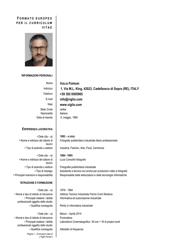 FORMATO EUROPEO PER IL CURRICULUM VITAE INFORMAZIONI PERSONALI Nome Indirizzo Telefono E-mail Web Stato Civile Nazionalità Data di nascita VIGLIO FERRARI 1, Via M.L. King, 42023, Cadelbosco di Sopra (RE), ITALY +39 392 0505965 [email protected] www.viglio.com celibe italiana 5, maggio, 1965 ESPERIENZA LAVORATIVA • Date (da – a) • Nome e indirizzo del datore di lavoro • Tipo di azienda o settore • Date (da – a) • Nome e indirizzo del datore di lavoro • Tipo di azienda o settore • Tipo di impiego • Principali mansioni e responsabilità 1993 - A OGGI Fotografo pubblicitario industriale libero professionista Industria, Fashion, Arte, Food, Cerimonia. 1984 - 1993 Luca Consolini fotografo Fotografia pubblicitaria industriale Assistente e tecnico luci anche per produzioni video e fotografo Responsabile delle attrezzature e delle tecnologie informatiche ISTRUZIONE E FORMAZIONE • Date (da – a) • Nome e tipo di istituto di istruzione • Principali materie / abilità professionali oggetto dello studio • Qualifica conseguita 1979 - 1984 Istitituto Tecnico Industriale Fermo Corni Modena Informatica ed automazione industriale • Date (da – a) • Nome e tipo di istituto di istruzione • Principali materie / abilità professionali oggetto dello studio • Qualifica conseguita Marzo – Aprile 2014 Formodena Laboratorio Cinematografico 40 ore + 16 di project work Pagina 1 - Curriculum vitae di [ Viglio Ferrari ] Perito in informatica industriale Attestato di frequenza • Date (da – a) • Nome e tipo di istituto di istruzione • Principali materie / abilità professionali oggetto dello studio • Qualifica conseguita CAPACITÀ E COMPETENZE PERSONALI MADRELINGUA Maggio – Luglio 2014 Ecipar Webmarketing 40 ore + 16 di project work Attestato di frequenza ITALIANO ALTRA LINGUA INGLESE • Capacità di lettura • Capacità di scrittura • Capacità di espressione orale CAPACITÀ E COMPETENZE RELAZIONALI CAPACITÀ E COMPETENZE ORGANIZZATIVE CAPACITÀ E COMPETENZE TECNICHE CAPACITÀ E COMPETENZE ARTISTICHE ALTRE CAPACITÀ E COMPETENZE PATENTE O PATENTI ULTERIORI INFORMAZIONI ALLEGATI Pagina 2 - Curriculum vitae di [ Viglio Ferrari ] BUONO ELEMENTARE ELEMENTARE BUONE CAPACITÀ DI COMUNICAZIONE ACQUISITE IN AMBITO PROFESSIONALE E IN DOCENZE RELATIVE ALLA FOTOGRAFIA PER PRIVATI E DITTE BUONA ATTITUDINE ALLA GESTIONE DI PROGETTI E GRUPPI ACQUISITA IN AMBITO PROFESSIONALE E NEL TEMPO LIBERO USO DI TUTTE LE FOTOCAMERE PROFESSIONALI TRADIZIONALI E DIGITALI USO DI ATTREZZATURE PER CAMERA OSCURA BIANCO-NERO USO DI SOFTWARE DIGITAL IMAGING (PHOTOSHOP) USO DI APPARATI DI ILLUMINAZIONE DA STUDIO E DA ESTERNO USO DI SOFTWARE GENERICI SU PIATTAFORMA MICROSOFT RICEVUTO DIVERSI PREMI IN CONCORSI FOTOGRAFICI NAZIONALI ED INTERNAZIONALI PARTECIPAZIONE A MOSTRE PERSONALI E COLLETTIVE TREKKING E MOUNTAIN BIKE NEL TEMPO LIBERO Auto B Socio CAI, Socio AMI. ALLEGATO 1 - ELENCO DITTE PER LE QUALI SONO STATI SVOLTI PROGETTI PASSATI O IN CORSO ALLEGATO 2 - ELENCO DI PREMI FOTOGRAFICI RICEVUTI E MOSTRE EFFETTUATE ALLEGATO 3 - CRITICHE E RECENSIONI RICEVUTE ALLEGATO 4 - LA SPERIMENTAZIONE TECNICA COME LINGUAGGIO ALLEGATO 1 – ELENCO DITTE SERVITE INDUSTRIA COMER, EUROSCALE, MAZZONI, PAGANI, MEB, EMAK, SACMI, SPERONI, VERTEX, CAMURRI, BRAGLIA, IGEA, SACHMAN, WALVOIL, LANDINI, CAVICCHI, FORTLAN, SEA, IMMA, MGM, ARTEFICE, HONDA, BDL, SIPAV, SIEMPELKAMP, CIS, PINFARI, MONTEDIL, FERRARIGRU, SICAR, EUROFLUID, BMR, TECO, MASTE, CORMACH, ARAG, NIKE, OTOMILLS, MAPEX, IRS, PIRAMIDE, FAGIOLI, SAER, UDOR, COMALL, GIMBORN, VEZZOSI, ARTEM, ISTITUTO STAMPA, GAMMA MECCANICA, GIULIANO, NOVELLI, FERRONI, PAOLI, FLUIDPRESS, ZAMARK, EUROSTAMP, VASART, G3, CMC, 2B, SICEMSAGA, TECNACO, ELLETRE, AKRON, RONDANINI, COSMO, HOTELMICHELANGELO, CASEIFICIO BOIARDO, STIME, FIVES, TEMA, DEN, BLOOMTEACH, ECOTECHNOLOGIES, CHIM-ITALIA FASHION MAXMARA, MARELLA, MANINI, LIUJO, ARTE PATRONCINI LUCIANO, TEDESCHI NANI, FABIO IEMMI, LA PAGGERIA, BETTA FRIGIERI, STEFANO GRASSELLI, FRANCESCA GUIDETTI, CLAUDIO NIZZOLI, MARCO MANTOVI, MARCO MORANDI, NORBERTO RICCÒ, PRADELLI, DE NISCO, PATTERA, MUSICA ANIA, COMPLESSORESIDENZIALE, WILDJUNKERS, GRAZIANOROMANI, HARPMAMA, LAURAMARS, ORCHESTRINA MILLEMILIA MANIFESTAZIONI ASSOCIAZIONE INDUSTRIALI RE ALTRE DESINTEC, GI&VI, MULTIGRAFICA, GRAFITALIA, BRAVO, Pagina 3 - Curriculum vitae di [ Viglio Ferrari ] ALLEGATO 2 – PREMI FOTOGRAFICI E MOSTRE 1995 vince alcuni premi a concorsi fotografici nazionali (Ciano d'Enza , Brescia, Salsomaggiore Terme) Nel 1996 altri premi nazionali (Bologna, Figline Valdarno, Acerra, Rovereto, Pieve di Cento, Giardini Naxos) e ammissioni a concorsi internazionali (Reggello, Algarve, Sibiu, Linz, Campogalliano, Denain); vengono inserite sue immagini nel Museo Nazionale della Fotografia Cinefotoclub di Brescia collegato alla Associazione Europea per la Storia della Fotografia, espone inoltre a Trento nell'ambito delle iniziative della "Borsa Culturale Europea", a Brentonico nella mostra collettiva a "Palazzo Eccheli-Baisi", a Reggio Emilia nell'ambito delle esposizioni "Restate all'Erta"(delle quali realizza anche le immagini del catalogo), a Sassuolo nella collettiva "Input - Output" (Villa Guerzoni) ed anche al "Centro Cristallo", ad Arceto nel circolo culturale "Castello del Vescovo" (presentazione catalogo "Restate all'erta" e "Mostra mercato dell'arte di piccolo formato"), ed infine a Montecchio nella collettiva "Pronto Soccorso" (opere donate in beneficenza). Nel 1997 ancora premi nazionali (Livorno, Forlì, Romano d'Ezzelino -1°colore, Giardini Naxos-2° colore, Catania, Montevarchi, Morciano di Romagna – 1° assoluto, Migliore autore del 10° circuito Nazionale Concorsi FIAF) e premi internazionali (Vallombrosa – sua la copertina del catalogo e del CD multimediale, Rovinj – Targa oro FIAP, Linz, Zillebeke – menzioni d'onore, Næstved-medaglia oro, Boara Pisani- medaglia argento FIAP al concorso multimediale, Vienna – 7 medaglie fra oro, argento e bron