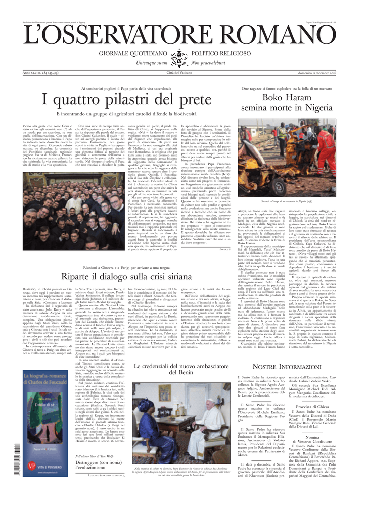 Spedizione in abbonamento postale Roma, conto corrente postale n. 649004 Copia € 1,00 Copia arretrata € 2,00 L’OSSERVATORE ROMANO GIORNALE QUOTIDIANO Unicuique suum Anno CLVI n. 284 (47.419) POLITICO RELIGIOSO Non praevalebunt Città del Vaticano domenica 11 dicembre 2016 . Ai seminaristi pugliesi il Papa parla della vita sacerdotale Due ragazze si fanno esplodere tra la folla di un mercato I quattro pilastri del prete Boko Haram semina morte in Nigeria E incontrando un gruppo di agricoltori cattolici difende la biodiversità Vicino alla gente così come Gesù è stato vicino agli uomini: non c’è altra strada per un sacerdote, se non quella dell’incarnazione. Con un discorso pronunciato a braccio, il Papa ha indicato come dovrebbe essere la vita di ogni prete. Ricevendo sabato mattina, 10 dicembre, la comunità del Pontificio seminario regionale pugliese Pio XI di Molfetta, Francesco ha richiamato quattro pilastri: la vita spirituale, la vita comunitaria, la vita di studio e la vita apostolica. Con una serie di esempi tratti anche dall’esperienza personale, il Papa ha risposto alle parole del rettore, don Gianni Caliandro. Il quale — oltre ad avergli portato il saluto del patriarca Bartolomeo, nei giorni scorsi in visita in Puglia — ha espresso i sentimenti dei presenti citando una vignetta diffusa al termine del giubileo a commento dell’invito a non chiudere le porte della misericordia. Nel disegno si vedeva il Papa che non riusciva a chiudere la porta santa perché un piede, il piede trafitto di Cristo, si frapponeva sulla soglia. «Noi — ha detto il rettore — vogliamo essere sacramento dei piedi del Signore che impediscono alle porte di chiudersi». Da parte sua Francesco ha reso omaggio alla città di Molfetta, di cui era originaria suor Bernadetta, la religiosa che per tanti anni è stata suo prezioso aiuto in Argentina: quando aveva bisogno di supporto nella formazione di qualche giovane, Bergoglio si rivolgeva a lei che «con la saggezza delle mamme» sapeva sempre dare il consiglio giusto. Quindi, il Pontefice, con il suo stile semplice e colloquiale, ha tracciato l’identikit ideale di chi è chiamato a servire la Chiesa nel sacerdozio: un prete che arriva la sera stanco, che sa bruciare la vita per gli altri e non teme la povertà. Ma per essere vicini alla gente così come fece Gesù, ha affermato il Pontefice, è necessario conoscerlo. Per questo ha con insistenza invitato i futuri preti alla preghiera davanti al tabernacolo. E se la stanchezza prende il sopravvento, ha aggiunto, il sacerdote non si vergogni neanche di addormentarsi pregando, ma non tralasci mai il rapporto personale col Signore. Davanti al tabernacolo il prete imparerà anche un altro elemento fondamentale per portare avanti bene la pastorale: la docilità all’azione dello Spirito santo. Solo con questa, ha sottolineato il Papa, si potrà vivere appieno il proprio ze- lo apostolico e abbracciare la gioia del servizio al Signore. Prima della foto di gruppo con i seminaristi, il Pontefice ha lasciato un’ultima immagine utile per comprendere lo stile del loro servizio. Quella del telefono che sta sul comodino del parroco, acceso a qualsiasi ora, perché il prete deve essere sempre pronto ad alzarsi per andare dalla gente che ha bisogno di lui. In precedenza Papa Francesco aveva incontrato i partecipanti alla riunione europea dell’Associazione internazionale rurale cattolica (Icra). Nel discorso rivolto loro, ha evidenziato come nei progetti di formazione l’organismo sia giustamente critico «sul modello orientato all’agribusiness» preferendo porre l’accento «sui bisogni reali, secondo le condizioni delle persone e dei luoghi. Questo — ha osservato — permette di evitare non solo perdite e sprechi nella produzione, ma anche l’incauto ricorso a tecniche che, in nome di un abbondante raccolto, possono eliminare la ricchezza della biodiversità». Del resto — ha aggiunto al testo preparato — «non si conoscono le conseguenze sulla salute umana». E questo dovrebbe far riflettere soprattutto «quando vediamo tante cosiddette “malattie rare” che non si sa da dove vengono». PAGINA 8 Riunioni a Ginevra e a Parigi per arrivare a una tregua Riparte il dialogo sulla crisi siriana y(7HA3J1*QSSKKM( +.!#!?!=!#! DAMASCO, 10. Occhi puntati su Ginevra, dove oggi è previsto un nuovo incontro tra rappresentanti statunitensi e russi, per rilanciare il dialogo sulla Siria. «Continuo a lavorare — ha dichiarato ieri il segretario di stato americano, John Kerry — sulla maniera di salvare Aleppo da una distruzione assolutamente totale, completa. Una delegazione giunta apposta dagli Stati Uniti, sotto la supervisione del presidente Obama, sarà a Ginevra con i russi. In tale sede, dovremmo arrivare a una forma di accordo per vedere come proteggere i civili e ciò che può accadere con l’opposizione armata». In contemporanea all’incontro di Ginevra si terrà a Parigi un altro vertice a livello ministeriale, sempre sul- la Siria. Tra i presenti, oltre Kerry, il ministro degli Esteri tedesco, FrankWalter Steinmeier, il collega britannico Boris Johnson e il ministro degli Esteri turco Mevlüt Çavuşoğlu. Questo mentre alle Nazioni Unite si continua a discutere. L’assemblea generale ha votato ieri a stragrande maggioranza (122 sì contro 13 no e 36 astenuti) una risoluzione, presentata dal Canada, che chiede l’immediato cessate il fuoco e l’invio urgente di aiuti nelle zone più colpite, a partire da Aleppo. L’avvio di un cessate il fuoco generalizzato è considerato una condizione essenziale per far partire le procedure di assistenza umanitaria. Le Nazioni Unite stimano che siano ancora 100.000 i civili intrappolati nei combattimenti ad Aleppo est, tra i quali 500 bisognosi di cure immediate. In una recente analisi, il «Financial Times» sottolineava come, se anche gli Stati Uniti e la Russia dovessero raggiungere un accordo sulla Siria, sarebbe molto difficile metter