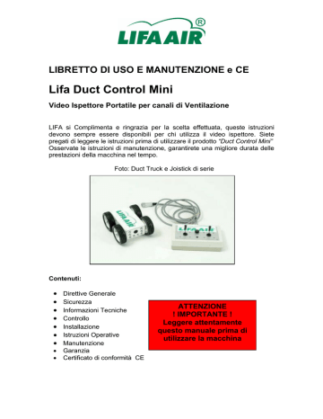 LIBRETTO DI USO E MANUTENZIONE e CE Lifa Duct Control Mini Video Ispettore Portatile per canali di Ventilazione LIFA si Complimenta e ringrazia per la scelta effettuata, queste istruzioni devono sempre essere disponibili per chi utilizza il video ispettore. Siete pregati di leggere le istruzioni prima di utilizzare il prodotto “Duct Control Mini” Osservate le istruzioni di manutenzione, garantirete una migliore durata delle prestazioni della macchina nel tempo. Foto: Duct Truck e Joistick di serie Contenuti: • • • • • • • • • Direttive Generale Sicurezza Informazioni Tecniche Controllo Installazione Istruzioni Operative Manutenzione Garanzia Certificato di conformità CE ATTENZIONE ! IMPORTANTE ! Leggere attentamente questo manuale prima di utilizzare la macchina 2 Lifa Duct Control Mini Video Ispettore Portatile per canali di Ventilazione DIRETTIVE GENERALI Lifa Duct Control Mini, è alimentato a batteria, ed è stato progettato e costruito per ispezionare canali di ventilazione di varia forma, rettangolare, circolare, canali verticali e spazi ristretti. Attenzione, DUCT CONTROL non è a tenuta stagna, EVTARE L’USO in PRESENZA DI ACQUA. 1. La macchina in oggetto deve essere utilizzata elusivamente per lo scopo del quale è stata progettata e gli impieghi elencati nelle istruzioni. E’ vietato l’utilizzo per qualsiasi altro scopo senza l’autorizzazione del produttore. In caso di utilizzo improprio il produttore non è responsabile delle eventuali conseguenze. 2. L’attrezzatura in oggetto può essere utilizzata solo da personale che ha ricevuto formazione e addestramento in merito all’ uso, e che comunque ha letto le istruzioni operative e le altre istruzioni fornite dal produttore. 3. Le persone responsabili della utilizzo della macchina e delle attrezzature correlate, devono essere informate sulla funzionalità, la struttura e norme di sicurezza. 4. Le funzioni e i dispositivi di sicurezza non devono assolutamente essere rimossi o disabilitati mentre la macchina è in funzione. 5. Se la macchina dovesse essere installata o utilizzata in modo che il suo funzionamento sia compromesso o indebolito, il personale addetto deve comunicare tempestivamente l’anomalia. La macchina ed i suoi accessori descritti in queste istruzioni, sono stati prodotti in conformità con le correnti leggi, statuti e regolamenti dell’ Unione Europea,. Le regolamentazioni ed i punti di vista riguardo alla sicurezza cambiano e si modificano nel tempo. Se il personale addetto all’uso dovesse venire a conoscenza di informazioni migliorative riguardo alla sicurezza nell’impiego di queste attrezzature è pregato di comunicarlo a LIFA AIR, la quale sin d’ora ringrazia per la collaborazione. 3 Lifa DuctControl Mini Video Ispettore Portatile per canali di Ventilazione SICUREZZA Le seguenti istruzioni devono essere seguite per garantire la sicurezza e la continuità, senza impedimenti, durante il lavoro Lifa Duct Control Mini opera esclusivamente a batteria, l’unica parte che si allaccia ala rete elettrica è il caricabatteria Il carica batteria va collegato alla rete elettrica, funziona a 1~230 V, 50 Hz LiFA Duct Control non deve essere stoccato o utilizzato in luoghi a rischio di esplosione. Non utilizzare o stoccare in presenza di umidità, Duct Truck NON deve essere bagnato. Fare attenzione alle parti taglienti all’interno dei canali. Utilizzare solo scale ponteggi a norma mentre si opera con Duct Control. Indossare maschere di protezione quando si lavora sui canali aperti, indossare comunque i DPI necessari per il tipo di ambiente in cui si sta operando. Per qualsiasi richiesta o informazione contattare LIFA AIR o il concessionario locale AIR CLEAN & SERVICES 4 INFORMAZIONI TECNICHE Le seguenti informazioni sono riferite al modello di serie del Duct Control Mini. Ci sono altri accessori come il doppio o singolo Joistick che questo manuale descrive più dettagliatamente più avanti. Some parts may come from alternative suppliers, such as TFT monitor, Battery Charger, Field Box. The manufacturer`s instructions for those equipment are attached to this instruction. TECHNICAL INFORMATION / MAIN PARTS LIST Custodia protettiva: alluminio o materiale plastico. Connessioni e materiale in dotazione; o Contenitore fusibili. o Centralina di controllo. o Prese per Video e cavo e alimentazione Duct Control. o Prese per Joistick. o Uscita per monitor LCD o Uscita (RCA) per Videoregistratore scheda per PC. o Batteria di alimentazione 12V 5Ah all’interno della scatola. Monitor LCD a colori (manuale d’istruzioni all’interno) Cavo plastificato Cavo video per alimentazione robot 25 Mt. con prese di connessione già installate. Lifa DuctTruck Mini Trattore dotato di telecamera a colori. - - DIMENSIONI Duct Truck • • • Lunghezza 180 mm Larghezza 140 mm Altezza 80 mm. TRAZIONE 2 Motori separati 12 V, collegati con trasmissione a catena, 4 Ruote. (due di trazione) Telecamera incorporata all’interno. Illuminazione regolabile a distanza. 5 Pesi addizionali 0,75 kg, fissati con viti autofilettanti. Sulla parte superiore. - Carica batterie alimentazione 120/240 V Doppio Joistick con cavo di connessione Oppure Joistick singolo con cavo di connessione. Joistick singolo (a richiesta) CONTROLLO 1) Joystick per ruote di DX 2) Joystick per ruote di SX 3) Interruttore per gestione LED frontali. Azionando entrambe le leve in avanti il Duct Truck avanza Viceversa indietreggia. Per Girare a SX : Indietro leva SX avanti leva DX Per Girare a DX : Indietro leva DX avanti leva SX 6 INSTALLAZIONE E TRASPORTO 1. Trasporto Trasportare con riguardo, evitare colpi al contenuto, prima di installare e utilizzare l’attrezzature, verificare che non abbia subito danni durante il trasporto. LIFA Duct Control Mini deve essere protetto da liquidi o da sostanze fangose prestare attenzione durante le fasi Imballaggio/sballaggio 2. Operatività Posizionare la valigia su una superficie stabile. Proteggere l’attrez
