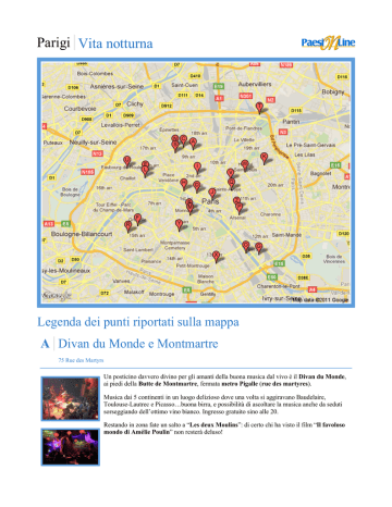 Parigi Vita notturna Legenda dei punti riportati sulla mappa A Divan du Monde e Montmartre 75 Rue des Martyrs Un posticino davvero divino per gli amanti della buona musica dal vivo è il Divan du Monde, ai piedi della Butte de Montmartre, fermata metro Pigalle (rue des martyres). Musica dai 5 continenti in un luogo delizioso dove una volta si aggiravano Baudelaire, Toulouse-Lautrec e Picasso…buona birra, e possibilità di ascoltare la musica anche da seduti sorseggiando dell’ottimo vino bianco. Ingresso gratuito sino alle 20. Restando in zona fate un salto a “Les deux Moulins”: di certo chi ha visto il film “Il favoloso mondo di Amélie Poulin” non resterà deluso! A Le Mikado Discothèque 11 Rue Lallier Le Mikado Discothèque è un locale latino che ospita un'atmosfera accogliente e festosa. Inoltre c'è anche un'ampia sala fumatori. B Bar du Marché 75 rue de seine Fra i bar più alla moda e dalla piacevole atmosfera in pieno centro c’è il Bar du Marché (fra le fermate metro Mabillon e Odéon): il bar, all’angolo fra rue de Buci e rue Saint André des Arts è il luogo ideale per l’aperitivo in un ambiente giovane e simpatico. Buona musica, ottima birra e prezzi ok! Si fanno interessanti incontri con gente del quartiere (saint germain, quartiere latino) e molti stranieri. Questo singolare luogo, che ha anche una bella terrazza, è un po’ l’anima della “Parigi Vecchia”. I simpatici camerieri, sempre vestiti con coloratissime salopette e bizzarri berretti, animano il locale gridando al barista le ordinazioni: un ambiente veramente parigino e popolare al contempo! Da non perdere. Il locale è aperto dalle 7.30 alle 2 di notte. B GOLDEN @ WAGG 62 rue Mazarine Il GOLDEN @ WAGG, il vecchio Whisky a Gogo, è un locale che si trova in uno dei più bei quartieri di Parigi: Saint Germain des Pres ed è anche uno dei locali più ambiti delle notti parigine.Nella sala sopra inoltre c'è la zona fumatori. C Moulin Rouge 82 Boulevard de Clichy Il Moulin Rouge è sicuramente uno dei locali più famosi al mondo. Presente a Parigi dal 1889, si trova nel trasgressivo quartiere di Pigalle, vicino Montmartre. Il mulino rosso che da il nome al locale spicca ancora sulla struttura. Il locale acquistò popolarità ai primi del ‘900 grazie al suo cabaret, ma sopratutto al repertorio di balli, danze e spettacoli. Durante lo scorso secolo il Moulin Rouge ebbe periodi più e meno fortunati, ma molti grandi nomi dell’arte, della musica e dello spettacolo che amarono e frequentarono questo locale contribuirono a rinforzarne il mito. Oggi il Moulin Rouge offre una ricca quermesse di spettacoli di intrattenimento e di danza. C La Machine du Moulin Rouge 90 boulevard de Clichy La Machine du Moulin Rouge è un locale abbastanza piccolo ma con molta clientela. La qualità audio è molto buona e la musica è varia. Anche la programmazione non è male. C Café de Cuba 2, Rue Puget Il Café de Cuba è uno dei locali sudamericani più importanti di Parigi appunto per l'ottima musica latinoamericana. Nella sala superiore ci sono tavole e sedie sono si possono degustare gli ottimi cocktail, tra cui la specialità latina "empanadas". Nella sala sotto invece c'è la musica da ballacon musica che si alterna tra salsa, bachata, merengue, reggaetton e ancora vari generi musicali latini. D Le Chacha 47 Rue berger Le Chacha è un locale frequentato da molti giovani che vogliono passare una serata tra amici cenando e ballando, o semplicemente stando seduti e chiaccherare. E Chez Régine 51 rue de Ponthieu Lo Chez Régine è uno dei locali più chic di Parigi aperto da circa 30anni ed ora tutto rinomato. Nel 2009 il locale è passato sotto un'altra gestione e la programmazione della serata è diventata più movimentata grazie anche al dj che alterna vari generi musicali che vanno dalla musica techno, electro e pop. F Back Up 18 Croix Nivert Il vantaggio del Back Up è quello di avere una grande sala dove poter ballare. Qui ci si può divertire con un gruppo di amici ascoltando la musica che varia tra i successi degli anni '70 e '80 e quella remixata. G Club Med World 39 St Emilion Il Club Med World è un locale abbastanza grande che ha 3 sale con musiche diverse musica latina, zouk e rock. Qui c'è anche un buon ristorante e la cena ha un ottimo rapporto qualità prezzo. H La Scala 188 bis Rue Rivoli La Scala è un locale molto grande che ha 5 sale dove si può trovare qualsiasi tipo di musica si desidera partendo da quella reggae, r'n'b fino a quella rock e disco. E' un locale molto fraquentato dalla gioventù parigina anche perchè i prezzi non sono troppo cari. I La Galerie 161 rue Montmartre La Galerie è un locale molto grande ed è diventato anche un bar per ''players'', cioè per giocatori. Qui infatti ogni serata è diversa dall'altra e ogni serata c'è un gioco diverso. La musica inoltre è spesso commerciale, ma comunque si tratta di buona musica. J Raidd Bar 23 rue du Temple Il Raidd Bar è un locale moderno dove c'è sempre un clima di festa e persone che vengono da tutte le parti del mondo. Inoltre si possono ascoltare vari tipi di musica. K Cabaret- Le Cab 2 Palais Royal Il Cabaret-Le Cab è una delle più belle discoteche di Parigi. Qui si può passare una bella serata tra amici ascoltando anche buona musica. L Le 1515 32 Rue Marbeuf Le 1515 è un locale molto grande che ospita molti dj internazionali e si può ascoltare buona musica, infatti, è frequentato da tanti ragazzi che vogliono passare una serata fra amici. M Les Quatre Vents 18 Quatre Vents Rue Les Quatre Vents è un locale molto grande che si sviluppa su più livelli e si trova nel cuore di Saint Germain des Pres. Il club ha un arredamento antico ed elegante, ma nello stesso tempo anche tempo anche moderno. Nel locale si può ascoltare musica generale che attira anche molti turisti. N Le Titan 1 Avenue Clichy Le Titan è un locale basato sullo stile africano. La musica ascoltata, oltre a quella afro, può essere l'r'n'b, zouk 