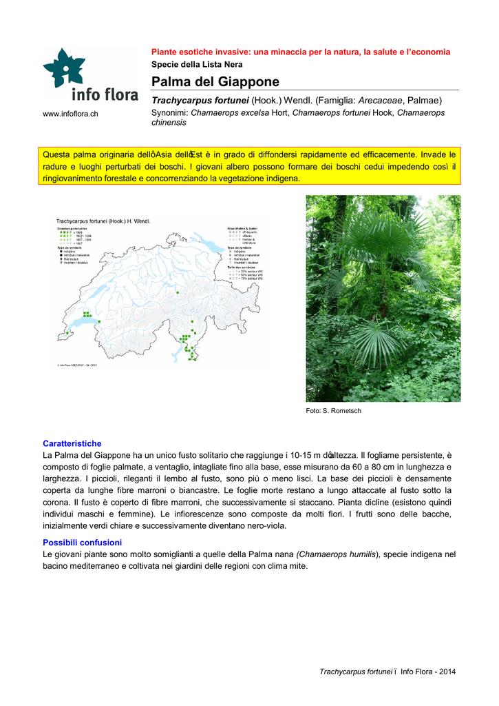 Piante esotiche invasive: una minaccia per la natura, la salute e l’economia Specie della Lista Nera Palma del Giappone Trachycarpus fortunei (Hook.) Wendl. (Famiglia: Arecaceae, Palmae) www.infoflora.ch Synonimi: Chamaerops excelsa Hort, Chamaerops fortunei Hook, Chamaerops chinensis Questa palma originaria dell’ Asia dell’Est è in grado di diffondersi rapidamente ed efficacemente. Invade le radure e luoghi perturbati dei boschi. I giovani albero possono formare dei boschi cedui impedendo così il ringiovanimento forestale e concorrenziando la vegetazione indigena. Foto: S. Rometsch Caratteristiche La Palma del Giappone ha un unico fusto solitario che raggiunge i 10-15 m d’altezza. Il fogliame persistente, è composto di foglie palmate, a ventaglio, intagliate fino alla base, esse misurano da 60 a 80 cm in lunghezza e larghezza. I piccioli, rileganti il lembo al fusto, sono più o meno lisci. La base dei piccioli è densamente coperta da lunghe fibre marroni o biancastre. Le foglie morte restano a lungo attaccate al fusto sotto la corona. Il fusto è coperto di fibre marroni, che successivamente si staccano. Pianta dicline (esistono quindi individui maschi e femmine). Le infiorescenze sono composte da molti fiori. I frutti sono delle bacche, inizialmente verdi chiare e successivamente diventano nero-viola. Possibili confusioni Le giovani piante sono molto somiglianti a quelle della Palma nana (Chamaerops humilis), specie indigena nel bacino mediterraneo e coltivata nei giardini delle regioni con clima mite. Trachycarpus fortunei – Info Flora - 2014 2 Distribuzione La Palma del Giappone è originaria dell’Asia, la sua distribuzione naturale comprende le regioni montagnose dell’India, Cina e Giappone. In Europa è spesso piantata nei parchi e nei giardini. In Ticino si riproduce e diffonde spontaneamente. L’estensione di queste palme in Ticino è spesso messa in relazione con il riscaldamento climatico in corso. Habitat Nella sua area di distribuzione naturale, la palma Palma del Giappone si adatta ad una vasta diversità ambientale, ma preferisce le regioni umide. In cultura è nota per la sua grande rusticità, sopporta effettivamente temperature molto rigide (fino a -20°C). In Ticino, la Palma del Giappone è presente soprattutto nelle foreste, nei margini del bosco e sul bordo di sentieri boschivi ombreggiati. Riproduzione e biologia La Palma del Giappone produce numerosi frutti disseminati dagli uccelli. In questo modo i semi, che germinano facilmente, giungono lontani dagli abitati. Questa palma poco esigente e tollerante al freddo, è rapidamente divenuta una pianta ornamentale apprezzata, che può essere coltivata all’aperto anche a Nord delle Alpi. Se le condizioni sono buone, la crescita del fusto raggiunge 30 cm per anno. Pericoli Natura: a causa della presenza in grande numero di giovani piante, il ringiovanimento naturale della vegetazione boschiva indigena può essere impedito. Le palme, essendo molto grandi, provocano un importante ombreggiamento che frena la crescita delle altre piante. Prevenzione e lotta Non disperdere semi né piante. Strappare le giovani piante. Per chi volesse mantenere la Palma del Giappone nel giardino, consigliamo di tagliare tutte le infiorescenze prima della formazione dei frutti. Non mettere parti di piante strappate o fusti ed infiorescenze tagliati nel compost del giardino (né depositarli illegalmente nei boschi). Unicamente il compostaggio professionale con fase di igienizzazione o il trattamento in un impianto di metanizzazione sono consigliati, altrimenti resta l’incenerimento presso un impianto di incenerimento dei rifiuti. A chi segnalare, a chi chiedere una consulenza? Per assicurare una sorveglianza e una lotta efficace è indispensabile segnalare le stazioni di una neofita invasiva. I servizi cantonali per la protezione dell’ambiente e della natura, o i comuni toccati dall’argomento raccolgono queste informazioni. Secondo la specie e da dove si trova anche altri servizi sono interessati, come per esempio il servizio fitosanitario, il servizio forestale, l’agricoltura, le strade e le FFS. Per il Ticino trovate informazioni e indirizzi di contatto al sito http://www.ti.ch/organismi. È pure possibile segnalare la stazione tramite il taccuino online d’Info Flora o grazie agli altri strumenti proposti alla pagina http://www.infoflora.ch/it/mie-osservazioni/. Per ulteriori informazioni riguardo al tema delle neofite vogliate contattare Sibyl Rometsch ([email protected]). Nel caso ci fossero dubbi sulla determinazione della specie, vi consigliamo di consultare Flora Helvetica con chiave di determinazione (Konrad Lauber / Gerhart Wagner / Andreas Gygax; 2012; éditions Haupt, Berne). Potete anche inviare una fotografia digitale o un esemplare secco (foglie, fusti con fiori e/o frutti) – tra due fogli di giornale indicando il luogo del ritrovamento - a S. Rometsch, Info Flora, c/o Botanischer Garten, Altenbergrain 21, 3013 Bern, ([email protected]). Altre informazioni e letteratura specializzata http://www3.interscience.wiley.com/cgi-bin/fulltext/118545966/PDFSTART Zäch R., 2005, Ökologie und Ausbreitung von Neophyten auf dem Monte Caslano im Südtessin, Travail de diplôme, Geobotanisches Institut ETHZ, http://e-collection.ethbib.ethz.ch/ecol-pool/dipl/dipl_178.pdf Trachycarpus fortunei – Info Flora - 2014